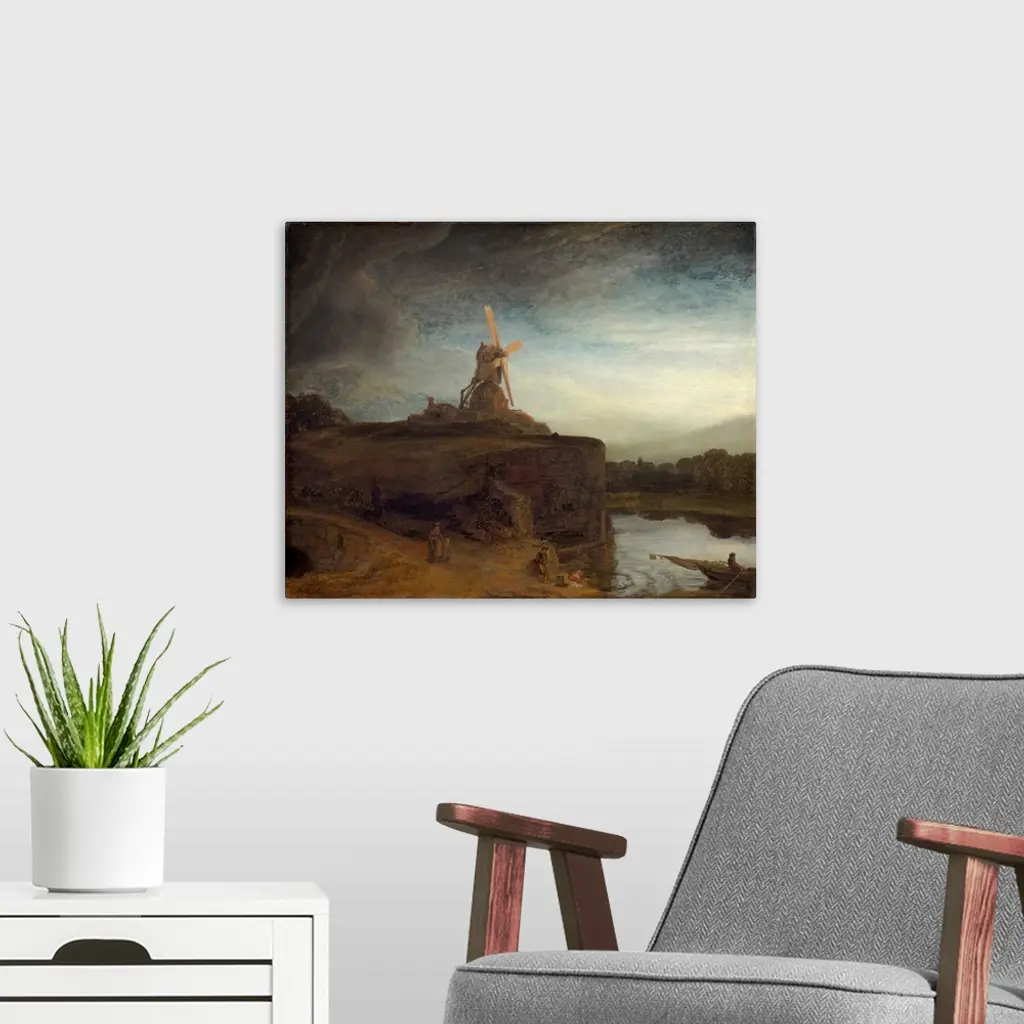 The Mill, by Rembrandt van Rijn, c. 1645-48, Dutch painting, oil on canvas. The bright sails of the blades draw the viewer?s eyes to the mill, which is perched on a bulwark under a dramatic sky. It is possible the scene is based on Rembrandt's father?s mi