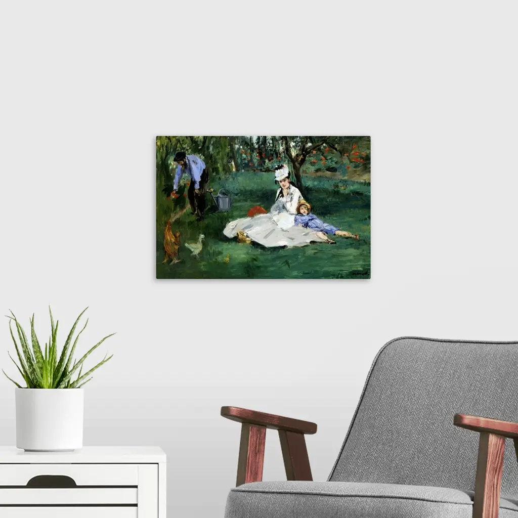 In July and August 1874 Manet vacationed at his family's house in Gennevilliers, just across the Seine from Monet at Argenteuil. The two painters saw each other often that summer, and on a number of occasions they were joined by Renoir. While Manet was painting this picture of Monet with his wife Camille and their son Jean, Monet painted Manet at his easel (location unknown). Renoir, who arrived just as Manet was beginning to work, borrowed paint, brushes, and canvas, positioned himself next to Manet, and painted?Madame Monet and Her Son(National Gallery of Art, Washington, D.C.).�