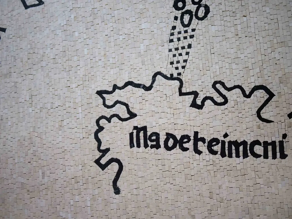 This intricate floor installation invites viewers to embark on a journey of exploration through time and space. The mosaic design, reminiscent of an ancient map, is adorned with intricate patterns and stylized figures, depicting geographical landmarks and historical routes. From bustling cities to treacherous seas, each element of the mosaic tells a story of human migration and discovery. The installation's vibrant colors, ranging from earthy browns and greens to shimmering blues and golds, create a visual tapestry that is both captivating and informative. As visitors explore this unique artwork, they are transported to different eras and continents, gaining a deeper understanding of our world's history