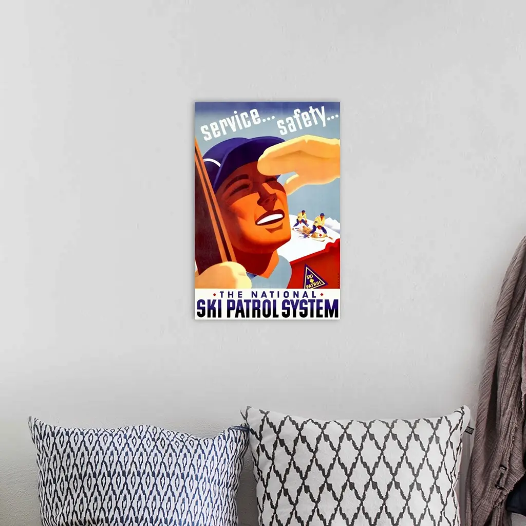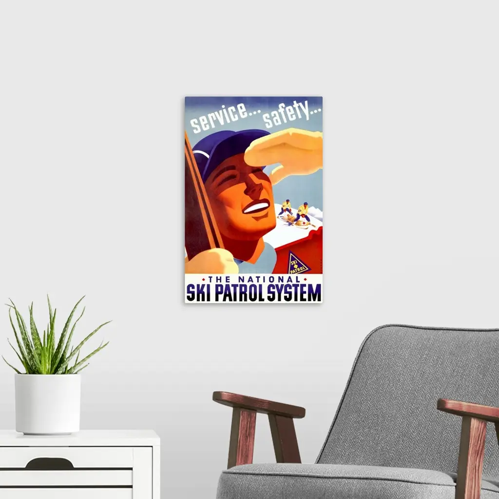 Vertical, large vintage advertisement for The National Ski Patrol System, a close up of a ski patrol member looks off to the distance for skiers needing assistance, while two members in the background tend to an injured skier on a stretcher. Text at the top of the image reads "service...safety...".
