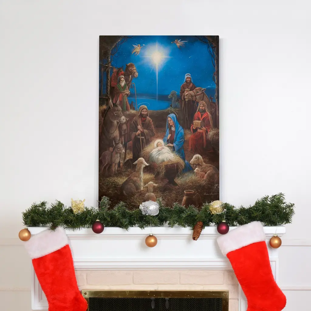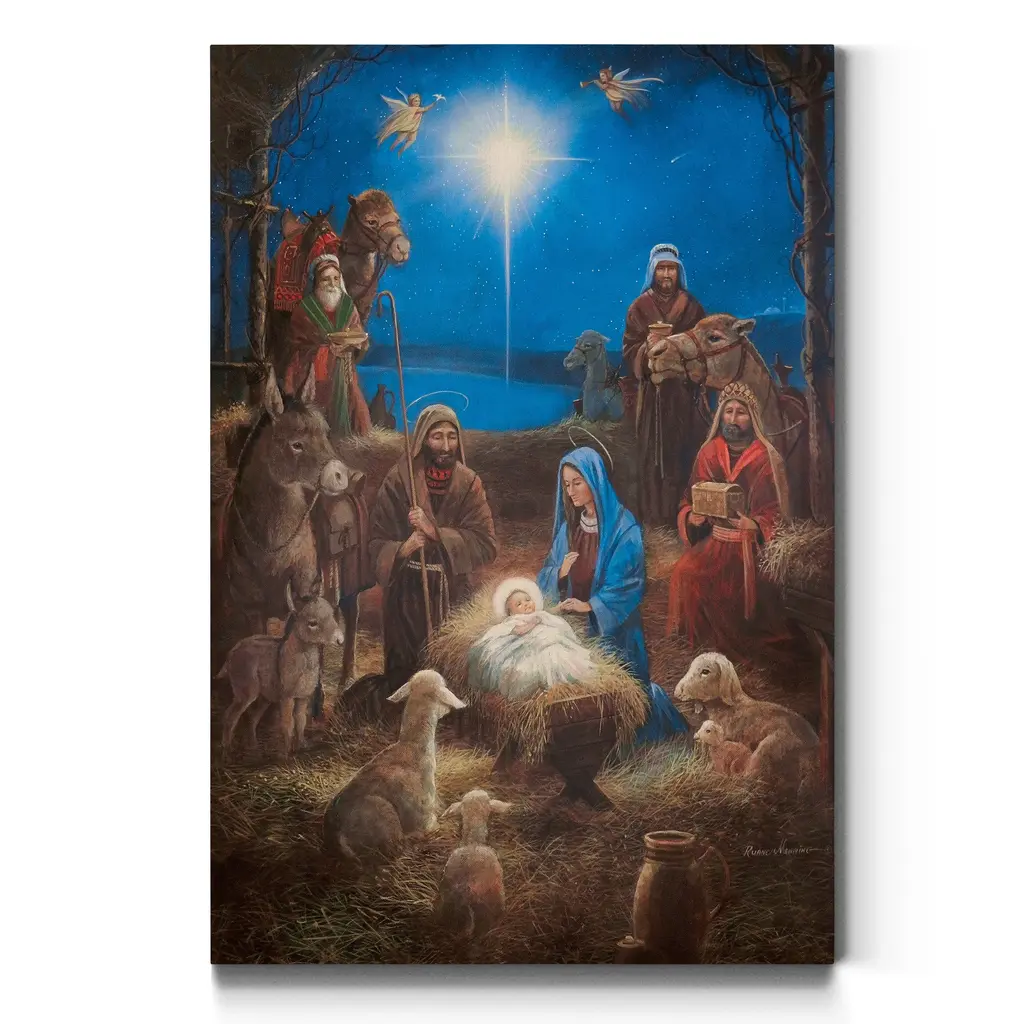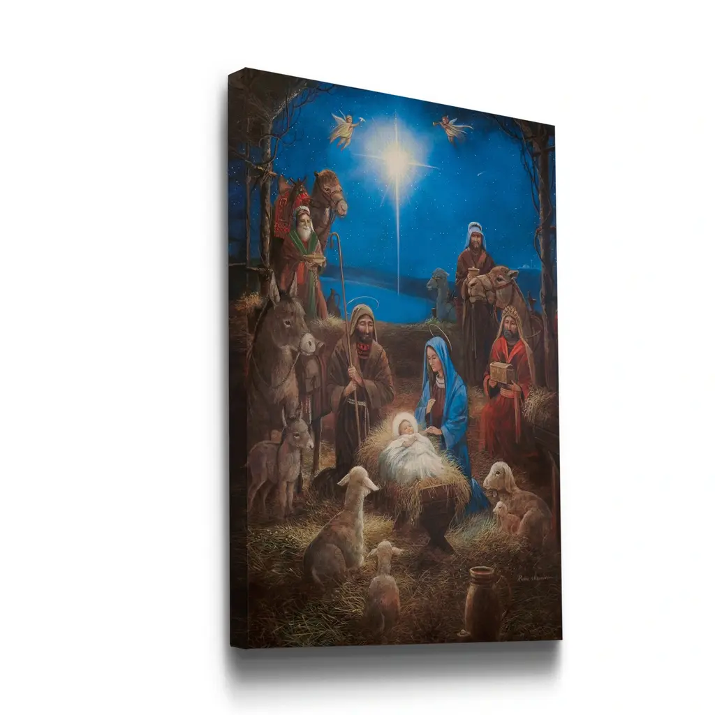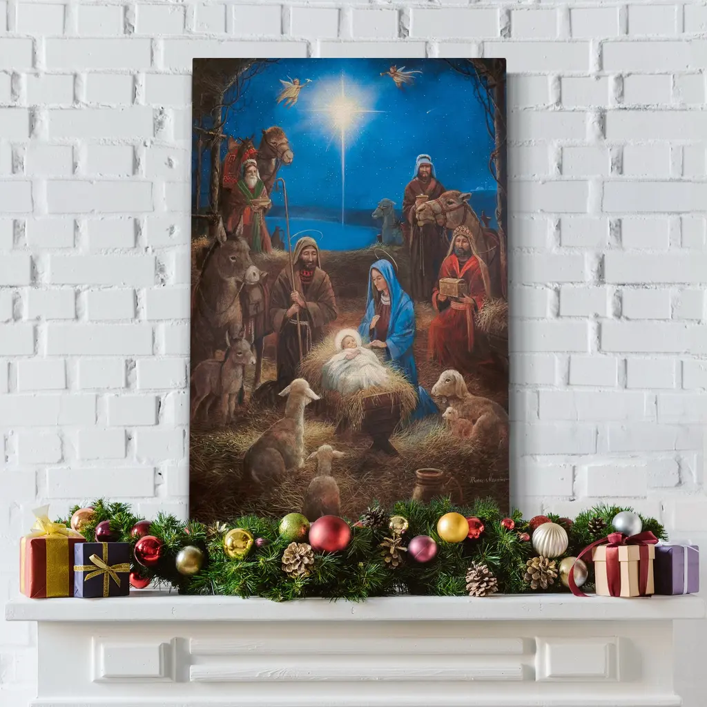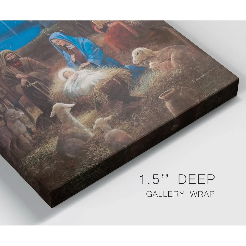 The Nativity-Premium Gallery Wrapped Canvas - Ready to Hang A premium hand stretched gallery wrapped canvas print created to last. Featuring a beveled a solid wood stretcher bar, each piece comes ready to hand 5 SIZES AVAILABLE 8''X12'' - Overall Size 16''x20'' - Overall Size 18''x27'' - Overall Size 24''x36'' - Overall Size 32''x48'' - Overall Size Each piece is made to order. Built to Last Each piece comes ready to hang Solid wood stretcher Fade and Water resistant Made domestically