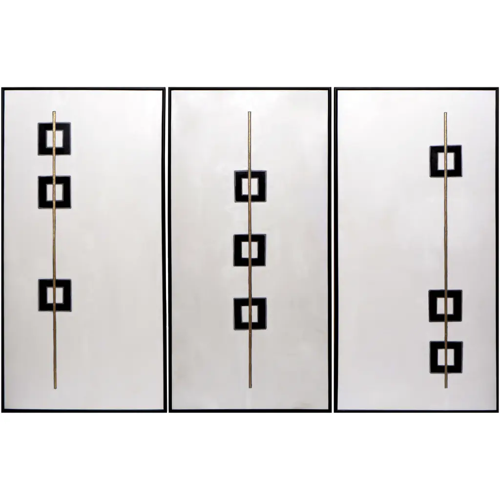 This striking triptych in black, white and gold features a continuous graphic pattern that leads from one painting to the next. Features a gold finished wood floater frame. Each artwork is hand-painted and will feature slight variations that make every piece unique.