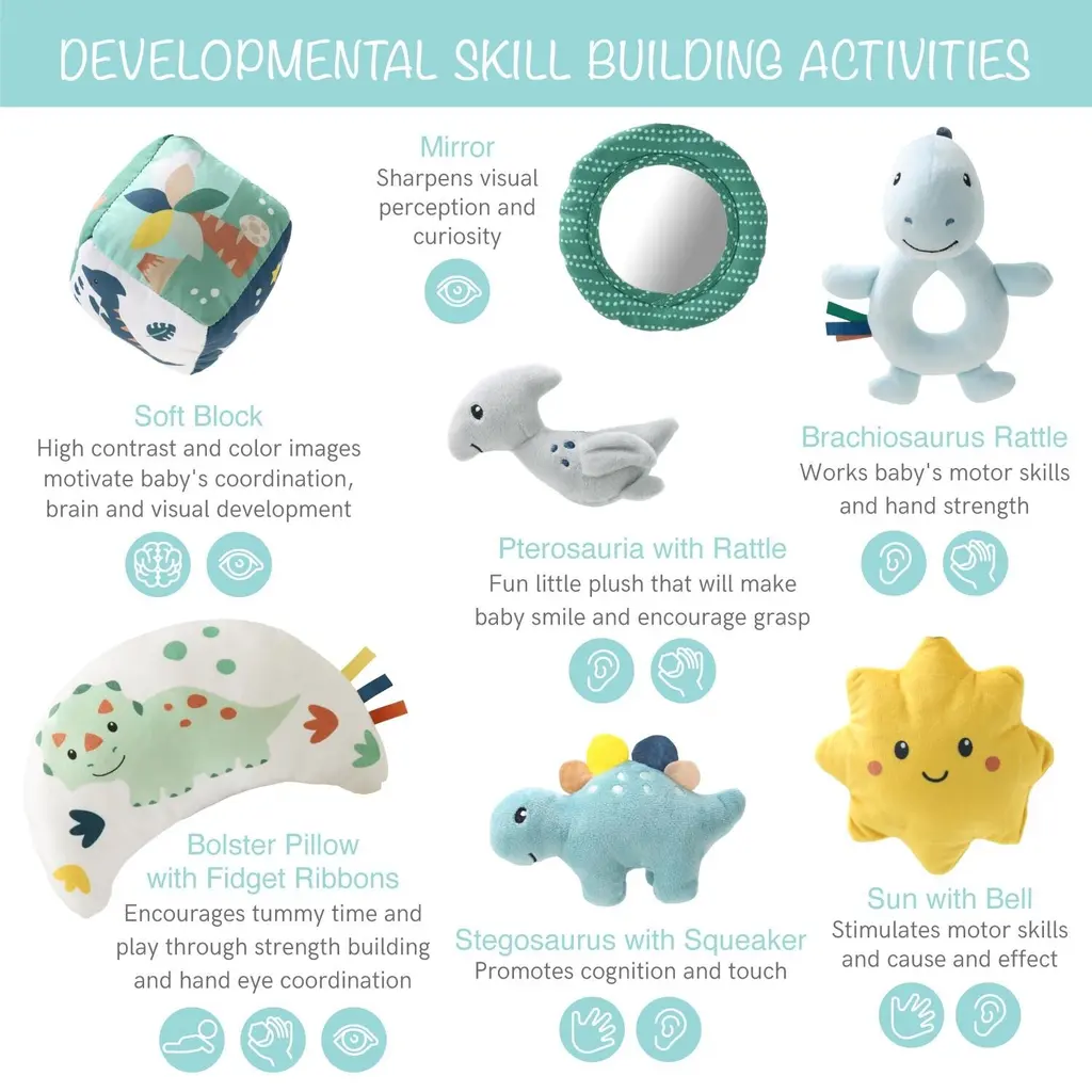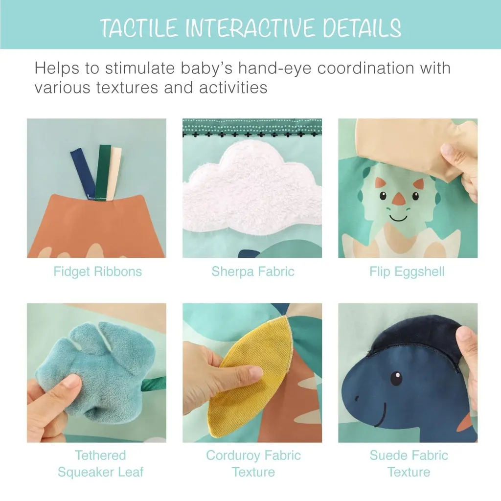 The 7-in-1 Dino Play Gym by The Peanutshell is a versatile activity center, designed to captivate your little one. Featuring adorable dinosaur-themed artwork with a prehistoric array of sounds, shapes, and textures sure to engage baby's attention for hours of educational play. This multi-function activity mat supports motor skills, sensory exploration, and cognitive development with thoughtful interactive features such as a mirror, plush dino toys, rattle, crinkle, bell, fidget ribbons, and pillow. From tummy time to sitting up play stages, its foldable design makes it travel-friendly and space-saving. The soft, machine-washable fabric ensures simple maintenance while a non-skid backing guarantees it stays in place for endless hours.