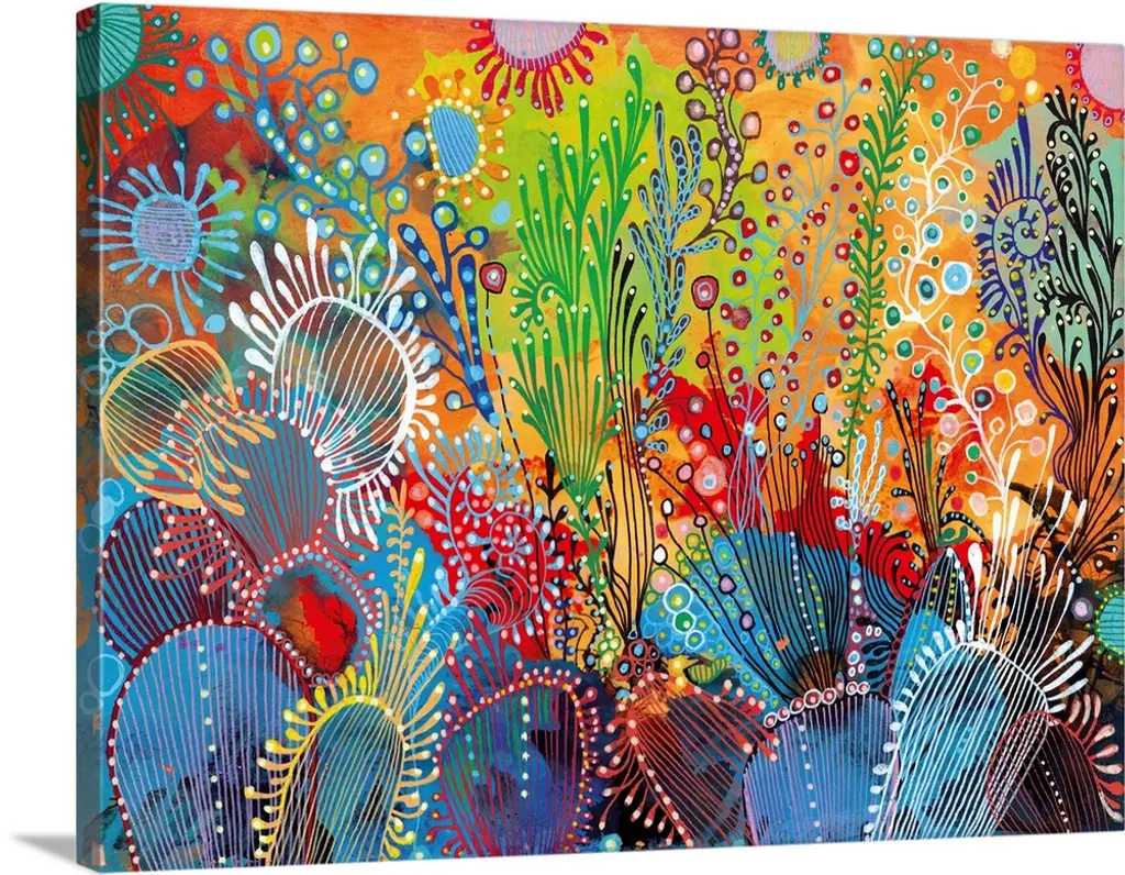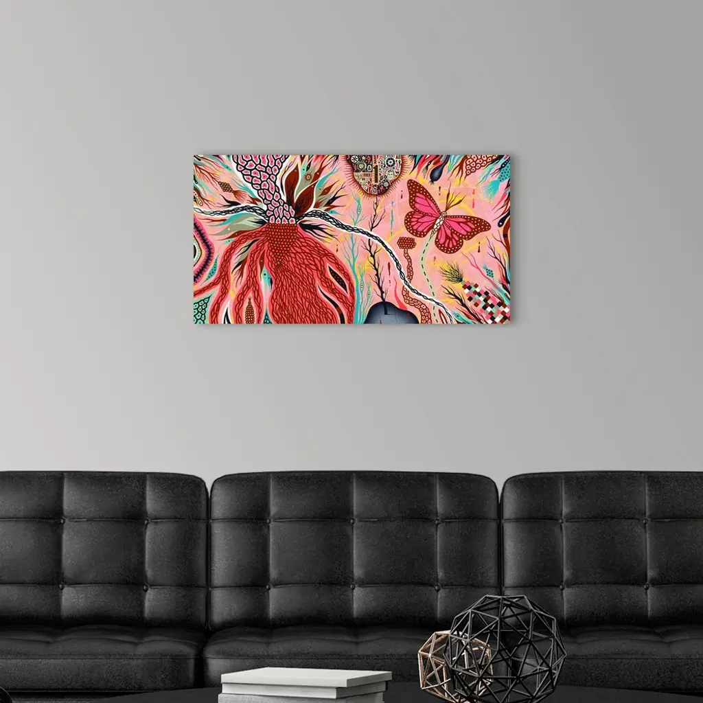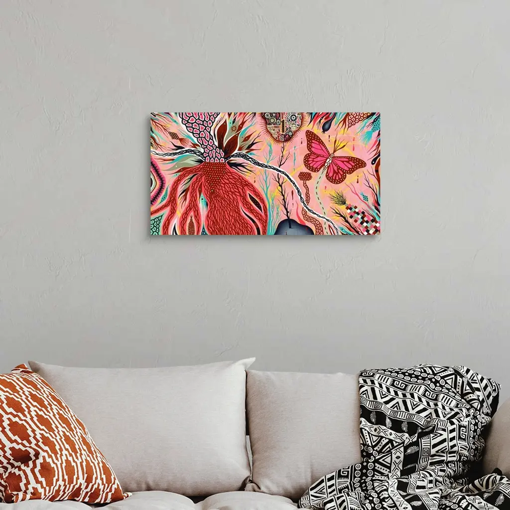 Abstract contemporary artwork in shades of pink and turquoise with a butterfly and floral shapes.
