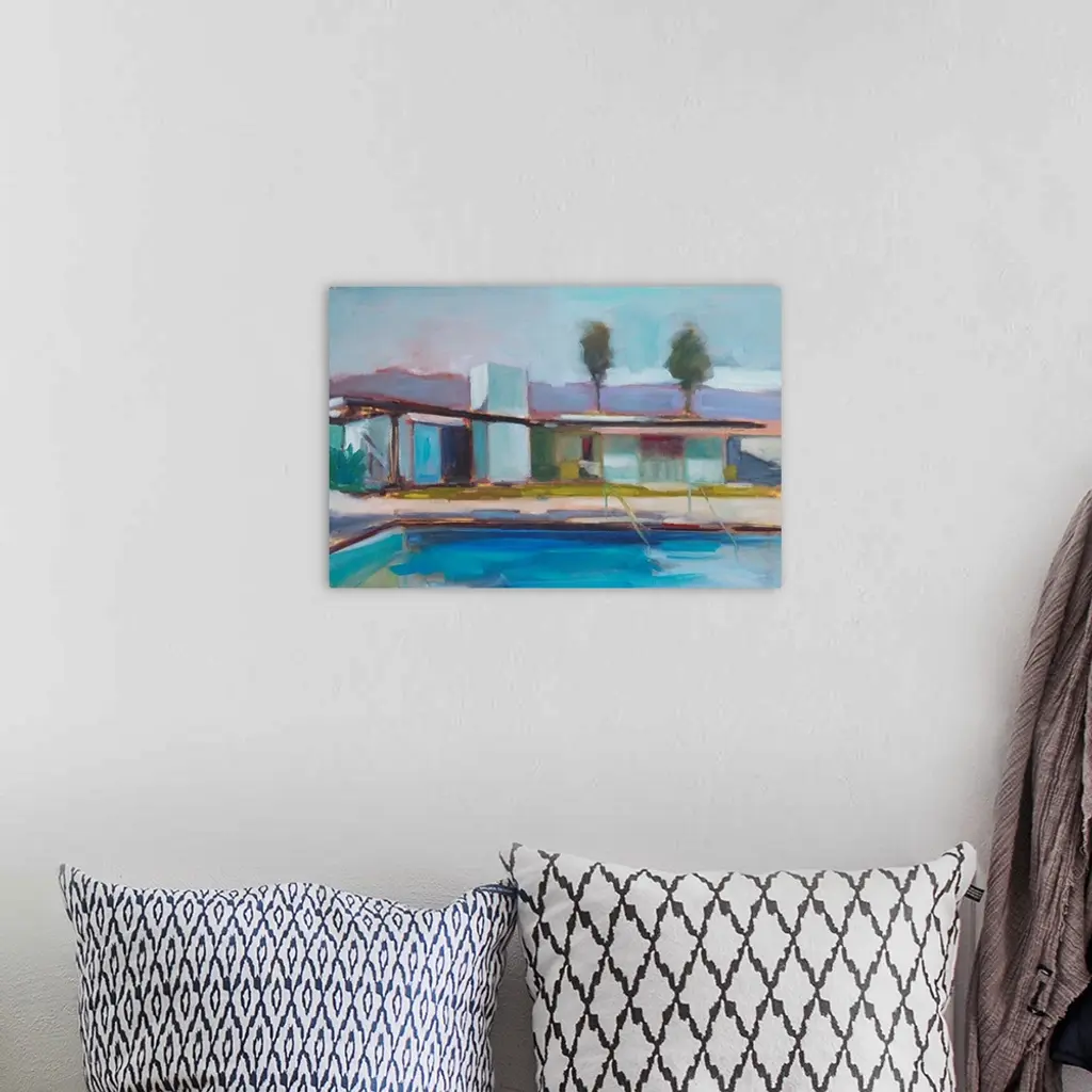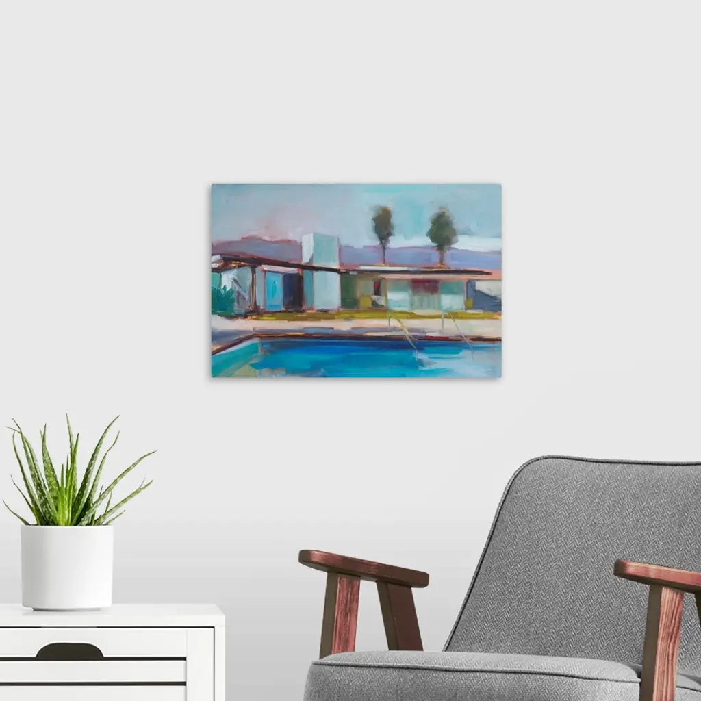 Contemporary painting of a modern home with a swimming pool in the foreground.