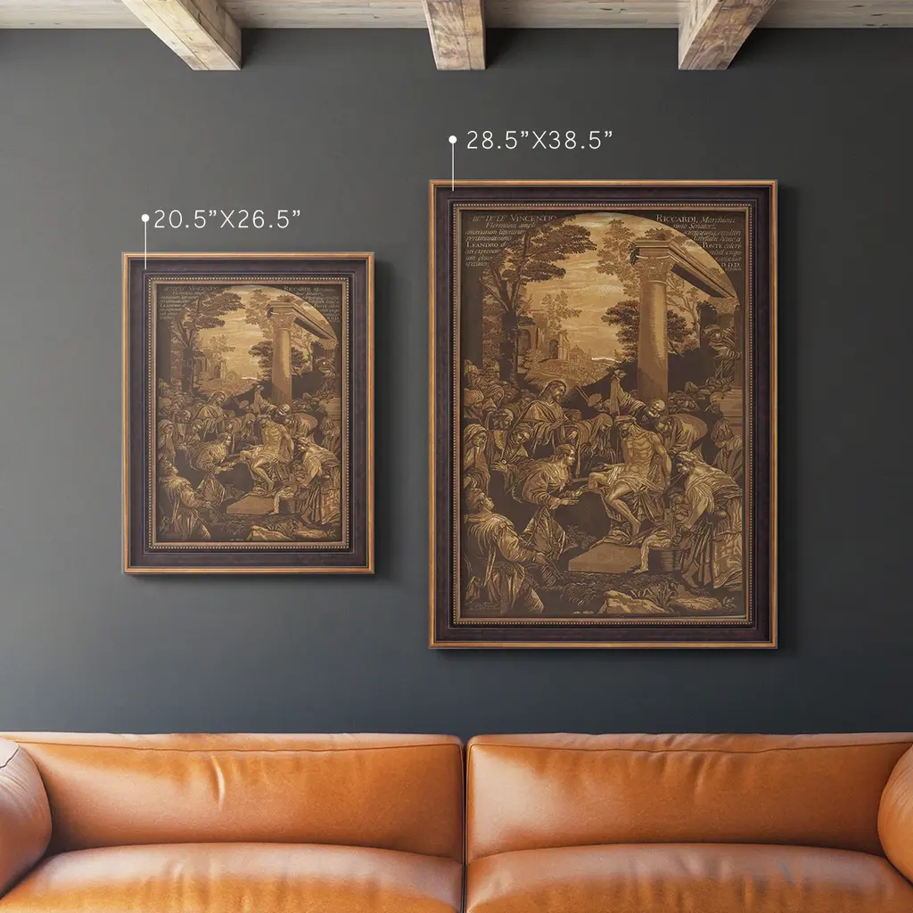 The Raising of Lazarus Premium Framed Canvas- Ready to Hang A Premium Framed Canvas created to last. Framed in distressed wood and available in an array of sizes and colors Featuring a beveled a solid wood stretcher bar, each piece comes ready to hand 3 SIZES AVAILABLE 16''X20'' - Overall Size 18'X27'' - Overall Size 24''x36'' - Overall Size Each piece is made to order. Each piece comes with hanging hardware. Made in the USA Ready to Hang Giclee Paper Print Acrylic Glass Beveled Matt Board