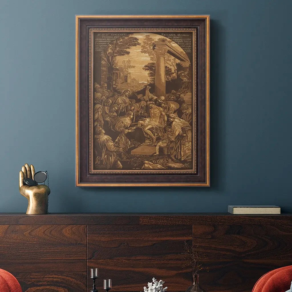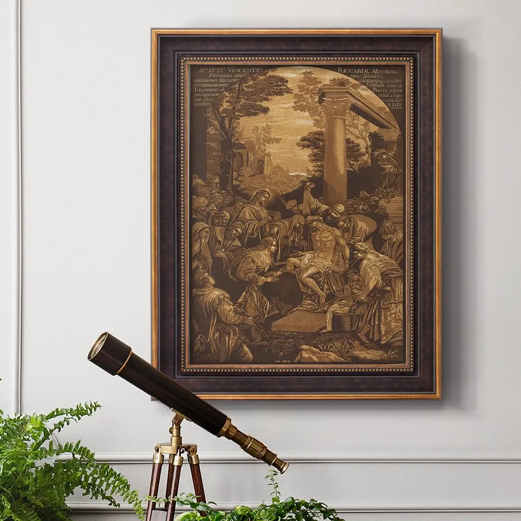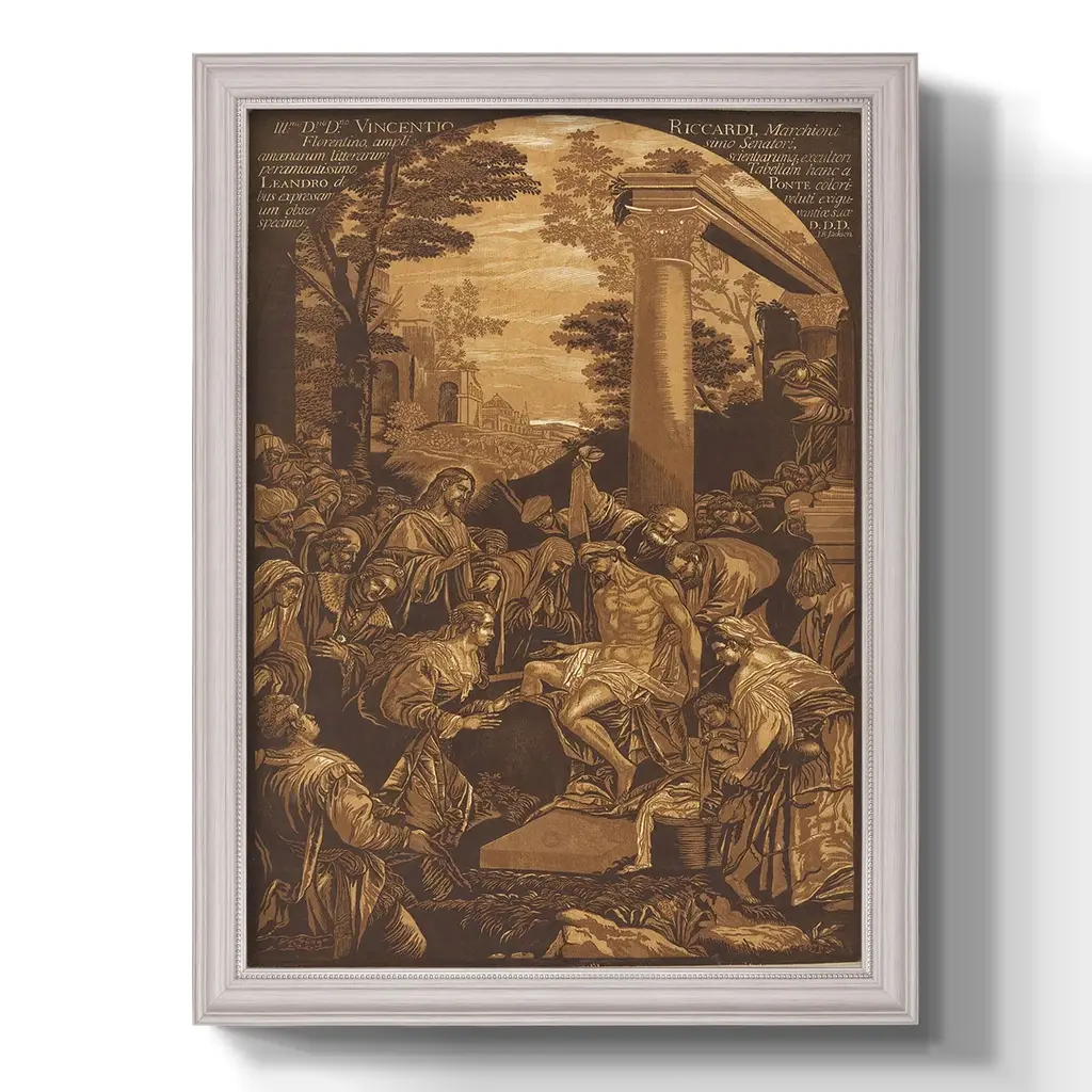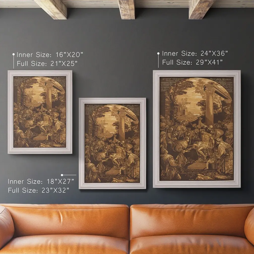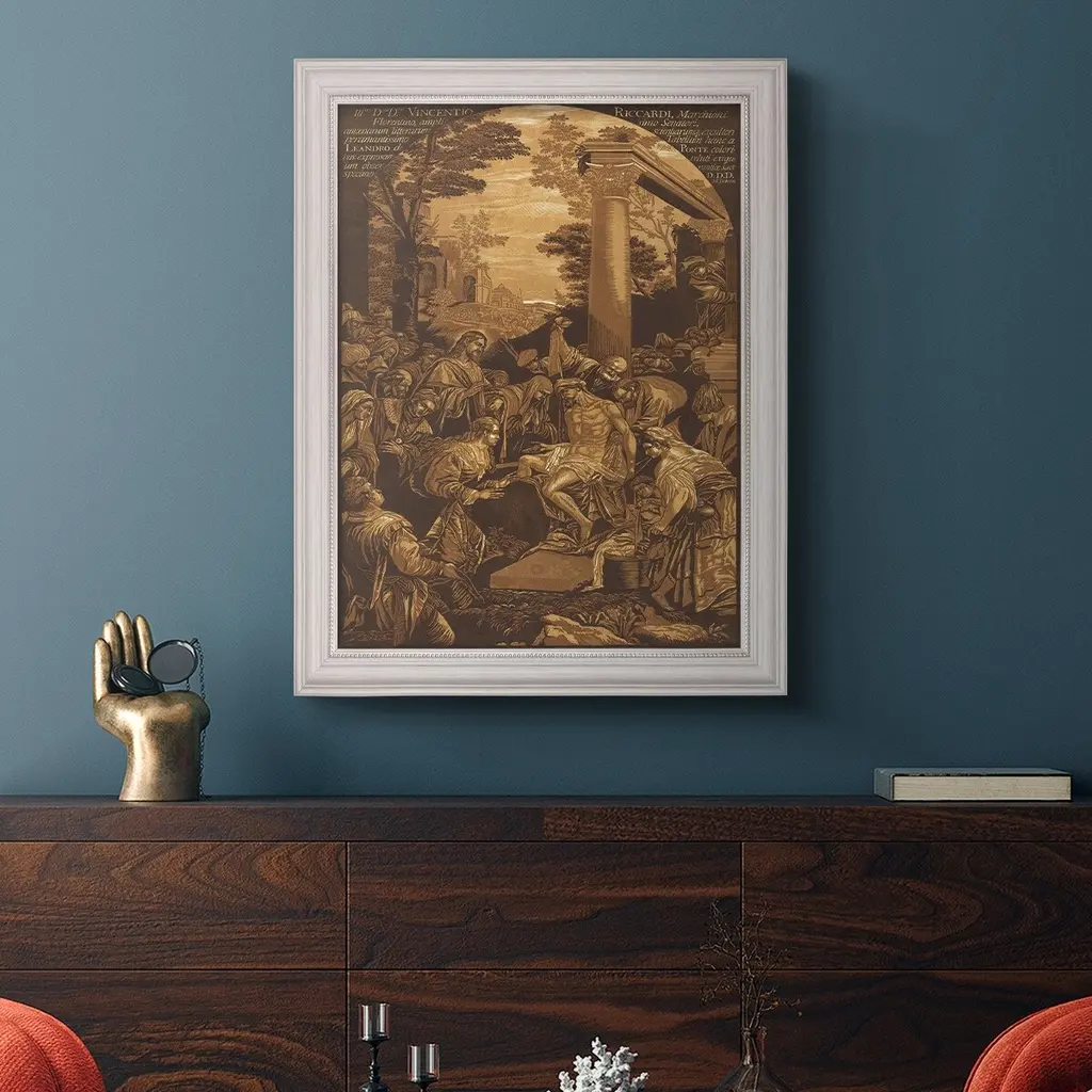 The Raising of Lazarus Premium Framed Canvas- Ready to Hang A Premium Framed Canvas created to last. Framed in distressed wood and available in an array of sizes and colors Featuring a beveled a solid wood stretcher bar, each piece comes ready to hand 3 SIZES AVAILABLE 16''X20'' - Overall Size 18'X27'' - Overall Size 24''x36'' - Overall Size Each piece is made to order. Each piece comes with hanging hardware. Made in the USA Ready to Hang Giclee Paper Print Acrylic Glass Beveled Matt Board