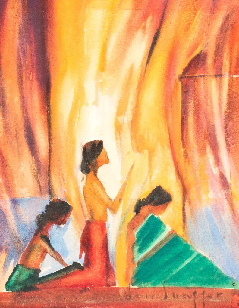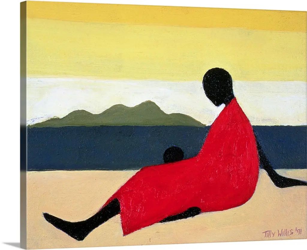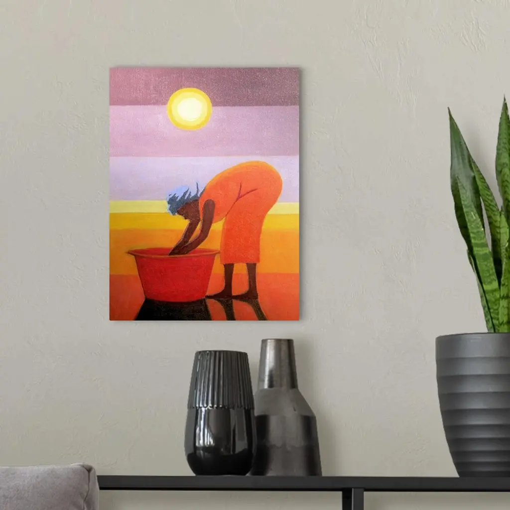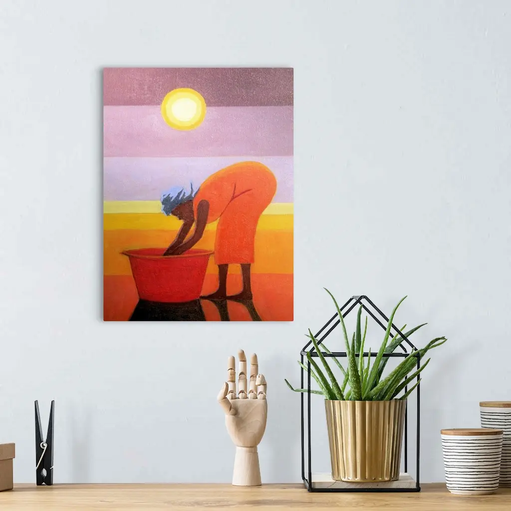 Big, vertical contemporary painting of an African American woman in a dress, bent over with her hands in a large wash tub, as the bright sun shines down on her. The landscape is painted in multicolored horizontal stripes.