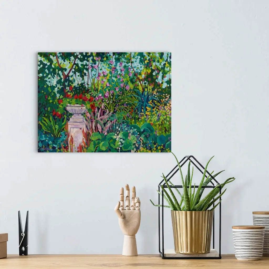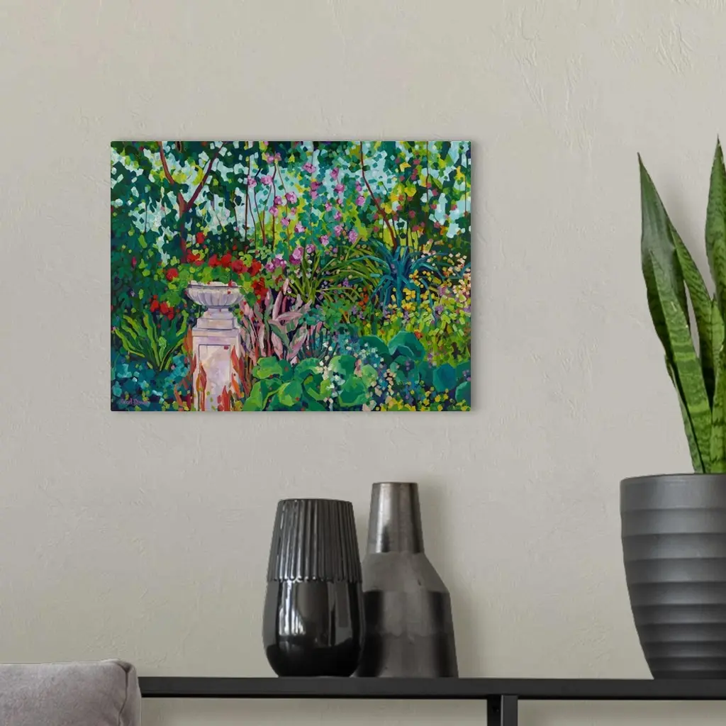 Impressionist painting of urn planted with red geranium in garden with trees, camellias, and many colorful flowers.