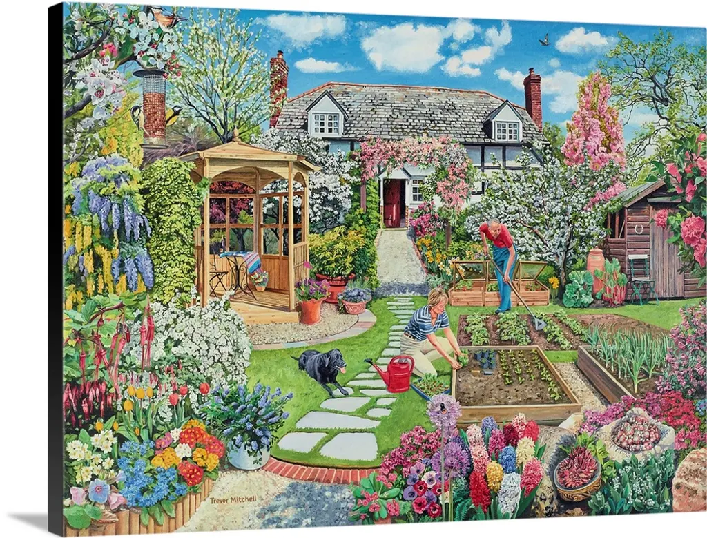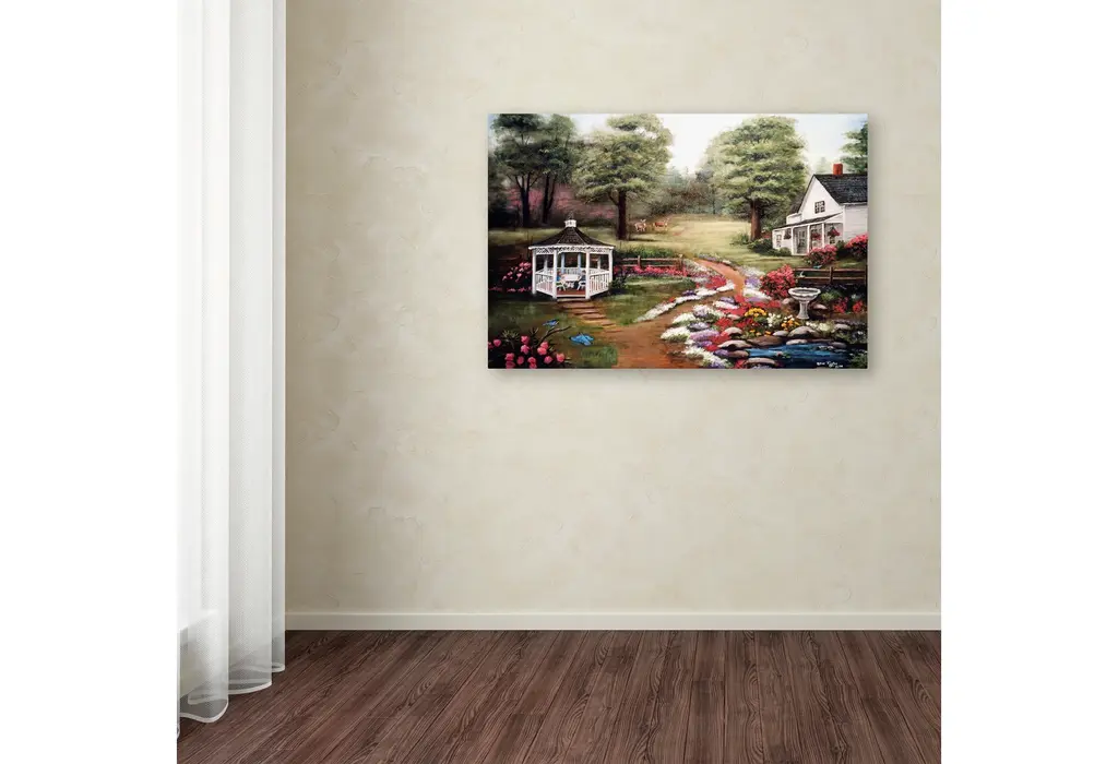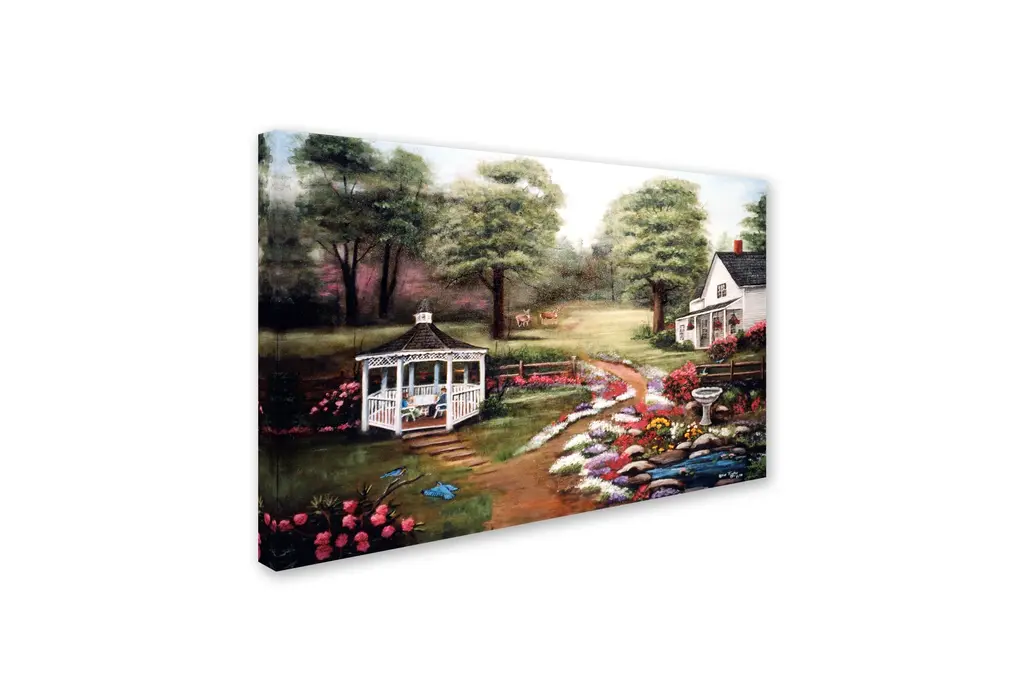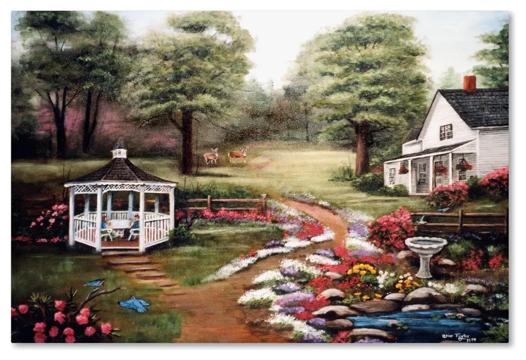 Artist: Arie Reinhardt TaylorSubject: LandscapeStyle: Cottage / CountryProduct Type: Gallery-Wrapped Canvas ArtMade in USAThis ready to hang, gallery-wrapped art piece features a garden outside of a home with a stone path leading to a pond.Arie loves to paint memories of her childhood on the farm in the 20s and 30s western North Carolina. She started painting in the 1950s and is proficient in oils and watercolor. Over the years she had painted more than 500 paintings. She is a renowned artist in the Folk Art field.Giclee (jee-clay) is an advanced printmaking process for creating high quality fine art reproductions. The attainable excellence that Giclee printmaking affords makes the reproduction virtually indistinguishable from the original piece. The result is wide acceptance of Giclee by galleries, museums, and private collectors. Gallery wrap is a method of stretching an artist's canvas so that the canvas wraps around the sides and is secured a hidden, wooden frame. This method of stretching and preparing a canvas allows for a frameless presentation of the finished painting.Materials: Canvas: 100% Cotton, Stretcher Bars: Poplar