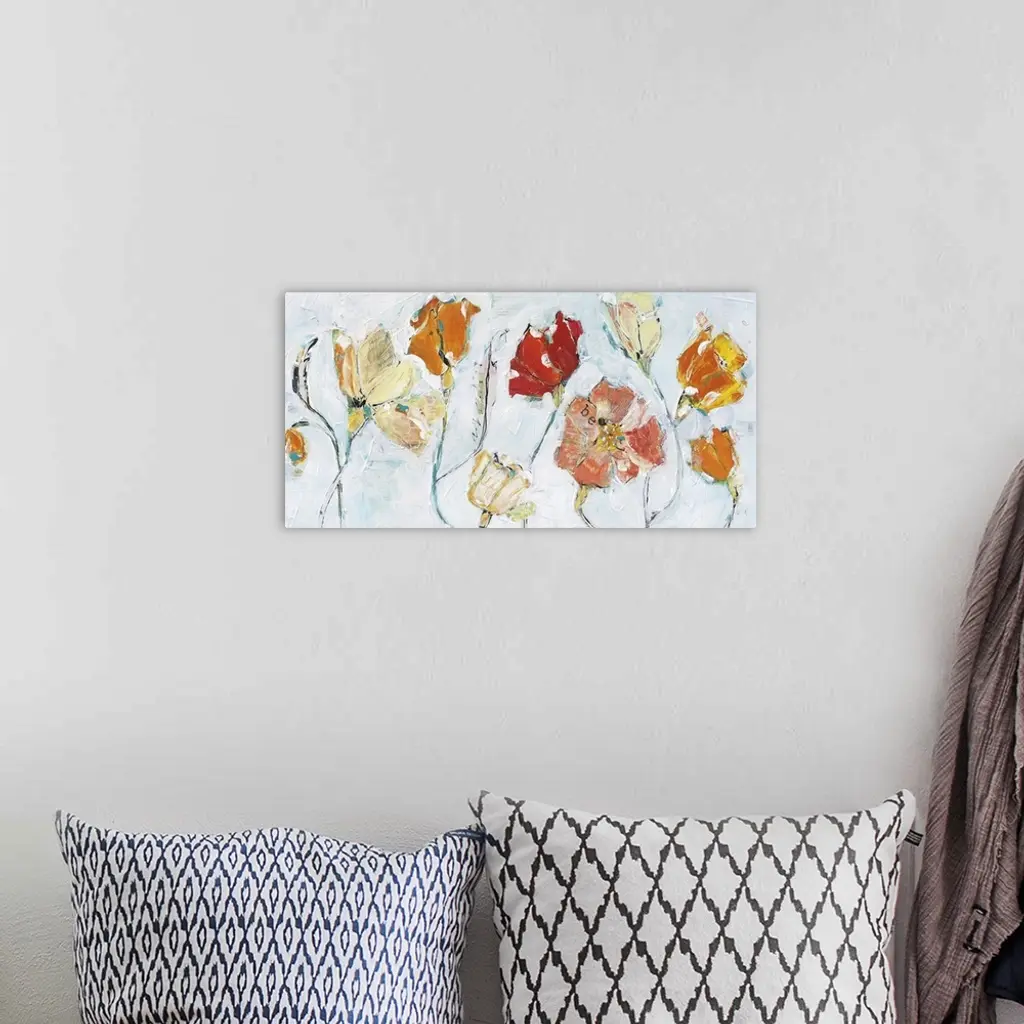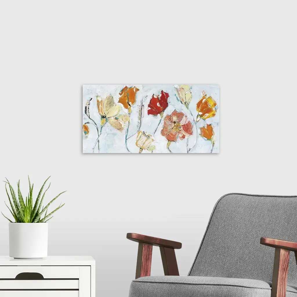 Contemporary painting of muted red an orange flowers against a pale blue background.