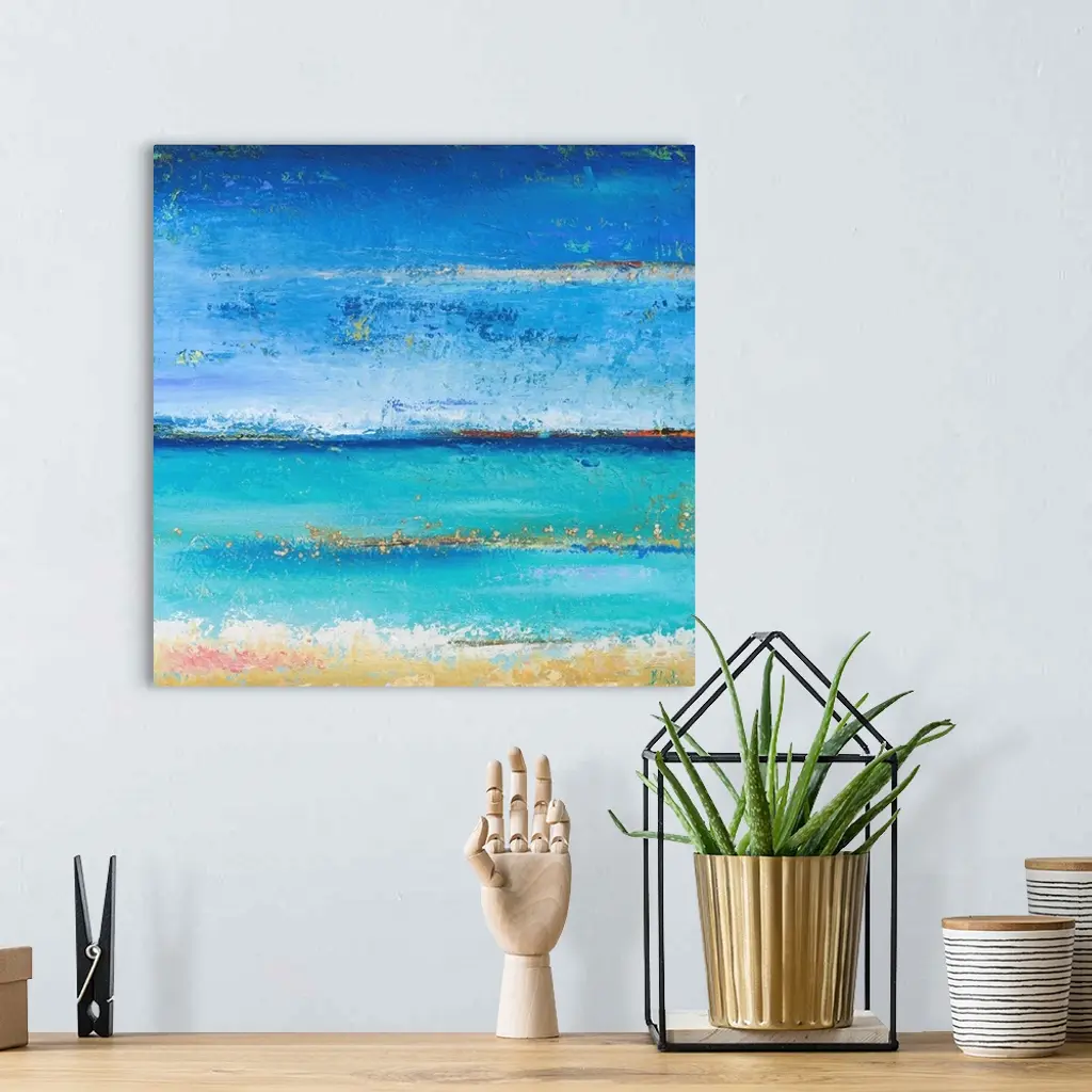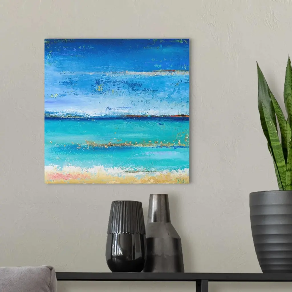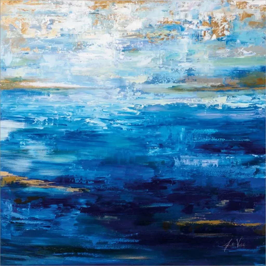Abstract painting of a blue colorscape resembling the ocean from a beach view.