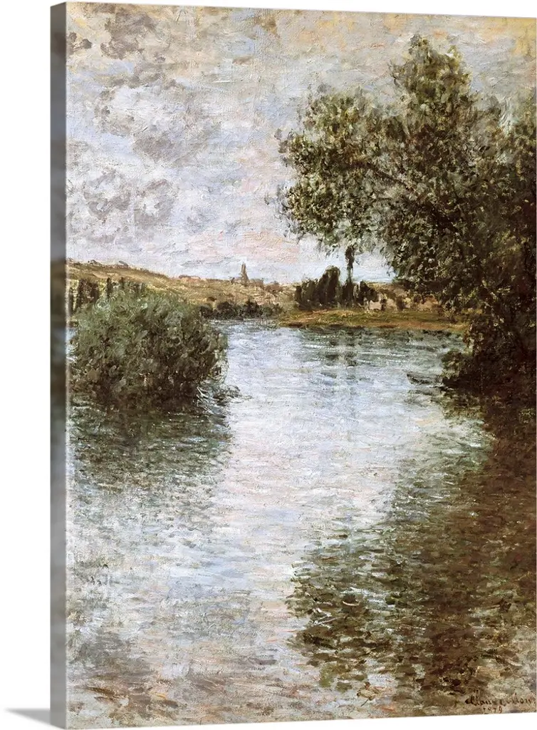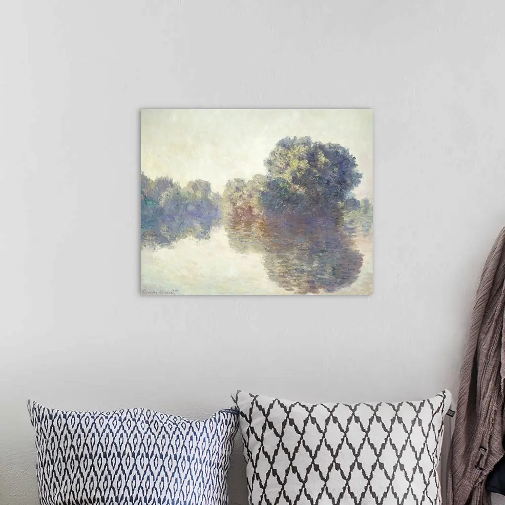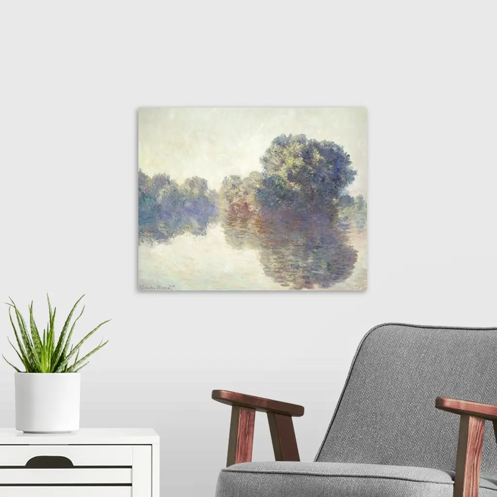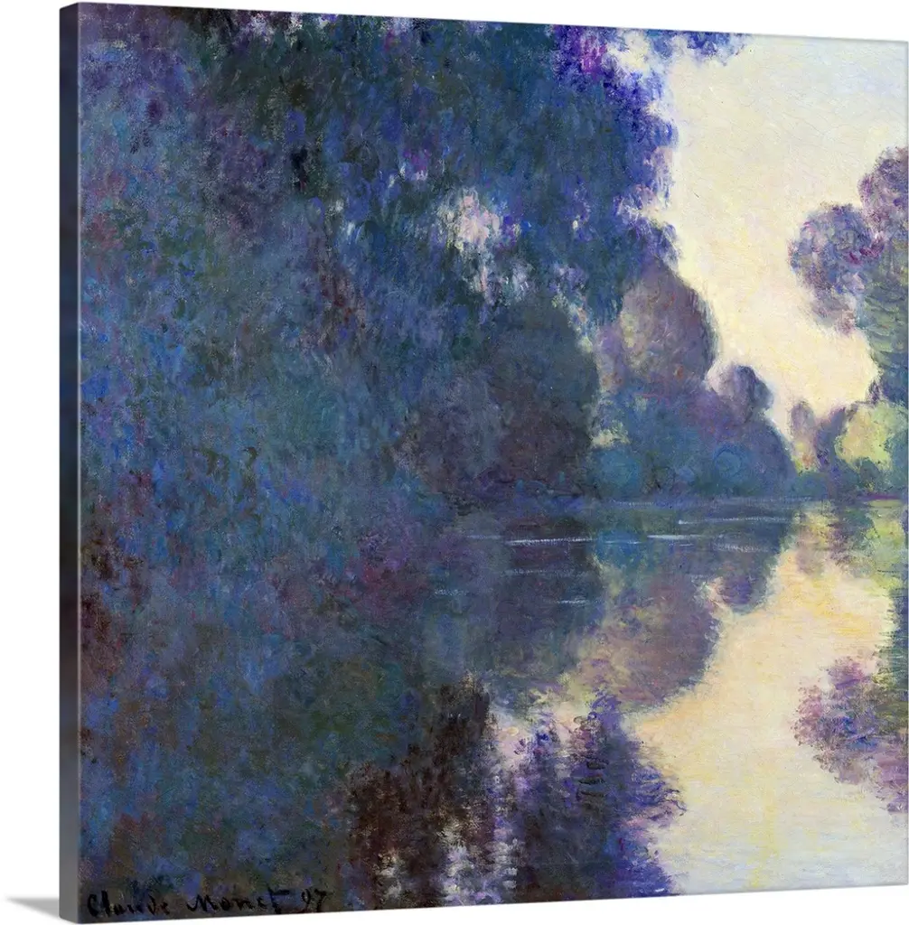 The Seine at Giverny, by Claude Monet, 1897, French impressionist painting, oil on canvas. In 1896, Monet set up a studio on flat-bottomed boat tied up near the bank to paint the Seine near his home at Giverny