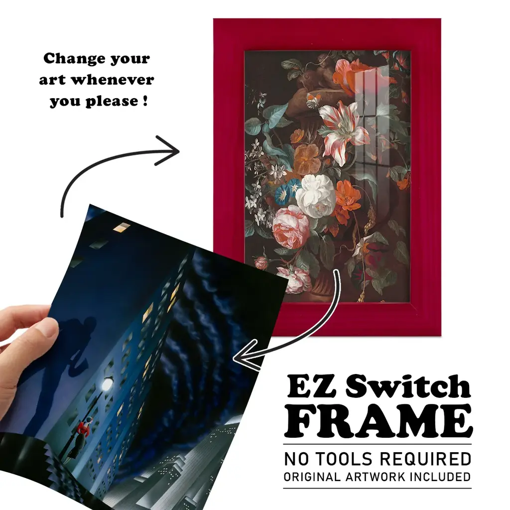 The Shadow -EZ SWITCH Framed Print w/glass-Cherry Red A delightful, framed print. Featuring a solid wood frame with real wood glass. This premium print is giclee quality. In addition, every frame features a removable back and table top stand. This allows you to change your art in the future or to just stand the art on a table for a new look. We are sure you'll enjoy our new series of EZ SWITCH Framed Art. Solid Wood Frame Real Glass Removable / Replaceable Art Built in Tabletop Stand Sizes range from 4x6 up to 12x15 - buy just one or pair them up as sets as you see fit.