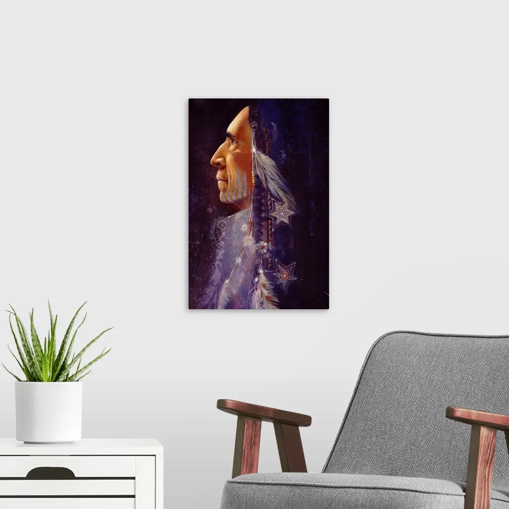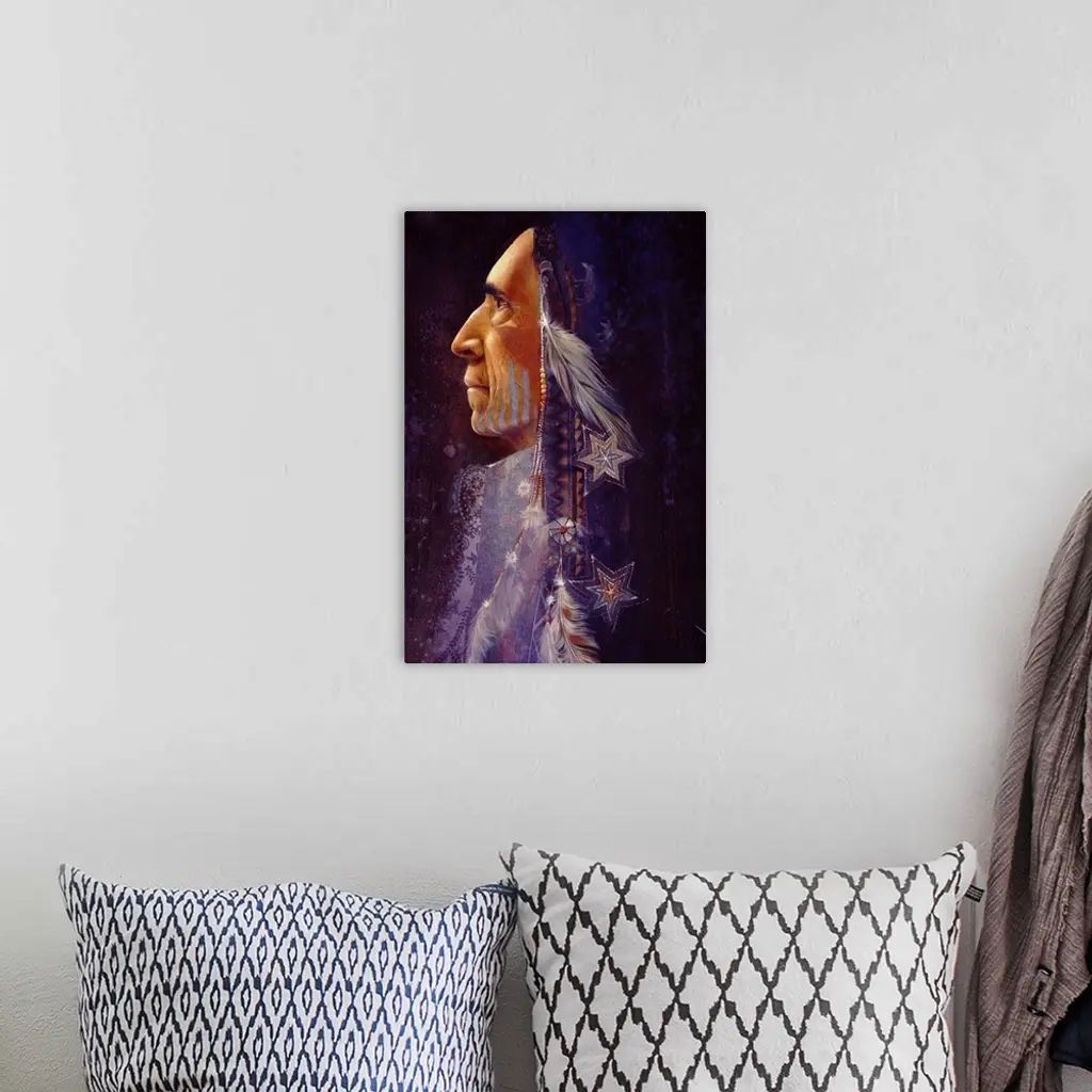 A contemporary painting of a Native American man in profile with long braids of feathers and beads streaming down.
