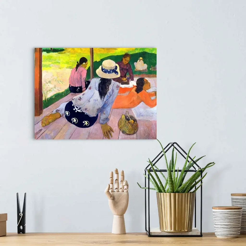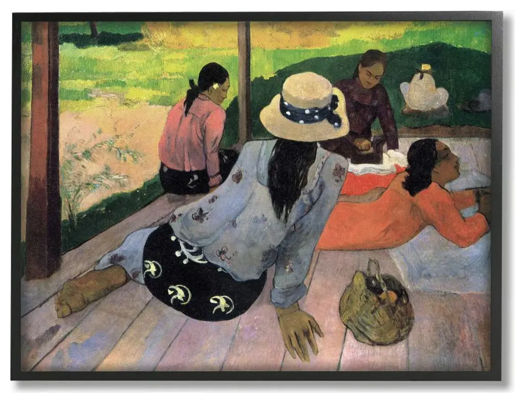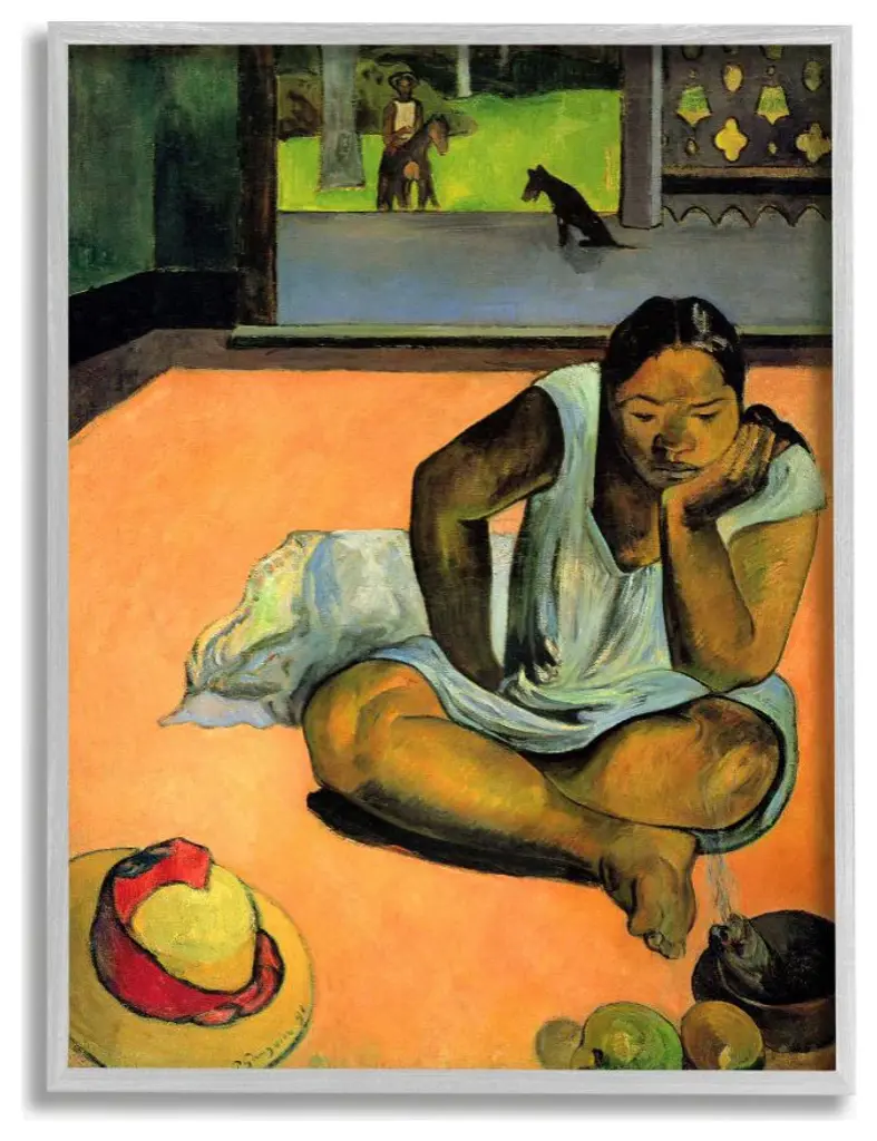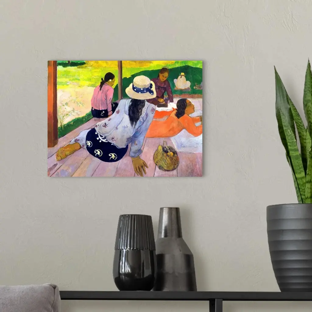 The unaffected grace and communal ease of Tahitian women impressed Gauguin enormously. The artist worked on this painting over an extended period, incorporating numerous changes. The skirt of the woman in the foreground, for example, was originally bright red; there was a dog in the position now occupied by the basket at lower right; and the woman seated at the left edge of the porch was previously situated further to the left.