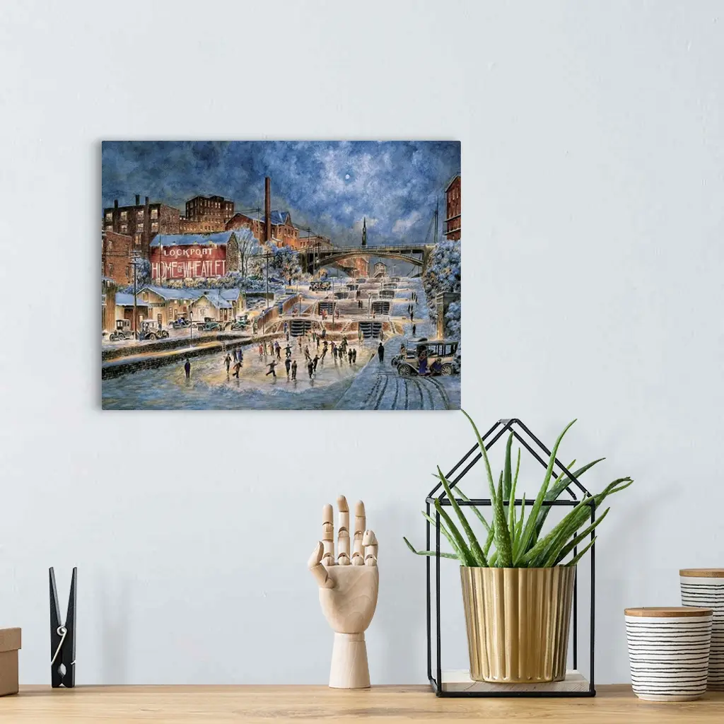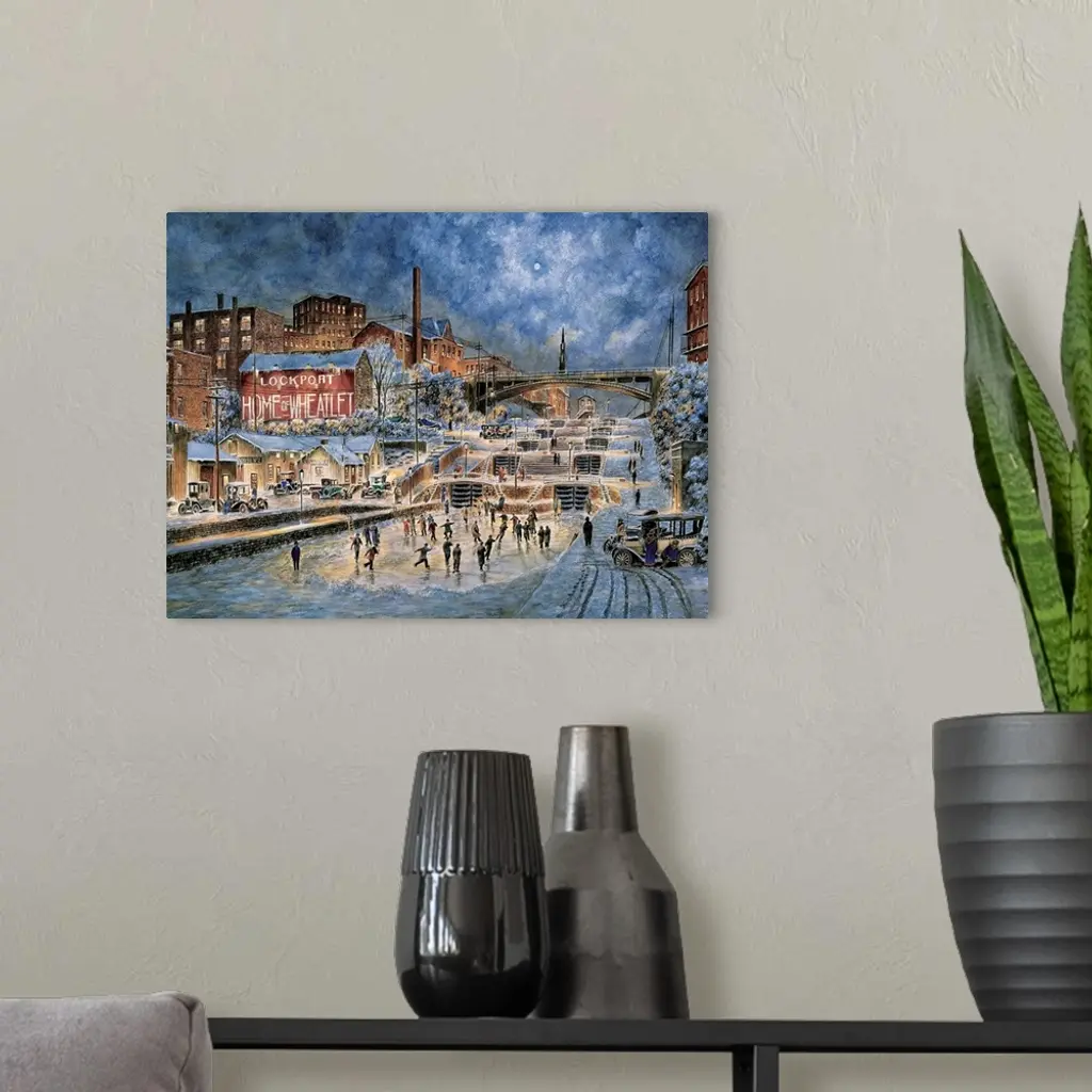 Contemporary painting of an idyllic winter scene with people ice skating at night.
