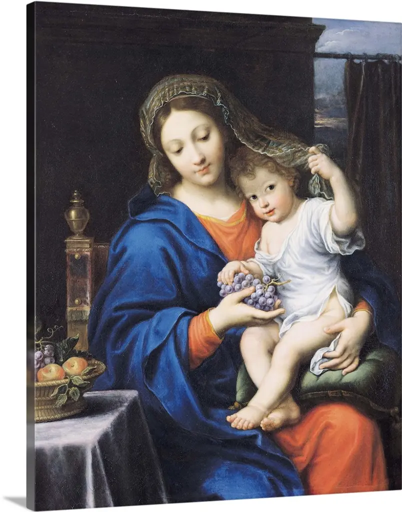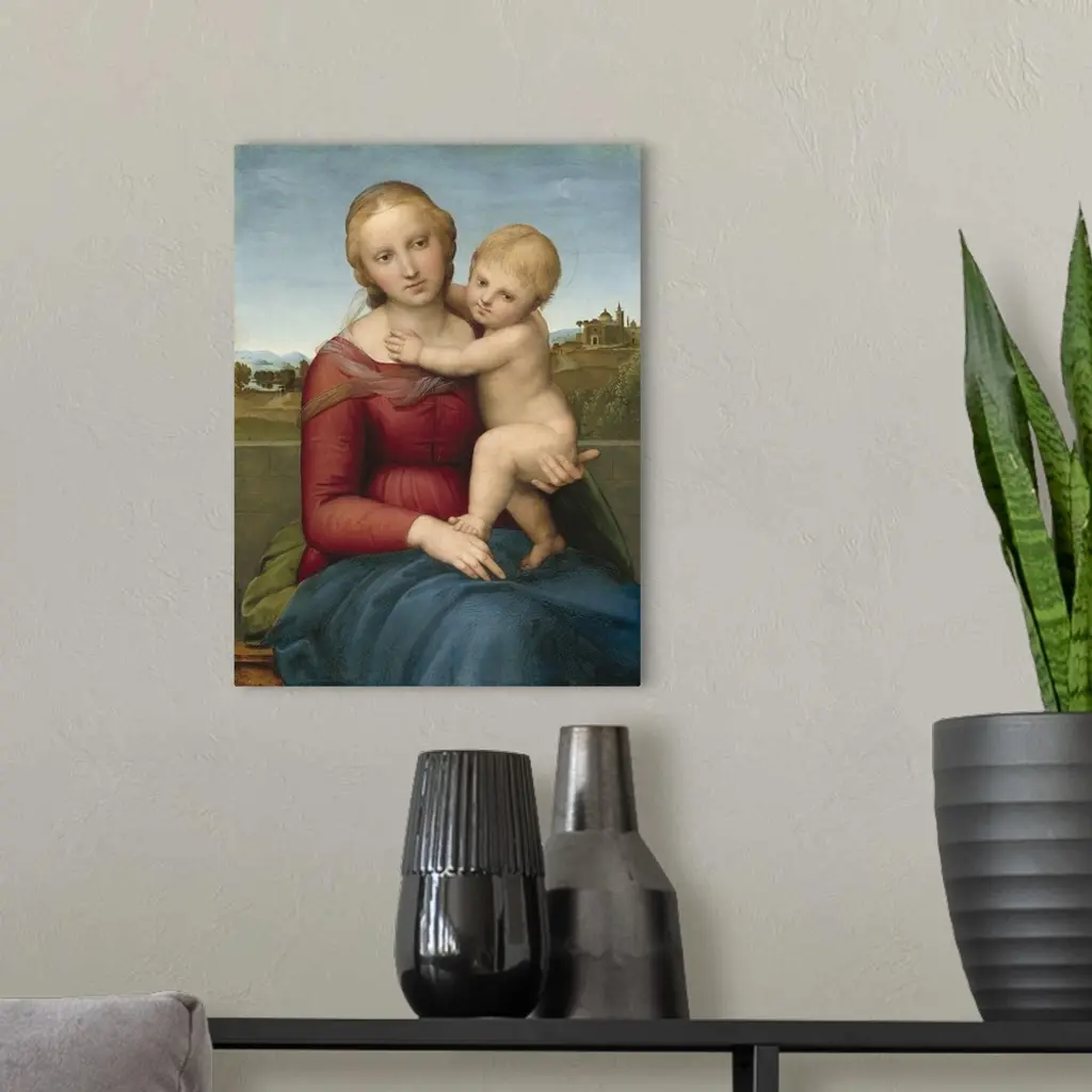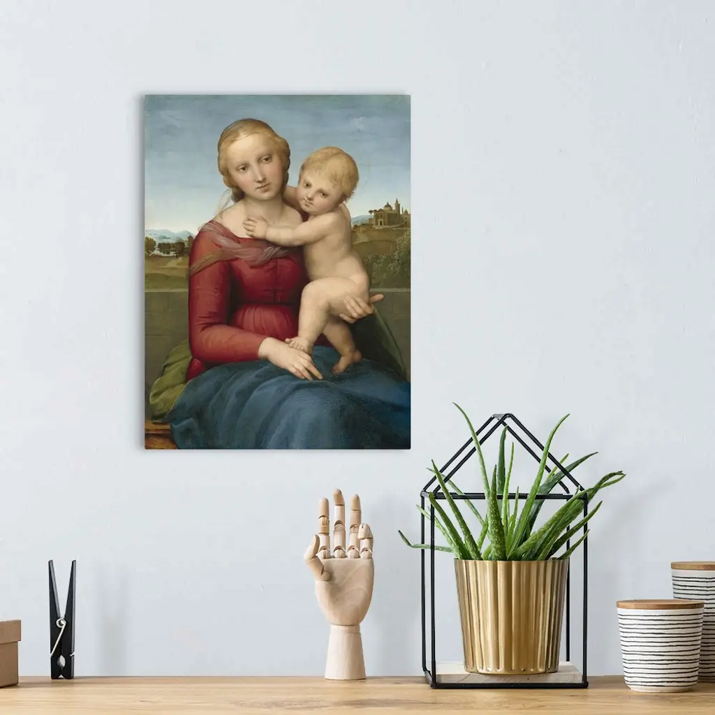 The Small Cowper Madonna, by Raphael, c. 1505, Italian Renaissance painting, oil on panel. Raphael painted this classic Renaissance Madonna and Child in Florence. The figures' interlocked pose shows the influence of Leonardo Da Vinci
