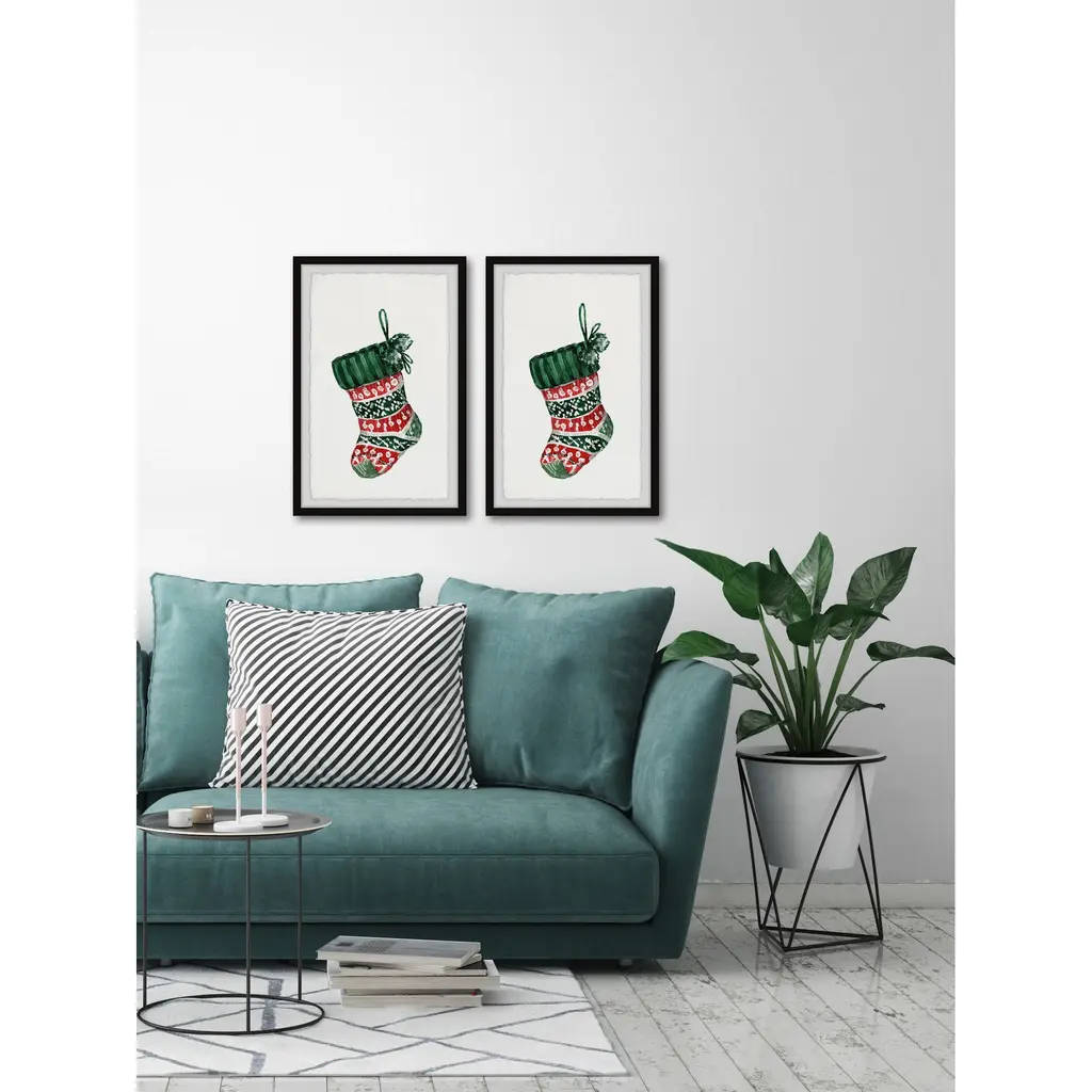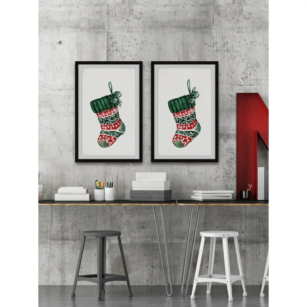Spread the holiday cheer with these watercolor painting prints on display. This festive duo features two matching holiday stockings that showcase a red, white, and green pattern. Proudly printed in the USA, this piece is printed on high quality archive paper and professionally hand-framed. With wall-mounting hooks included, this artful accent is ready to hang up as soon as it reaches your front door. • Size 16x12 includes (2) panels of 8"x12"; Size 24x18 includes (2) panels of 12"x18"; Size 32x24 includes (2) panels of 16"x24"; Size 40x30 includes (2) panels of 20"x30"; Size 48x36 includes (2) panels of 24"x36"; Size 60x45 includes (2) panels of 30"x45" • Top quality Giclee print on high resolution Archive Paper • Hand cut deckled edges • High quality durable non-warping frame • Finished under shatter resistant plexiglass • Arrives ready to hang • Includes a certificate of authenticity • Printed in the USA