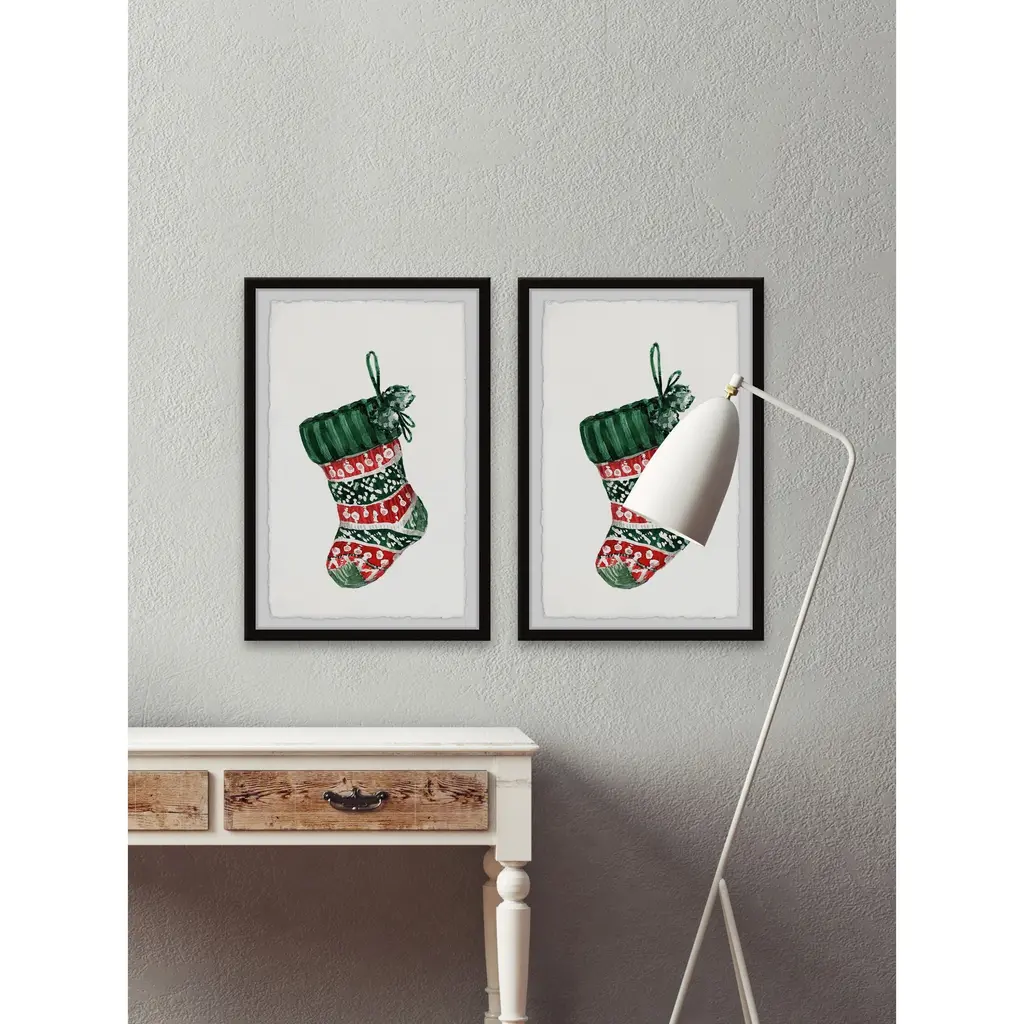 Spread the holiday cheer with these watercolor painting prints on display. This festive duo features two matching holiday stockings that showcase a red, white, and green pattern. Proudly printed in the USA, this piece is printed on high quality archive paper and professionally hand-framed. With wall-mounting hooks included, this artful accent is ready to hang up as soon as it reaches your front door. • Size 16x12 includes (2) panels of 8"x12"; Size 24x18 includes (2) panels of 12"x18"; Size 32x24 includes (2) panels of 16"x24"; Size 40x30 includes (2) panels of 20"x30"; Size 48x36 includes (2) panels of 24"x36"; Size 60x45 includes (2) panels of 30"x45" • Top quality Giclee print on high resolution Archive Paper • Hand cut deckled edges • High quality durable non-warping frame • Finished under shatter resistant plexiglass • Arrives ready to hang • Includes a certificate of authenticity • Printed in the USA
