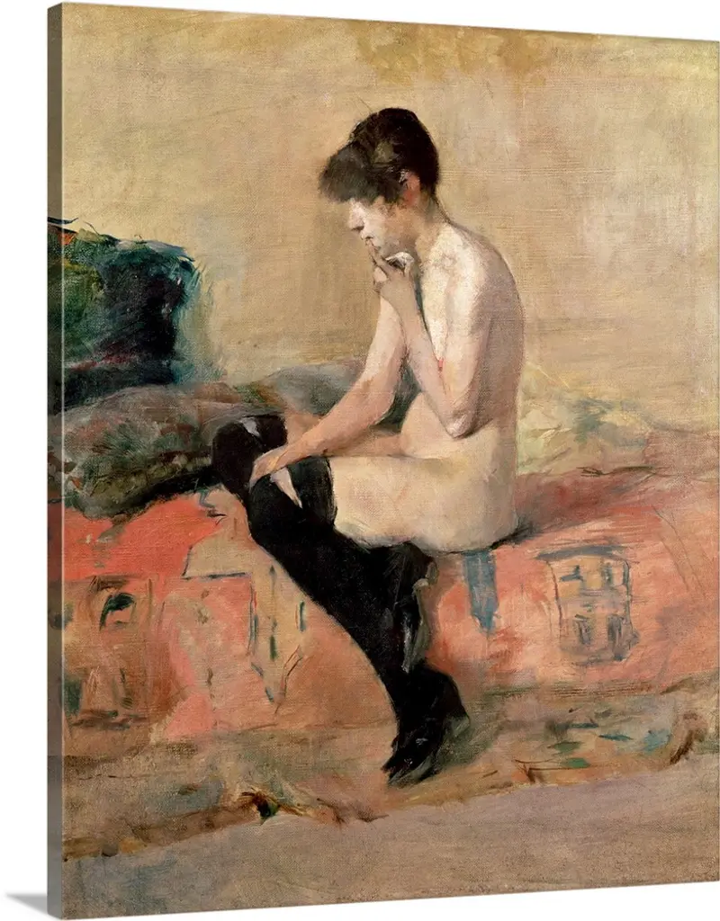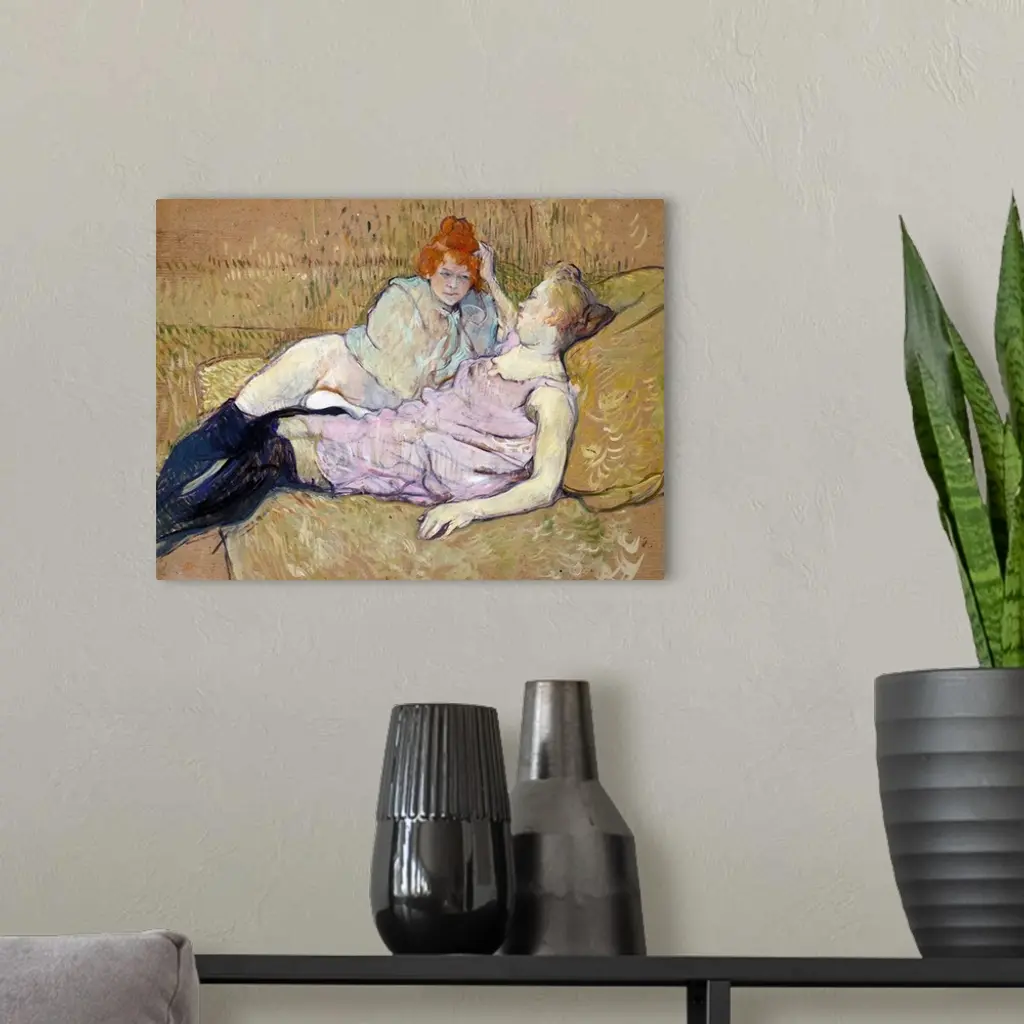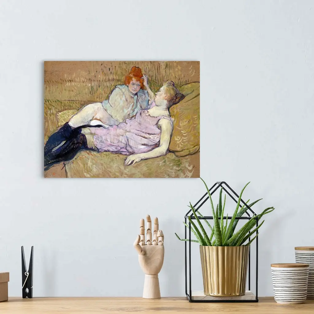 Lautrec set out to document the lives of prostitutes in a series of pictures executed between 1892 and 1896. At first he made sketches in brothels, but he was apparently hampered by insufficient lighting and had his models pose in his studio. He appreciated the naturalness of sitters like this lesbian couple, who stretch themselves out on the divans entirely without pretensions. The candid image may take its cue from Degas's monotypes of brothel scenes and erotic Japanese prints.