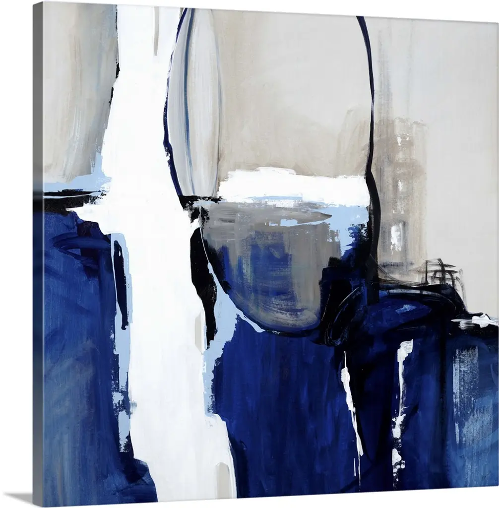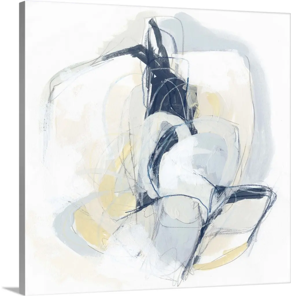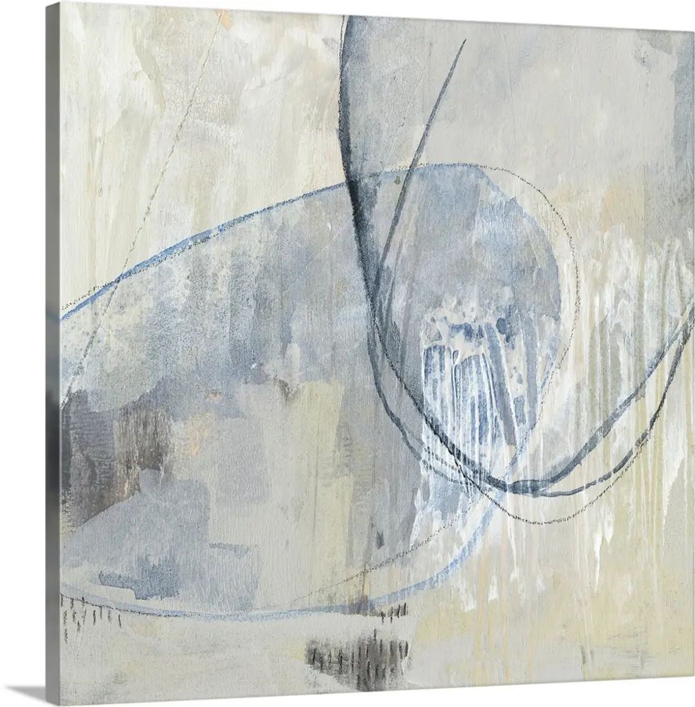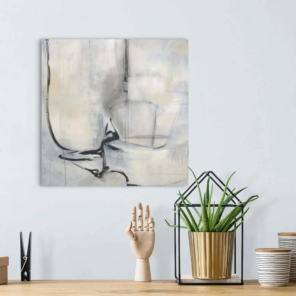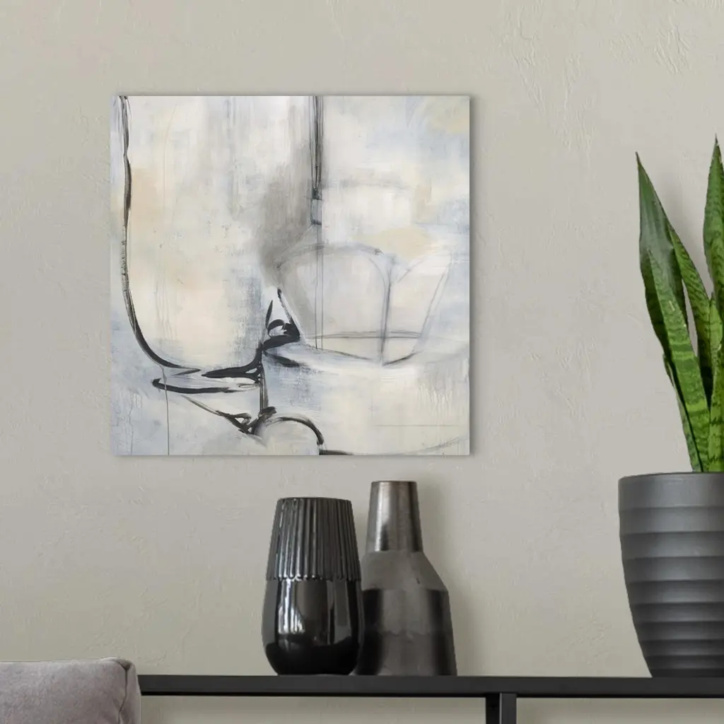 Calm, neutral abstract painting in shades of grey with black strokes.