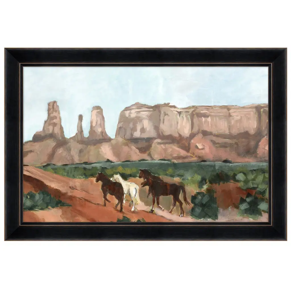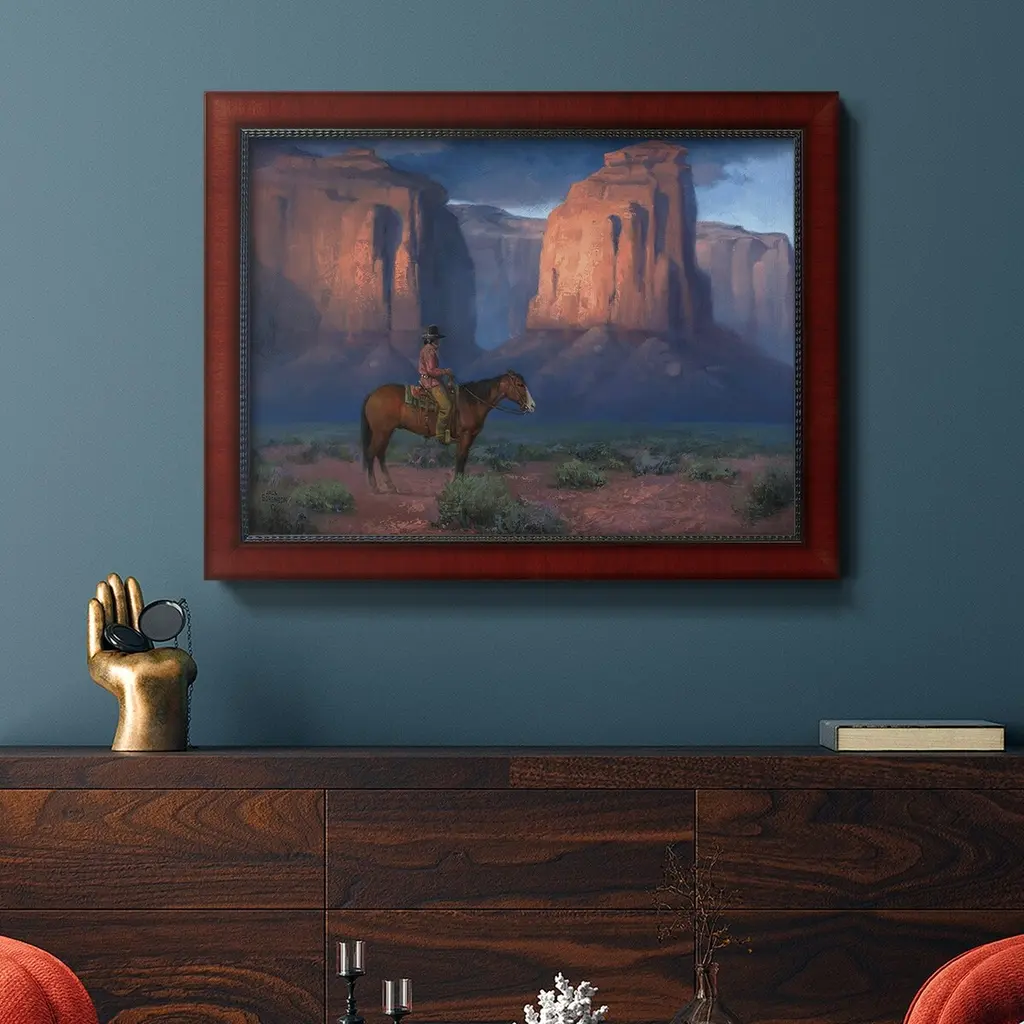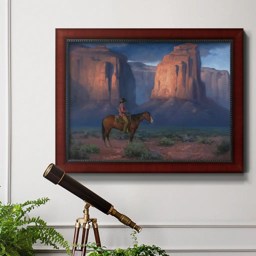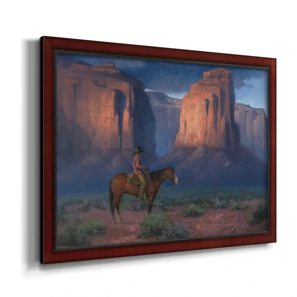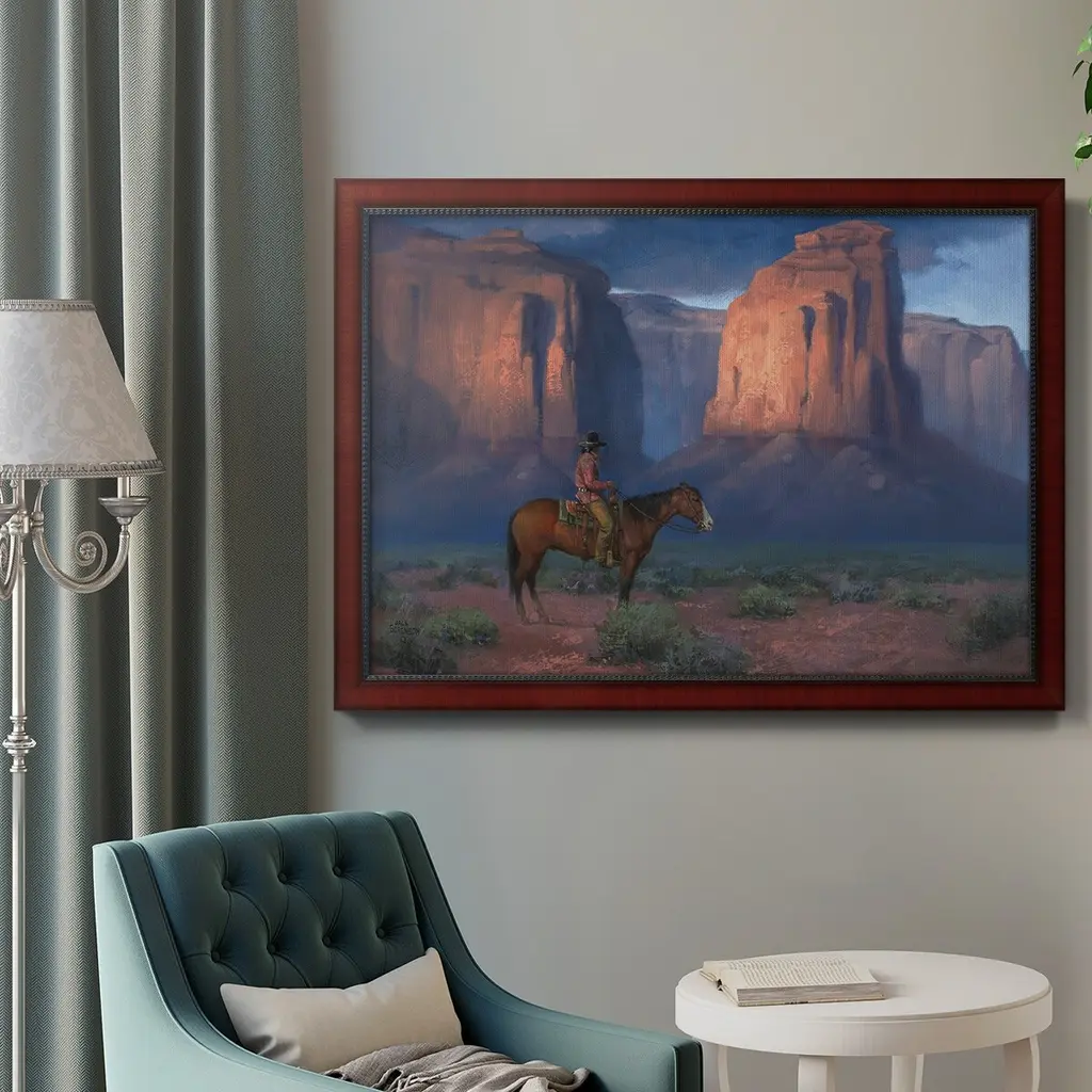 The Spell of Monument Valley Premium Framed Canvas- Ready to Hang A Premium Framed Canvas created to last. Framed in distressed wood and available in an array of sizes and colors Featuring a beveled a solid wood stretcher bar, each piece comes ready to hand 3 SIZES AVAILABLE 16''X20'' - Overall Size 18'X27'' - Overall Size 24''x36'' - Overall Size Each piece is made to order. Each piece comes with hanging hardware. Made in the USA Ready to Hang Giclee Paper Print Acrylic Glass Beveled Matt Board