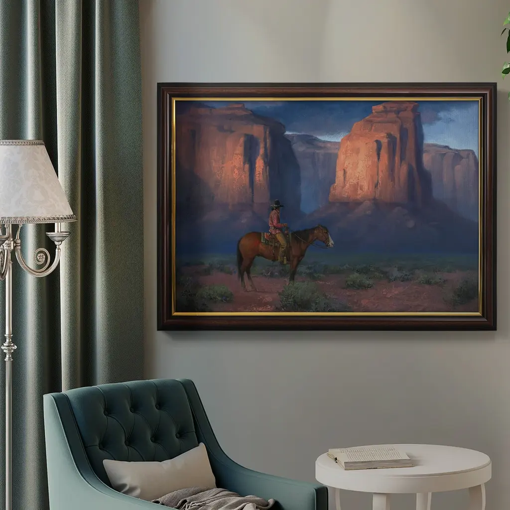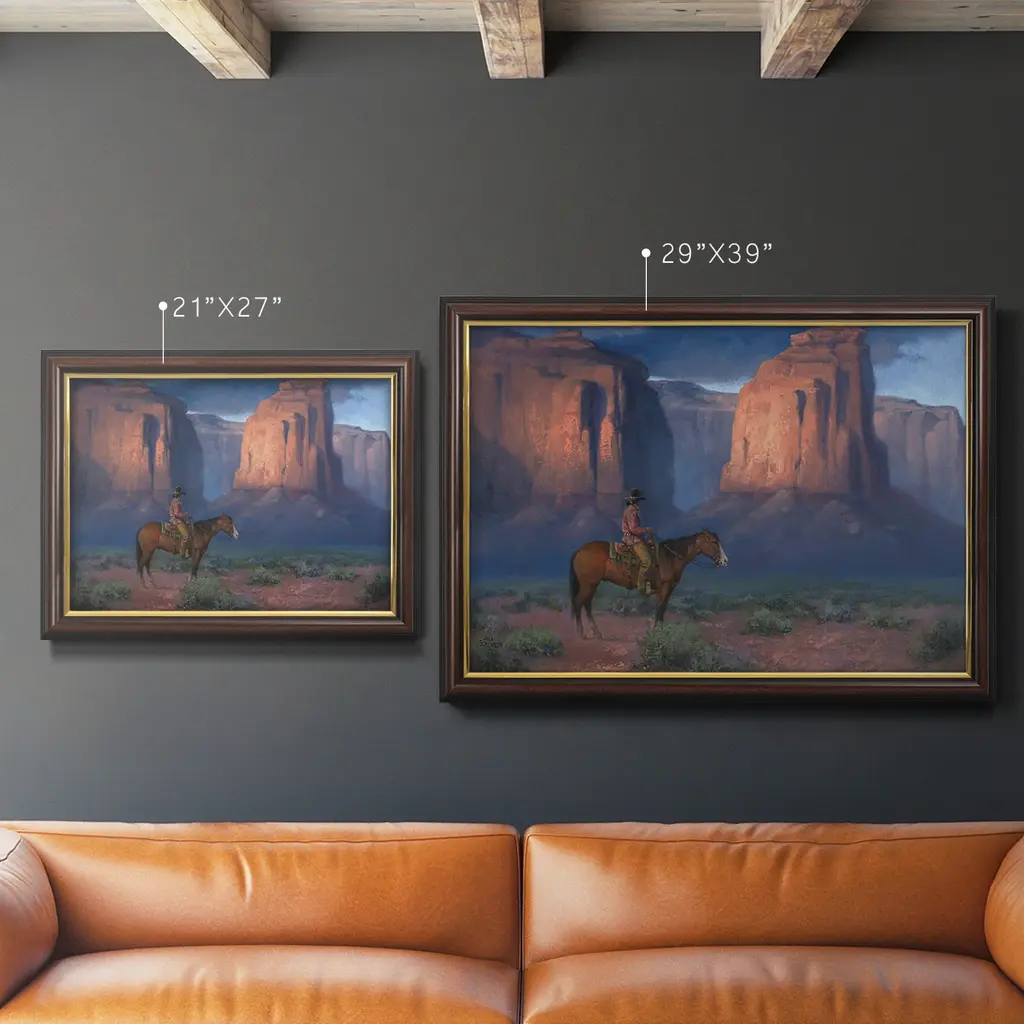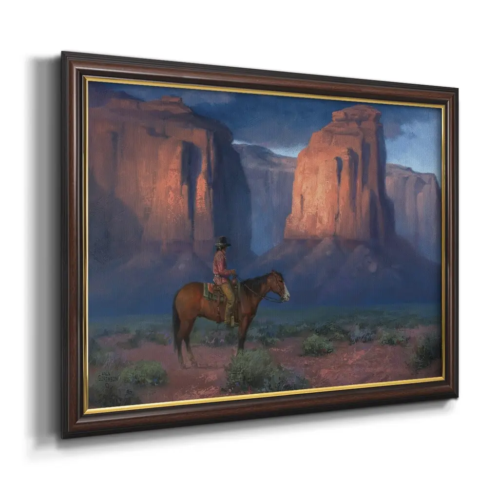 The Spell of Monument Valley Premium Framed Canvas- Ready to Hang A Premium Framed Canvas created to last. Framed in distressed wood and available in an array of sizes and colors Featuring a beveled a solid wood stretcher bar, each piece comes ready to hand 3 SIZES AVAILABLE 16''X20'' - Overall Size 18'X27'' - Overall Size 24''x36'' - Overall Size Each piece is made to order. Each piece comes with hanging hardware. Made in the USA Ready to Hang Giclee Paper Print Acrylic Glass Beveled Matt Board