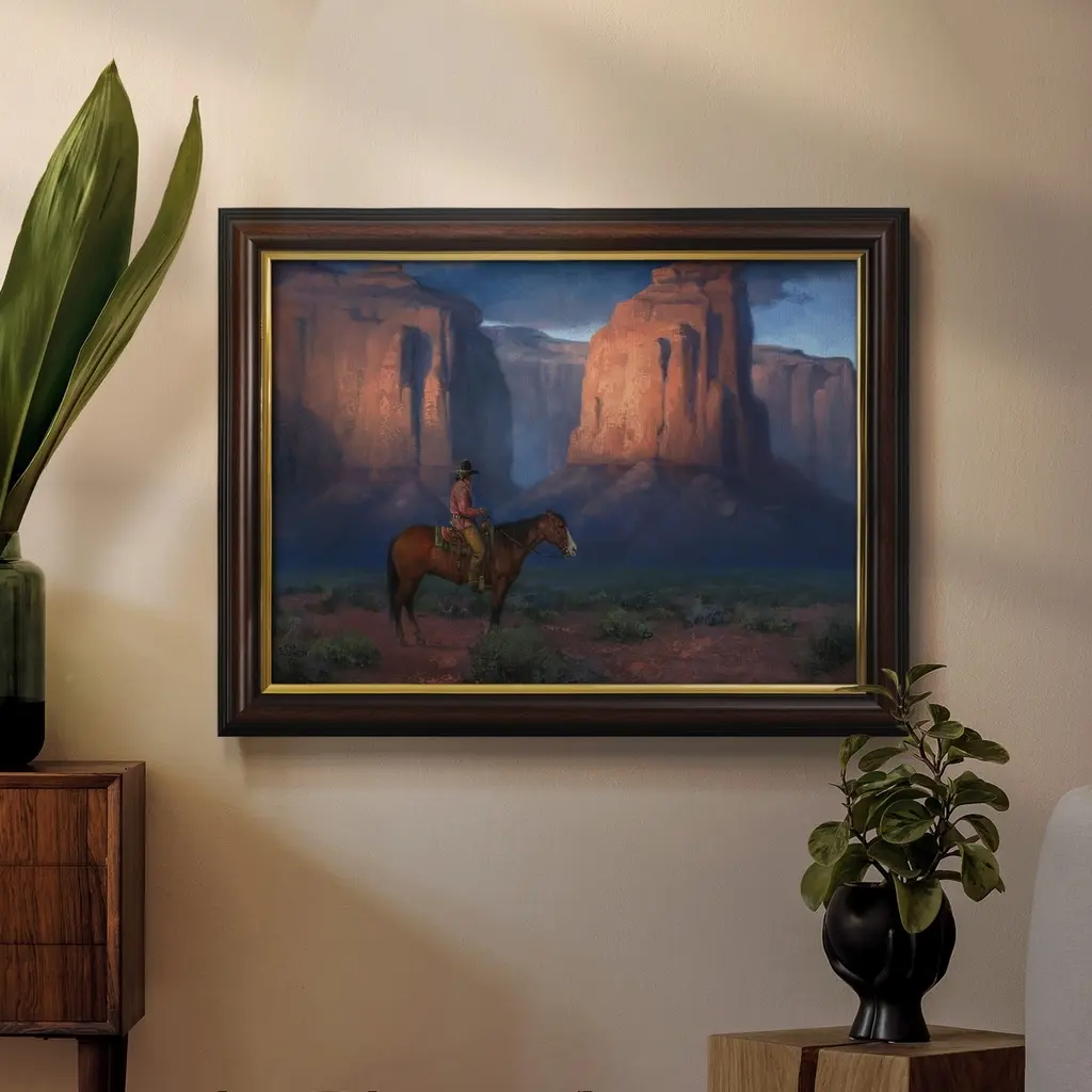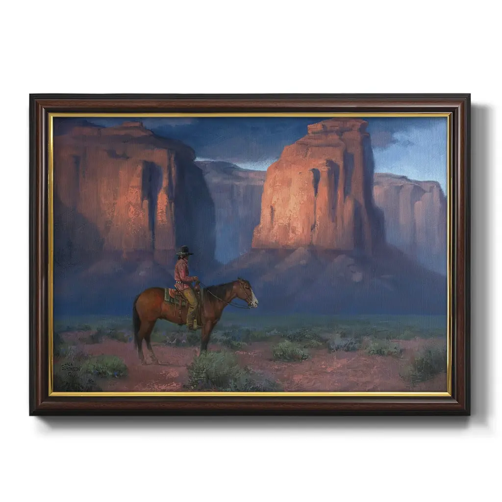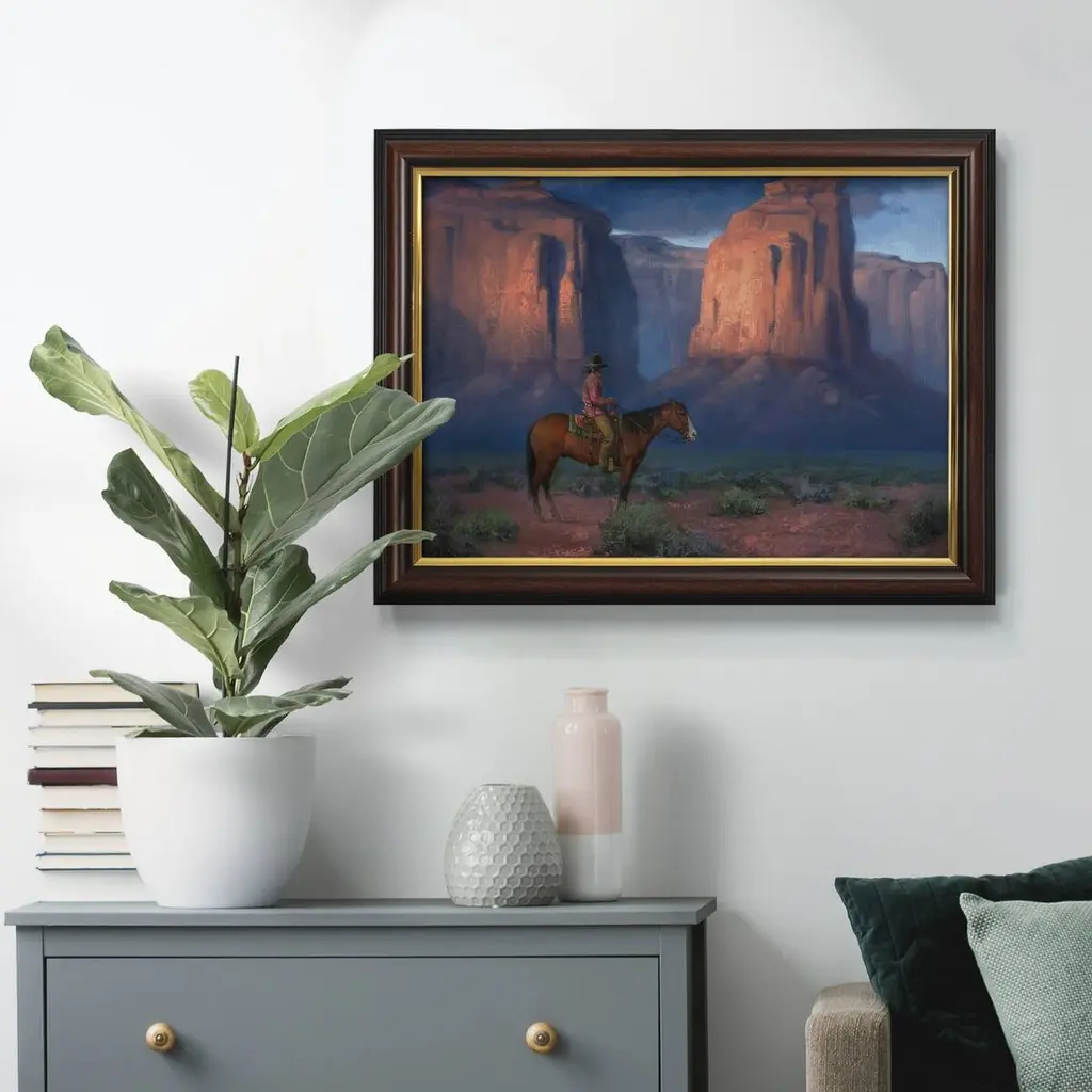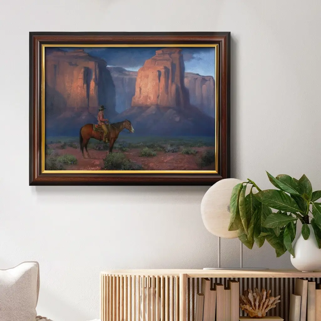 The Spell of Monument Valley Premium Framed Canvas- Ready to Hang A Premium Framed Canvas created to last. Framed in distressed wood and available in an array of sizes and colors Featuring a beveled a solid wood stretcher bar, each piece comes ready to hand 3 SIZES AVAILABLE 16''X20'' - Overall Size 18'X27'' - Overall Size 24''x36'' - Overall Size Each piece is made to order. Each piece comes with hanging hardware. Made in the USA Ready to Hang Giclee Paper Print Acrylic Glass Beveled Matt Board