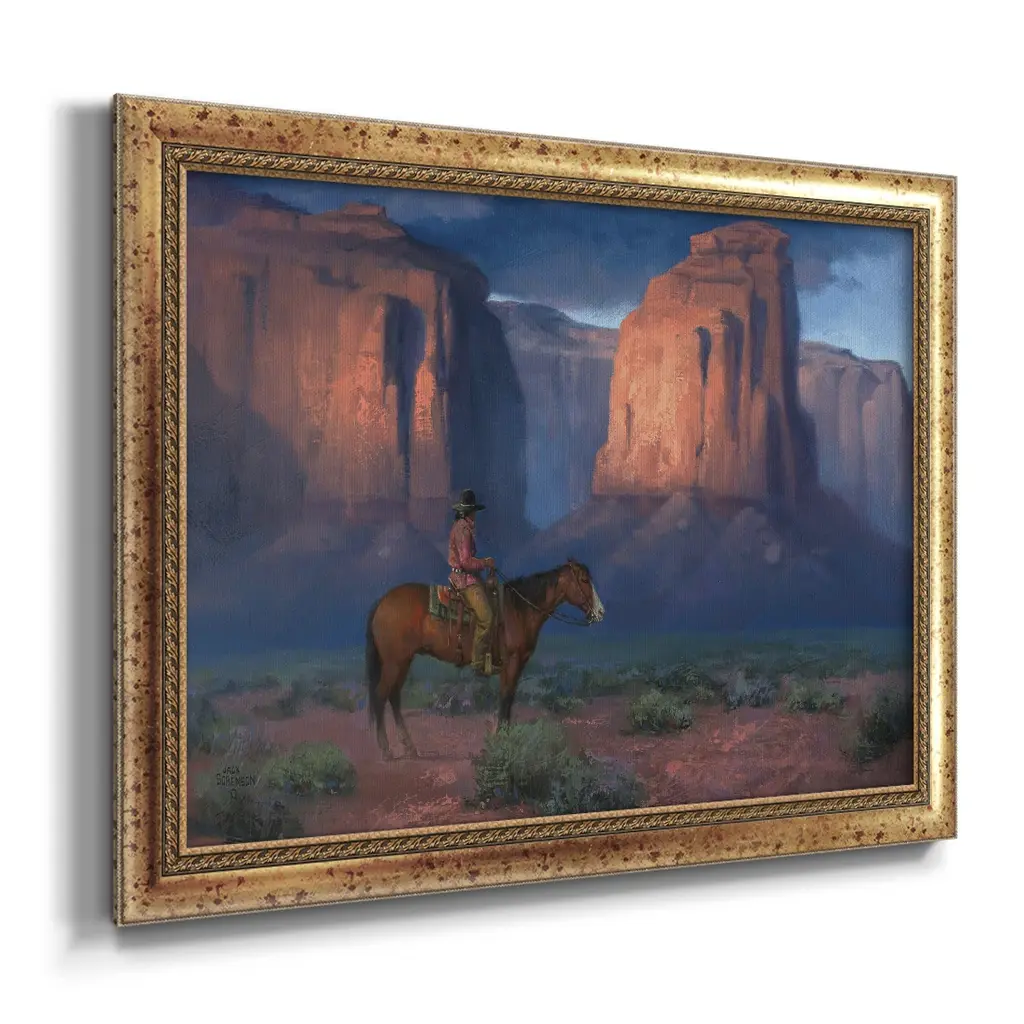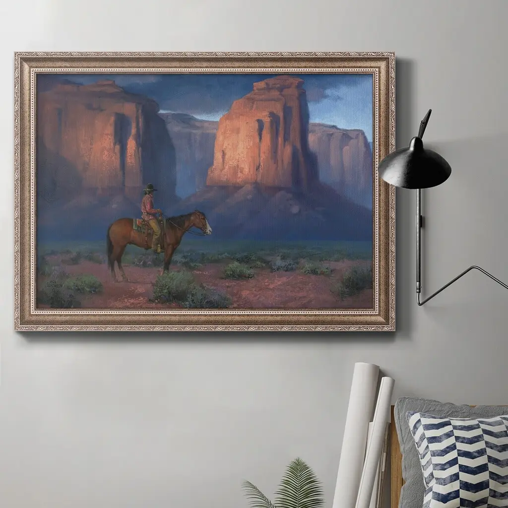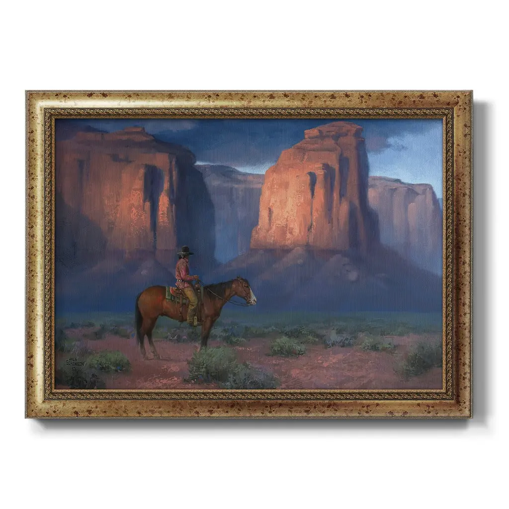 The Spell of Monument Valley Premium Framed Canvas- Ready to Hang A Premium Framed Canvas created to last. Framed in distressed wood and available in an array of sizes and colors Featuring a beveled a solid wood stretcher bar, each piece comes ready to hand 3 SIZES AVAILABLE 16''X20'' - Overall Size 18'X27'' - Overall Size 24''x36'' - Overall Size Each piece is made to order. Each piece comes with hanging hardware. Made in the USA Ready to Hang Giclee Paper Print Acrylic Glass Beveled Matt Board