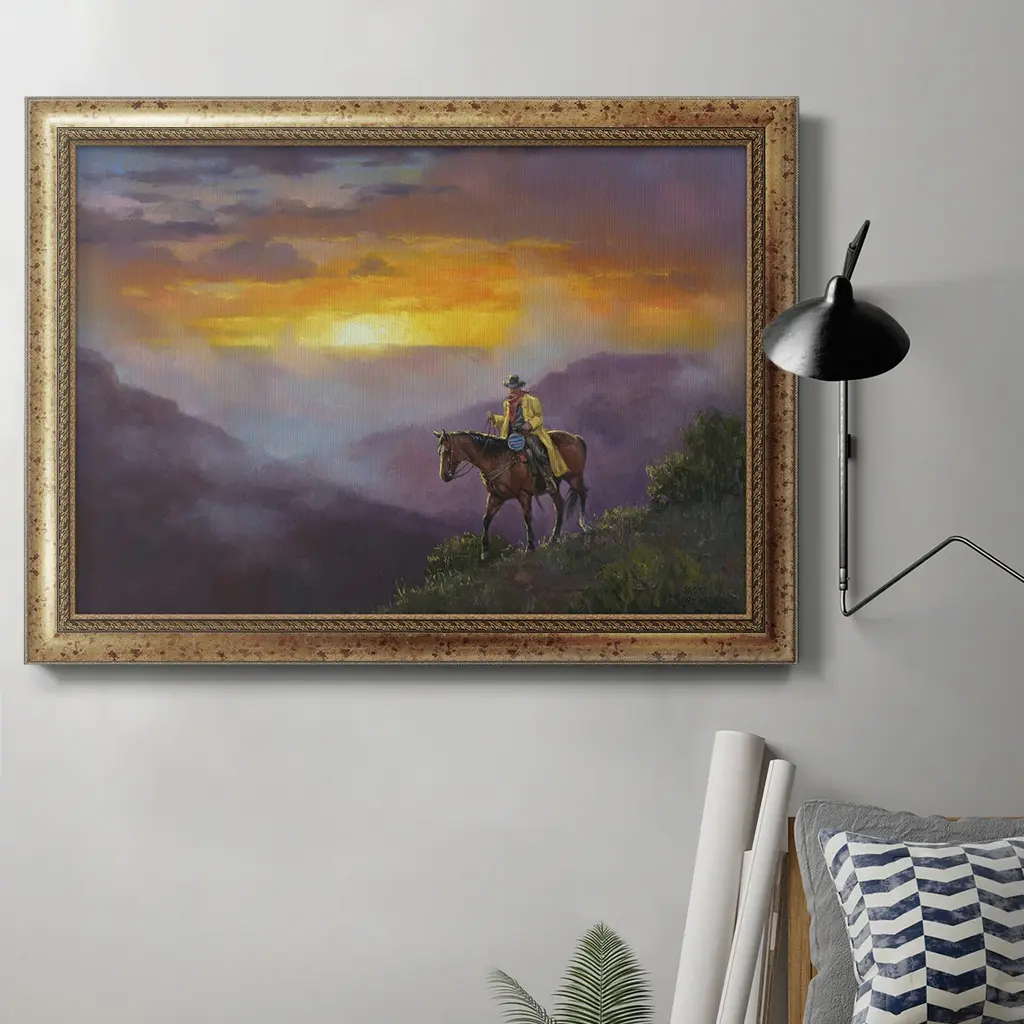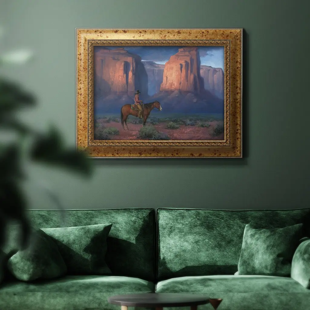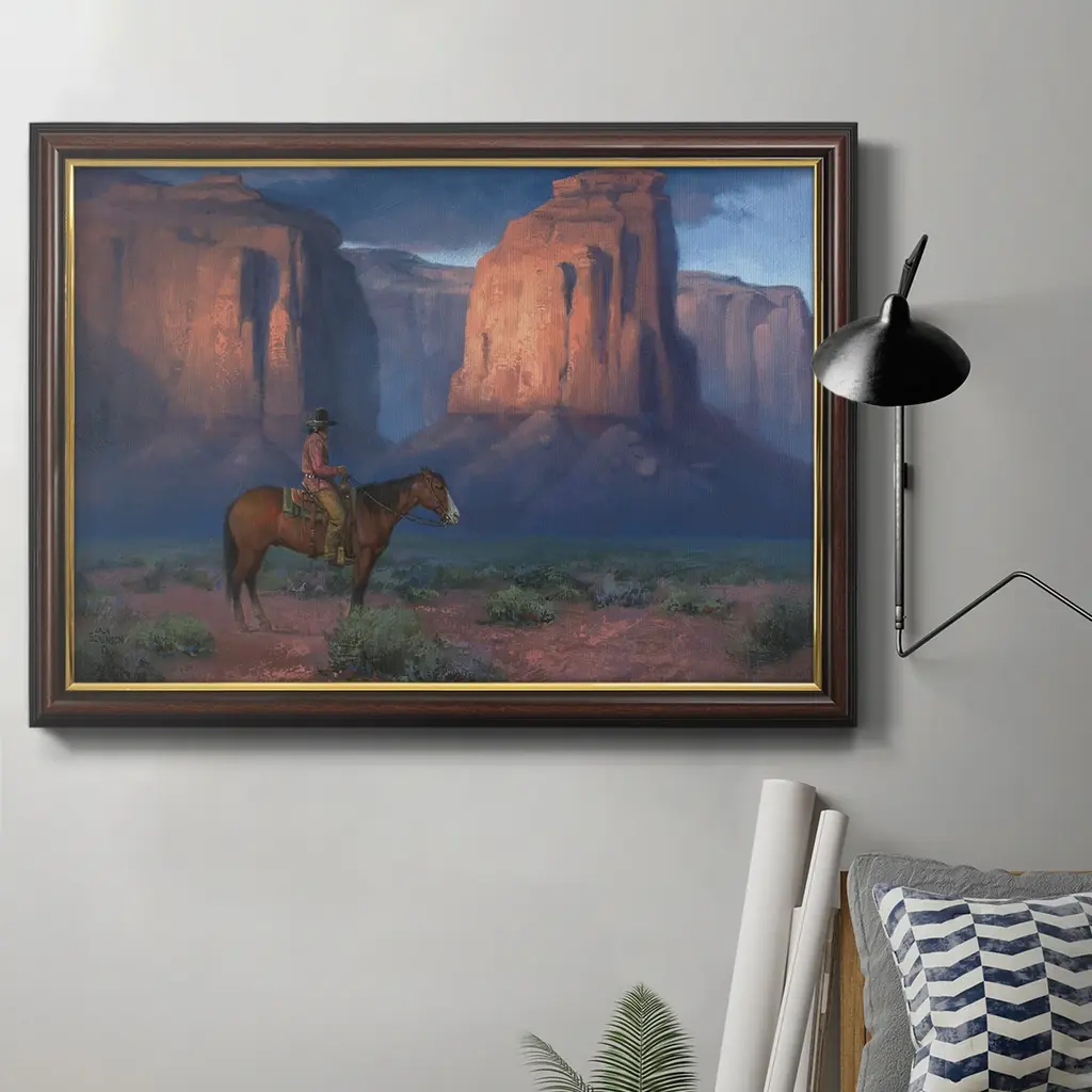 The Spell of Monument Valley Premium Framed Canvas- Ready to Hang A Premium Framed Canvas created to last. Framed in distressed wood and available in an array of sizes and colors Featuring a beveled a solid wood stretcher bar, each piece comes ready to hand 3 SIZES AVAILABLE 16''X20'' - Overall Size 18'X27'' - Overall Size 24''x36'' - Overall Size Each piece is made to order. Each piece comes with hanging hardware. Made in the USA Ready to Hang Giclee Paper Print Acrylic Glass Beveled Matt Board