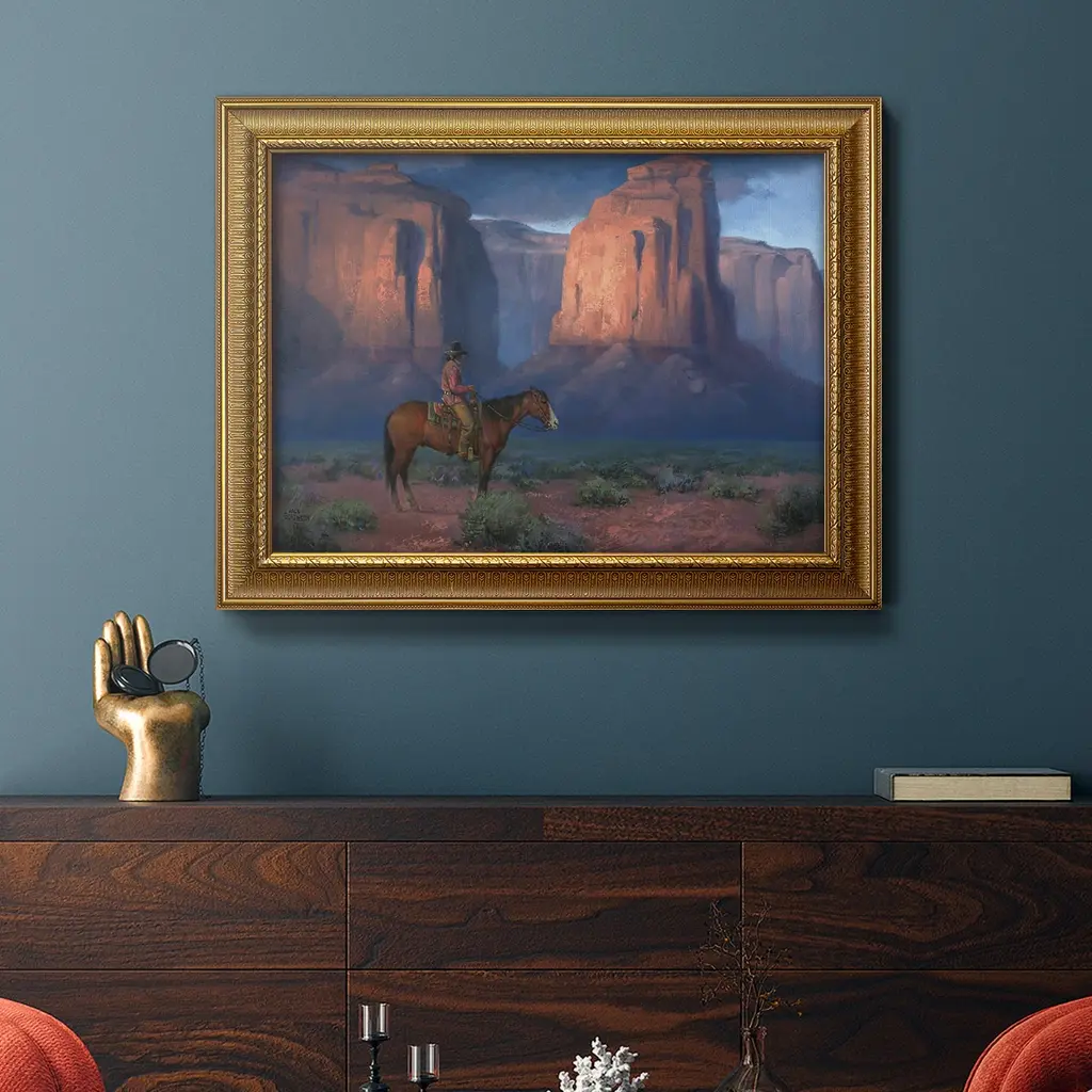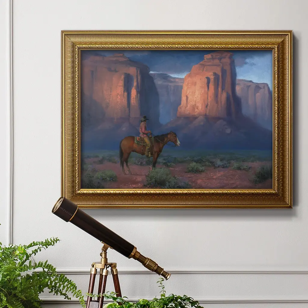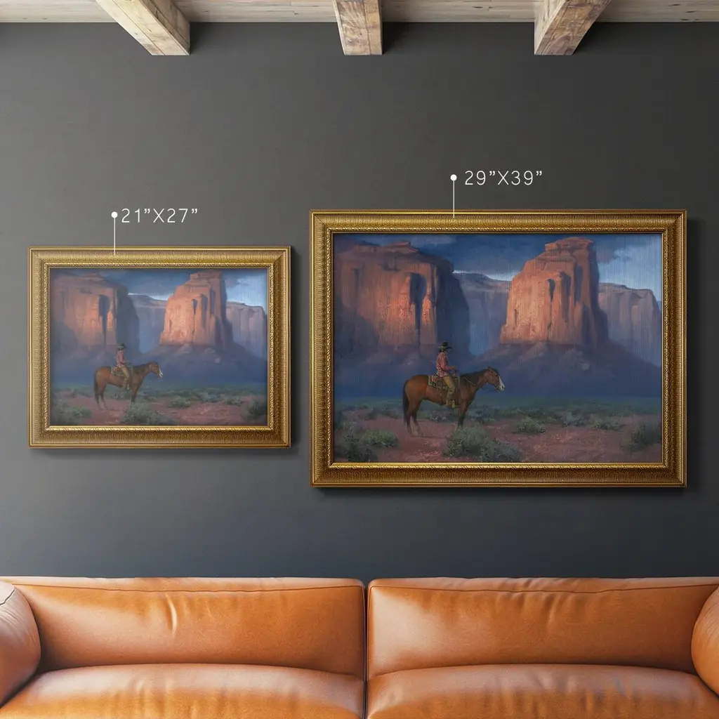 The Spell of Monument Valley Premium Framed Canvas- Ready to Hang A Premium Framed Canvas created to last. Framed in distressed wood and available in an array of sizes and colors Featuring a beveled a solid wood stretcher bar, each piece comes ready to hand 3 SIZES AVAILABLE 16''X20'' - Overall Size 18'X27'' - Overall Size 24''x36'' - Overall Size Each piece is made to order. Each piece comes with hanging hardware. Made in the USA Ready to Hang Giclee Paper Print Acrylic Glass Beveled Matt Board