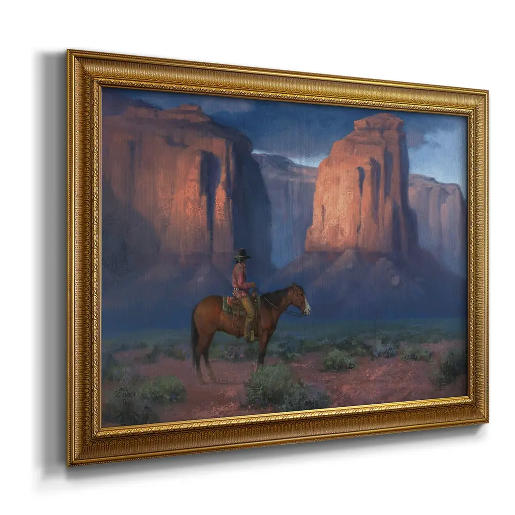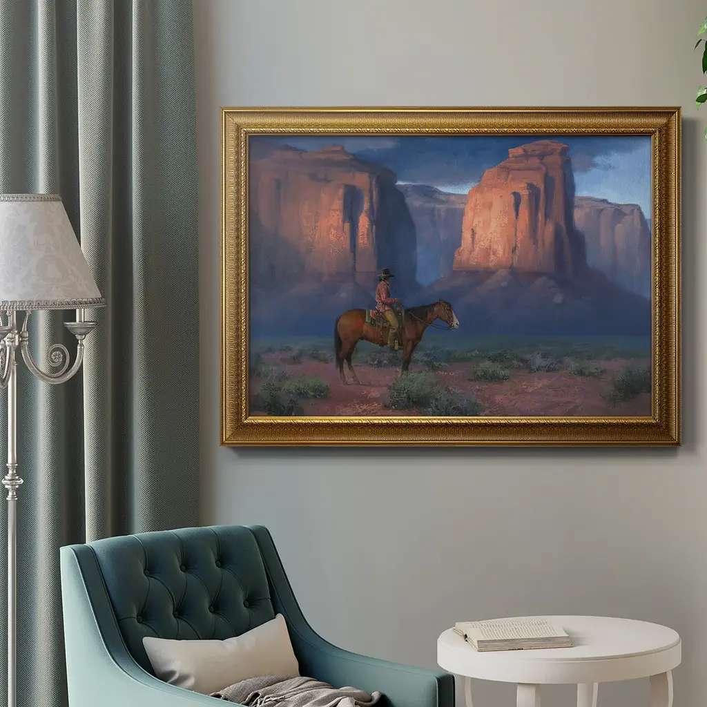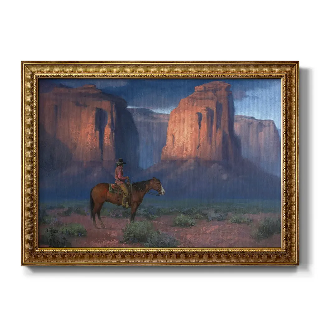 The Spell of Monument Valley Premium Framed Canvas- Ready to Hang A Premium Framed Canvas created to last. Framed in distressed wood and available in an array of sizes and colors Featuring a beveled a solid wood stretcher bar, each piece comes ready to hand 3 SIZES AVAILABLE 16''X20'' - Overall Size 18'X27'' - Overall Size 24''x36'' - Overall Size Each piece is made to order. Each piece comes with hanging hardware. Made in the USA Ready to Hang Giclee Paper Print Acrylic Glass Beveled Matt Board