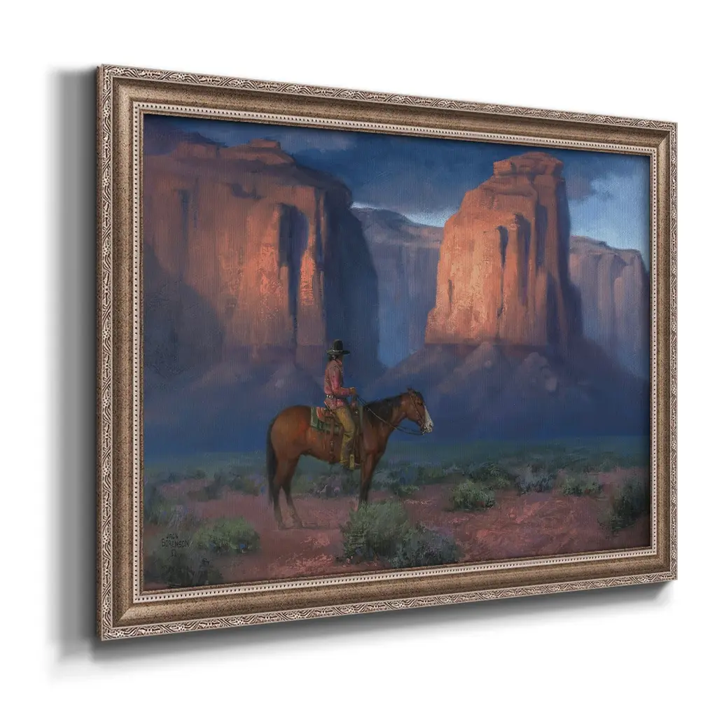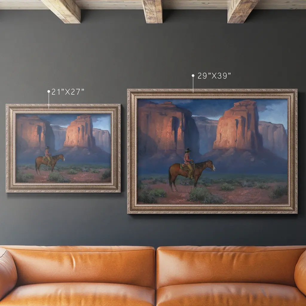 The Spell of Monument Valley Premium Framed Canvas- Ready to Hang A Premium Framed Canvas created to last. Framed in distressed wood and available in an array of sizes and colors Featuring a beveled a solid wood stretcher bar, each piece comes ready to hand 3 SIZES AVAILABLE 16''X20'' - Overall Size 18'X27'' - Overall Size 24''x36'' - Overall Size Each piece is made to order. Each piece comes with hanging hardware. Made in the USA Ready to Hang Giclee Paper Print Acrylic Glass Beveled Matt Board