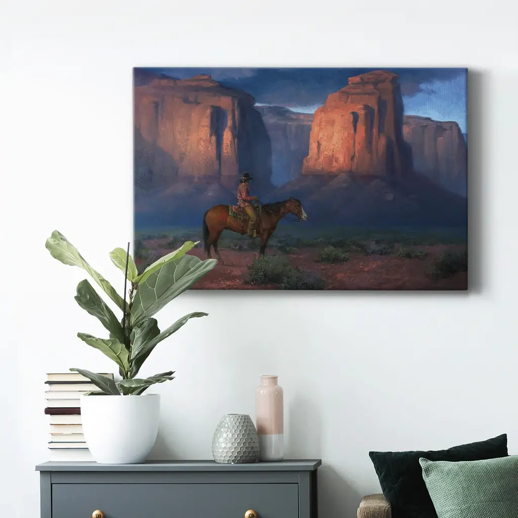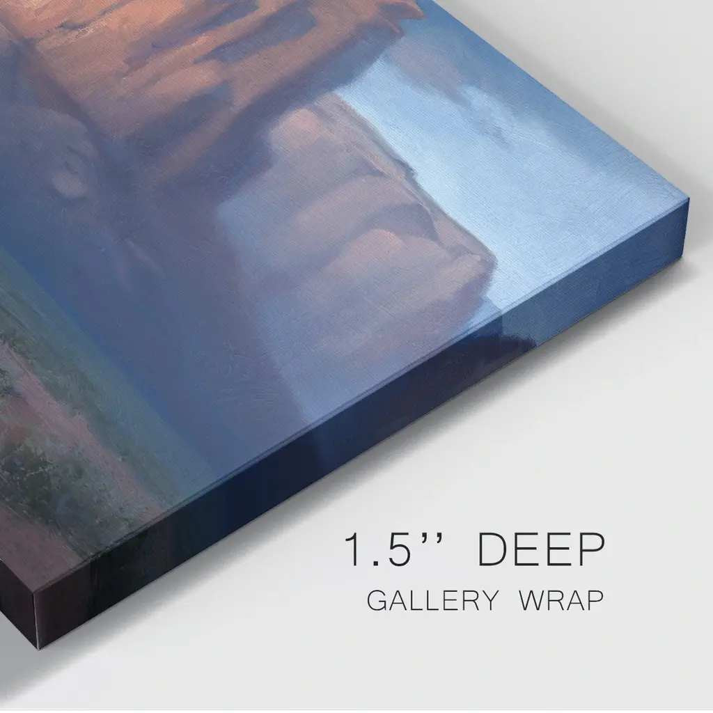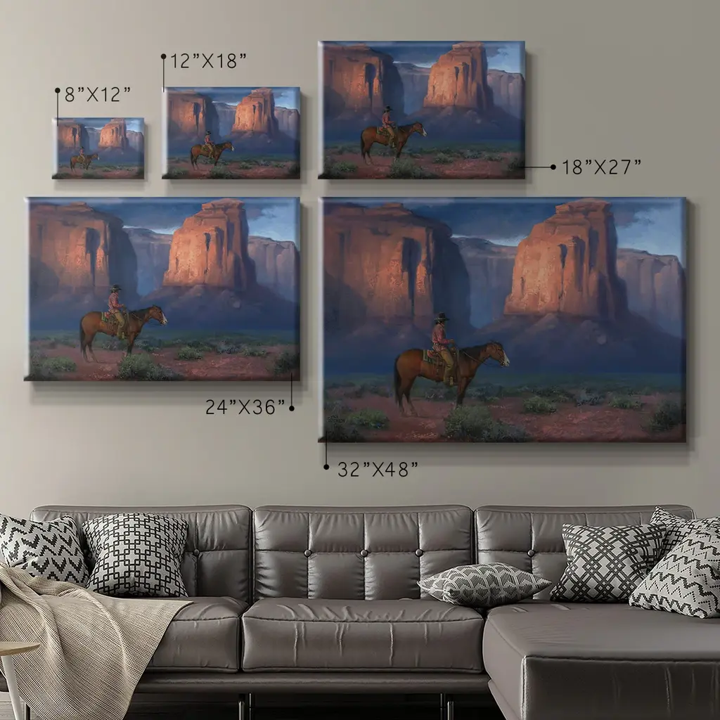 The Spell of Monument Valley Premium Gallery Wrapped Canvas - Ready to Hang A premium hand stretched gallery wrapped canvas print created to last. Featuring a beveled a solid wood stretcher bar, each piece comes ready to hand 6 SIZES AVAILABLE 8''X12'' - Overall Size 12''X18'' - Overall Size 18''X27'' - Overall Size 24''x36'' - Overall Size 32''x48'' - Overall Size 40''x60'' - Overall Size Each piece is made to order. Built to Last Each piece comes ready to hang Solid wood stretcher Fade and Water resistant Made domestically