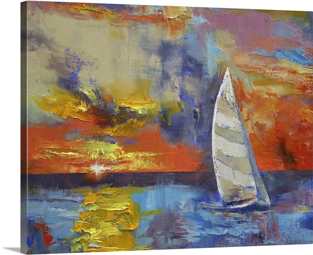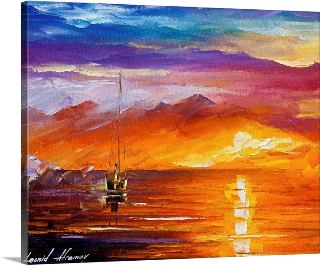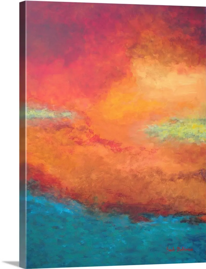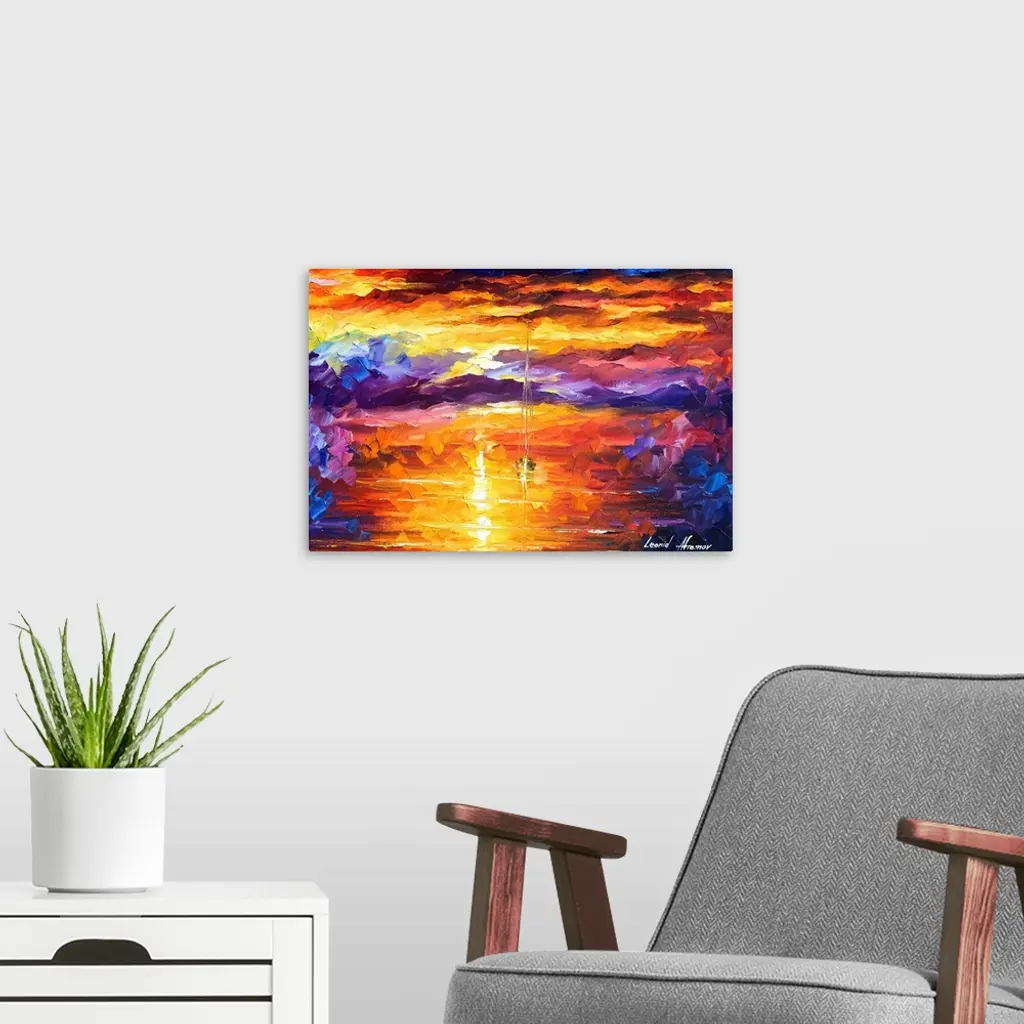 Contemporary colorful painting of the sun setting over a calm seascape.