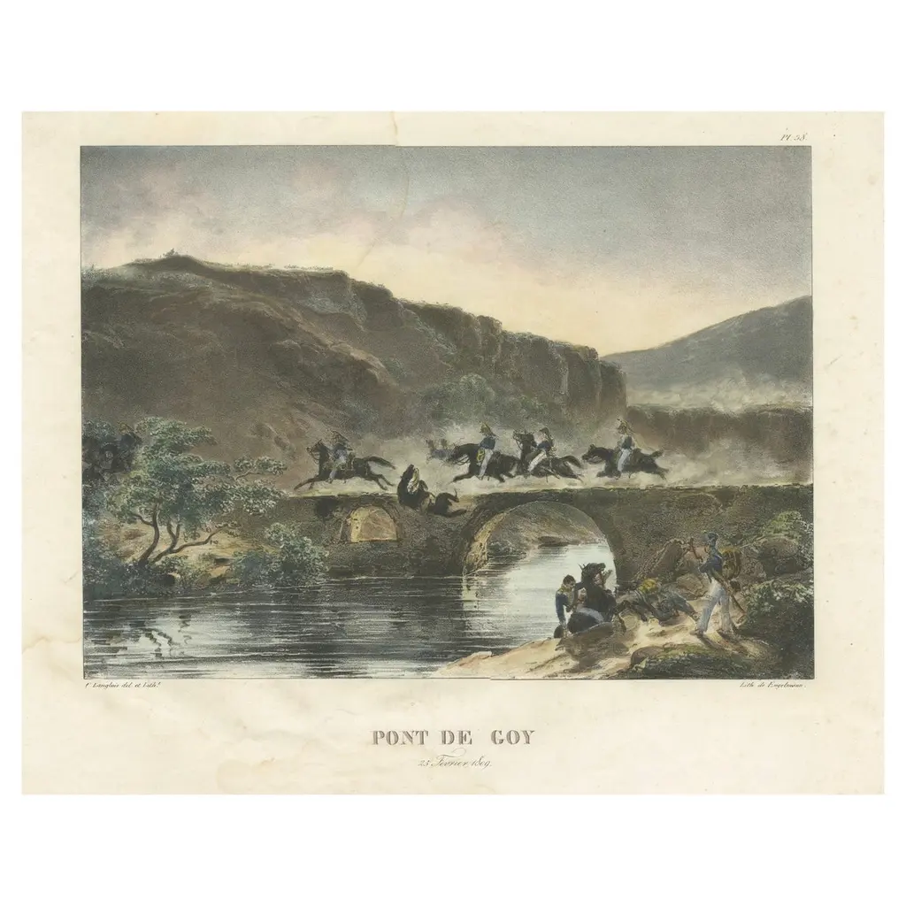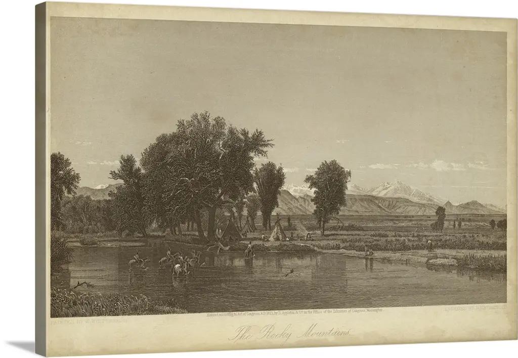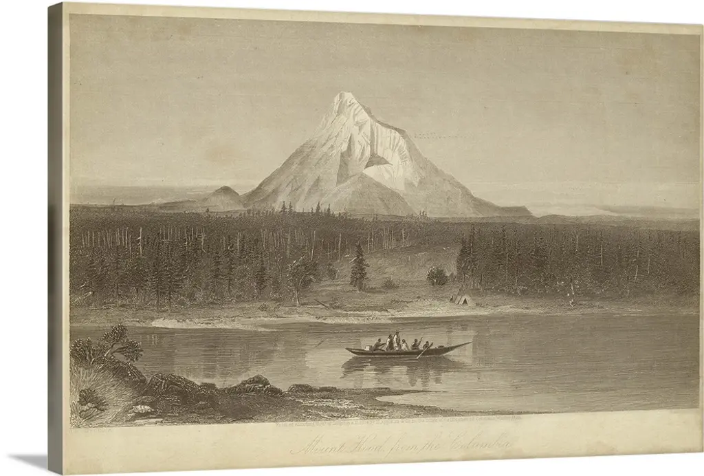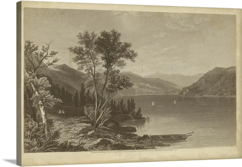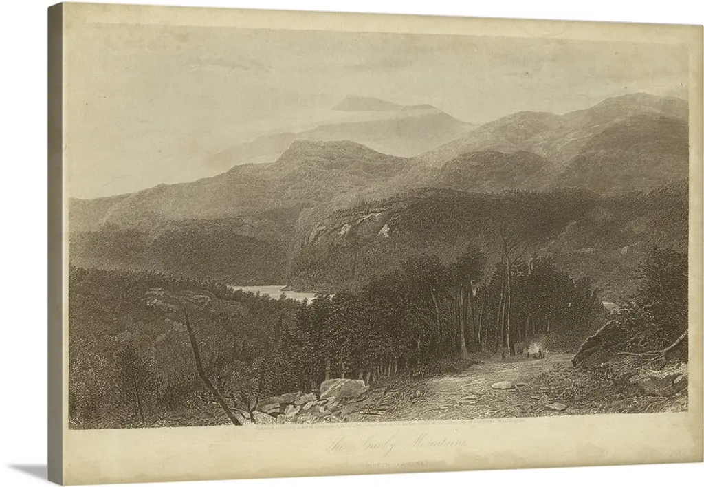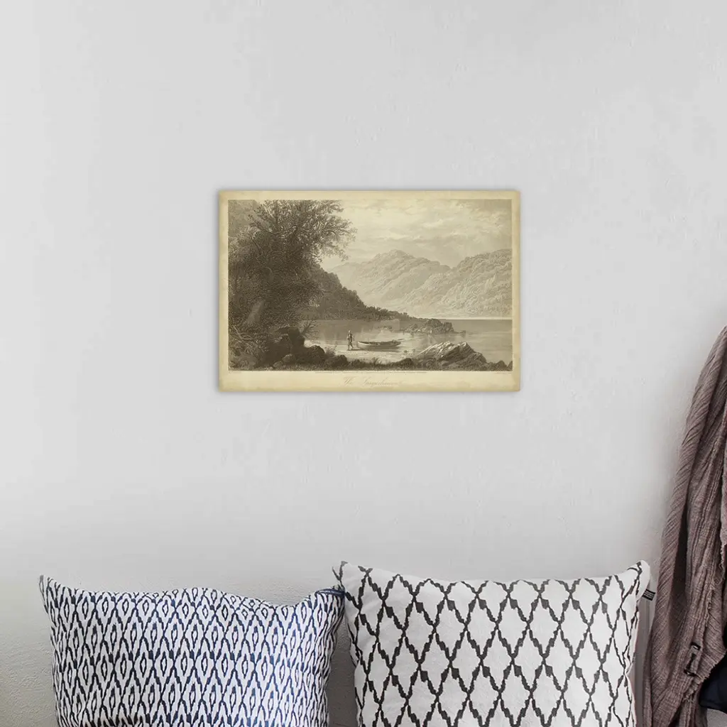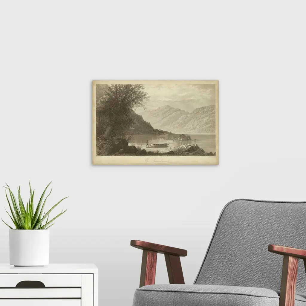 Vintage artwork of a lake by the mountains in sepia.