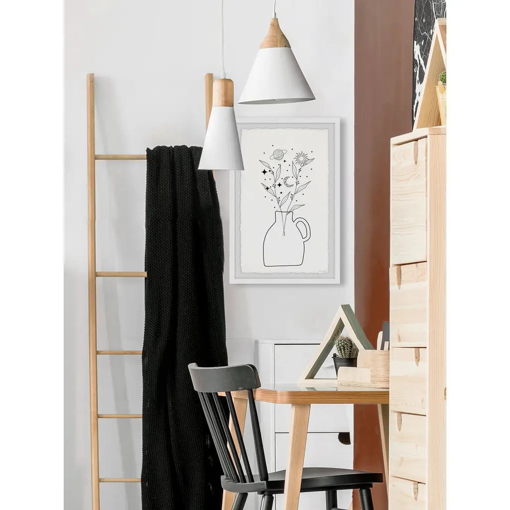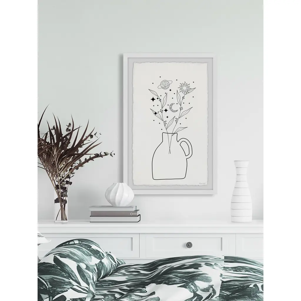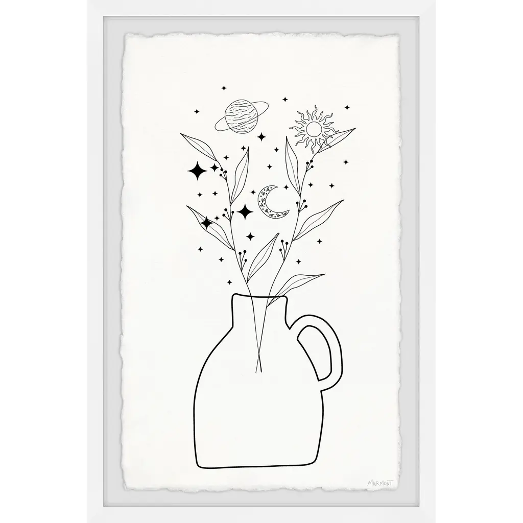 Perfectly suitable for any room in the house, this black and white print features a potted plant with the moon and various stars and planets around it. Proudly printed in the USA, this piece is printed on high quality archive paper and professionally hand-framed. With wall-mounting hooks included, this artful accent is ready to hang up as soon as it reaches your front door. • Top quality Giclee print on high resolution Archive Paper • Hand cut deckled edges • High quality durable non-warping frame • Finished under shatter resistant plexiglass • Arrives ready to hang • Includes a certificate of authenticity • Printed the USA