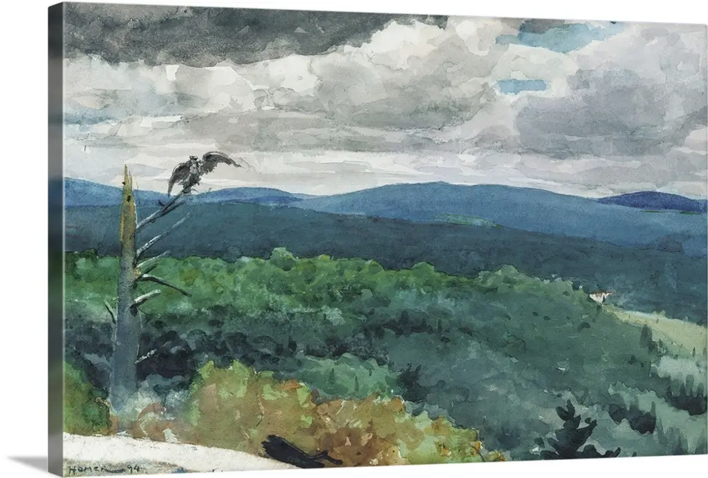 The Three Trees, by Rembrandt van Rijn, 1643, Dutch print, etching with drypoint and engraving on paper. He included figures in the landscape: an artist sketching on the hill at right, a fisher couple at lower left, and an amorous couple hidden in the darkened foreground bushes.
