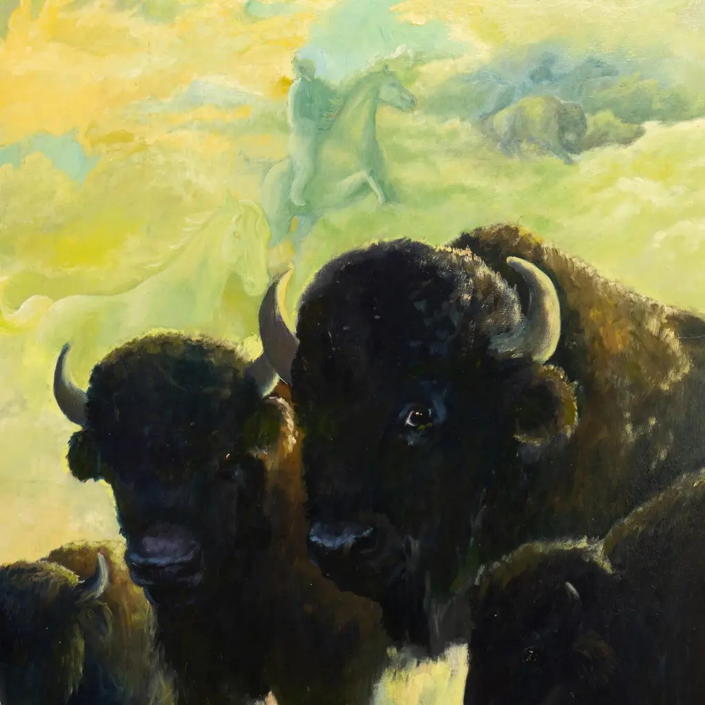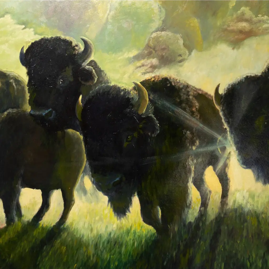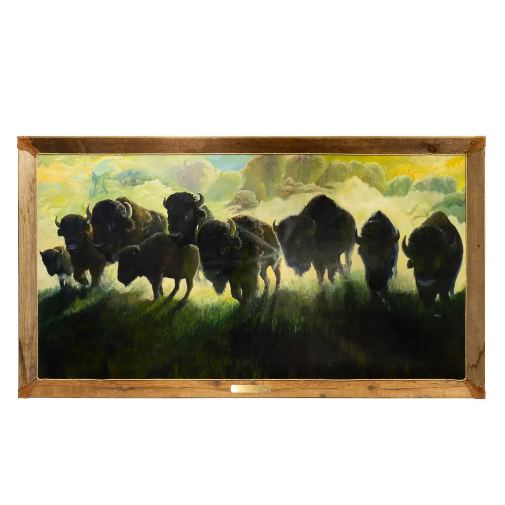 Oil on board; 48" x 96". Used in the Entry Pavillion of 1974 World's Fair in Spokane, Washington. Depicts a herd of buffalo and buffalo clouds. Wood and rope frame. Subjects for Emilie's work include horses, burros, owls, old farm buildings, ranch gates, and rural mail boxes. Some of her Western works are reproduced on greeting cards by Leanin' Tree Publishing Company, Boulder, Colorado. Her work is in the collection of the Christlieb Foundation, Great Plains Art Collection, Center of the Great Plains, University of Nebraska, Lincoln. In 1974, Touraine won best in show and the directors' award at the Pacific Northwest Indian Center Show and Auction, in Spokane, Washington. Her exhibitions include a 1973 one-person show at the Montana Historical Society, Helena; and paintings in the U.S. Pavilion at Expo '74, Spokane. A number of paintings, which became the Phillip White Hawk Collection of Symbolic America, were dedicated at the Nebraska State Fair, Lincoln, on September 1, 1976. Emilie Touraine passed away in Albuquerque, NM on September 25, 2019 at the age of 80.Family Owned & OperatedCisco’s Gallery deals in the rare, exceptional, and one-of-a-kind pieces that define the history of America and the Old West. Our pieces range from American Indian to Cowboy Western and include original items of everyday life, commerce, art, and warfare that tamed America’s frontier. Our 14,000 square foot gallery opened in 1996 in beautiful Coeur d’Alene, Idaho.Personal ServiceCisco’s operates on old fashioned values – honesty and integrity, and all of our items are backed by our money back guarantee. We appreciate the opportunity to earn your business. Whether you desire assistance with a jewelry purchase, choosing a gift, identification, or even selling – we hope to be your trusted source. Painting, bison, buffalo, fine art, original art, collectible, Western, World's Fair, Spokane, Washington, PNW, regional art, sunrise, sunlight, animal, original oil