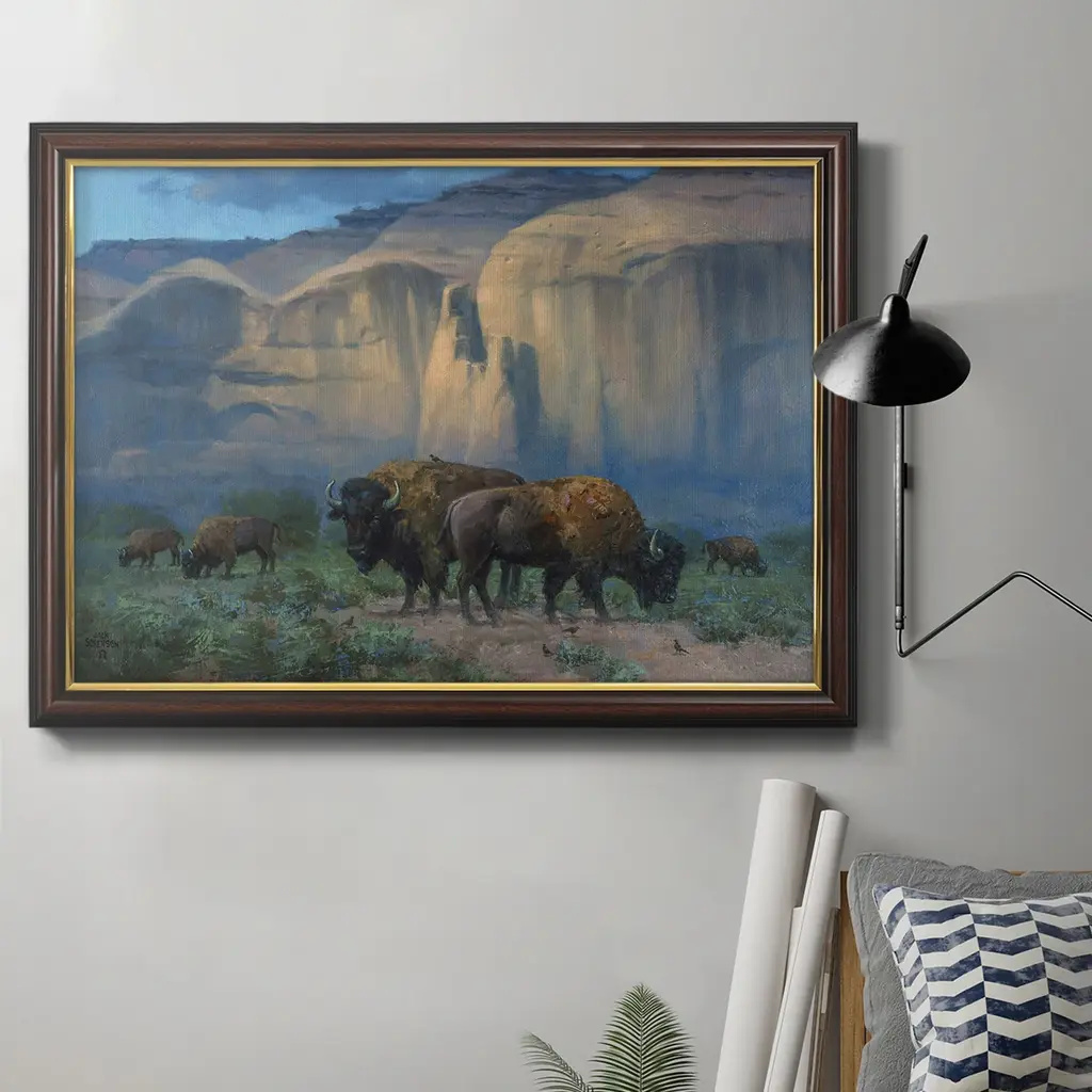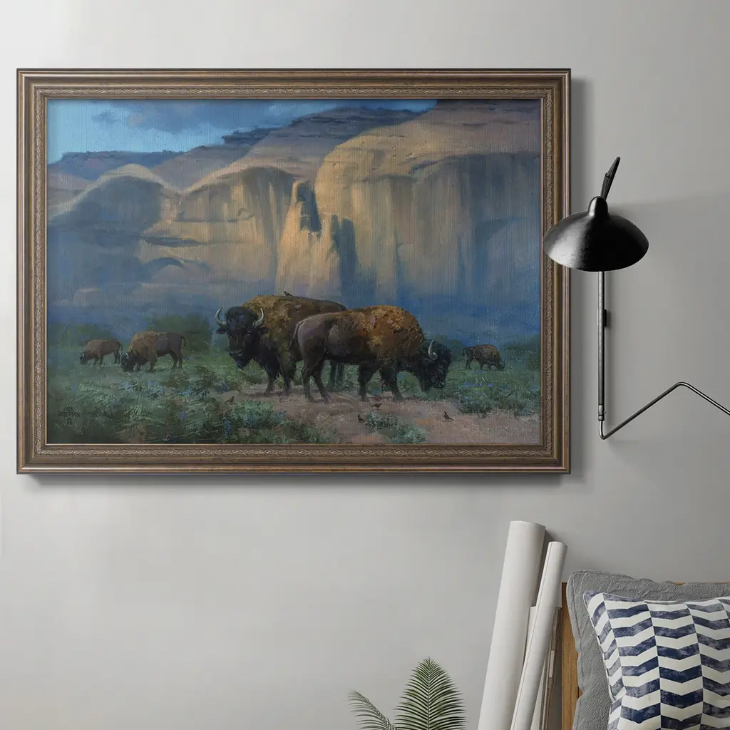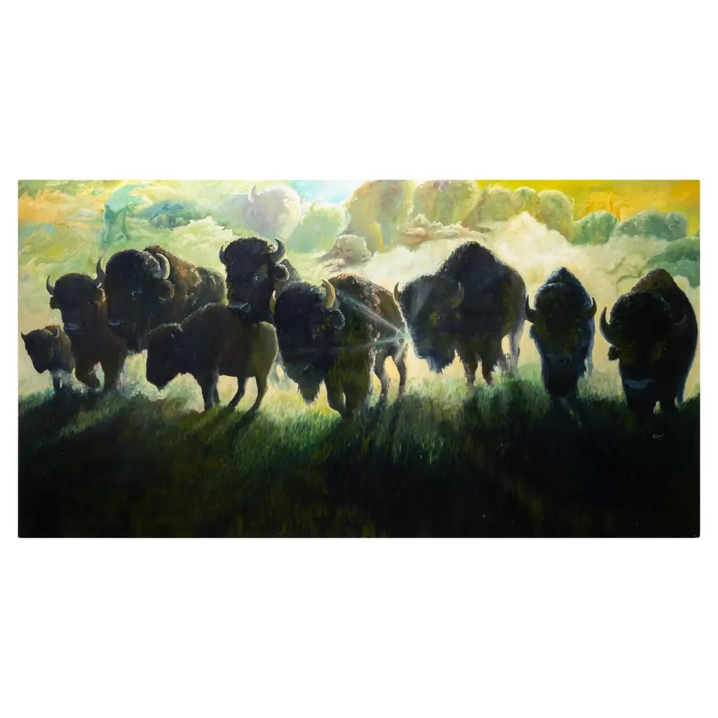 Oil on board; 48" x 96". Used in the Entry Pavillion of 1974 World's Fair in Spokane, Washington. Depicts a herd of buffalo and buffalo clouds. Wood and rope frame. Subjects for Emilie's work include horses, burros, owls, old farm buildings, ranch gates, and rural mail boxes. Some of her Western works are reproduced on greeting cards by Leanin' Tree Publishing Company, Boulder, Colorado. Her work is in the collection of the Christlieb Foundation, Great Plains Art Collection, Center of the Great Plains, University of Nebraska, Lincoln. In 1974, Touraine won best in show and the directors' award at the Pacific Northwest Indian Center Show and Auction, in Spokane, Washington. Her exhibitions include a 1973 one-person show at the Montana Historical Society, Helena; and paintings in the U.S. Pavilion at Expo '74, Spokane. A number of paintings, which became the Phillip White Hawk Collection of Symbolic America, were dedicated at the Nebraska State Fair, Lincoln, on September 1, 1976. Emilie Touraine passed away in Albuquerque, NM on September 25, 2019 at the age of 80.Family Owned & OperatedCisco’s Gallery deals in the rare, exceptional, and one-of-a-kind pieces that define the history of America and the Old West. Our pieces range from American Indian to Cowboy Western and include original items of everyday life, commerce, art, and warfare that tamed America’s frontier. Our 14,000 square foot gallery opened in 1996 in beautiful Coeur d’Alene, Idaho.Personal ServiceCisco’s operates on old fashioned values – honesty and integrity, and all of our items are backed by our money back guarantee. We appreciate the opportunity to earn your business. Whether you desire assistance with a jewelry purchase, choosing a gift, identification, or even selling – we hope to be your trusted source. Painting, bison, buffalo, fine art, original art, collectible, Western, World's Fair, Spokane, Washington, PNW, regional art, sunrise, sunlight, animal, original oil