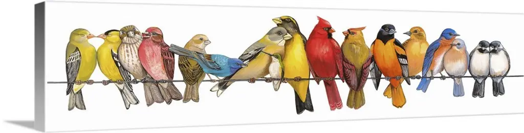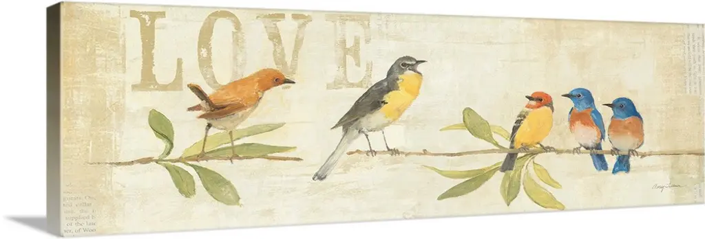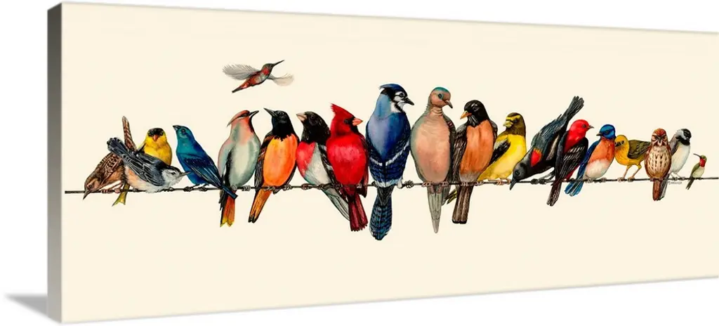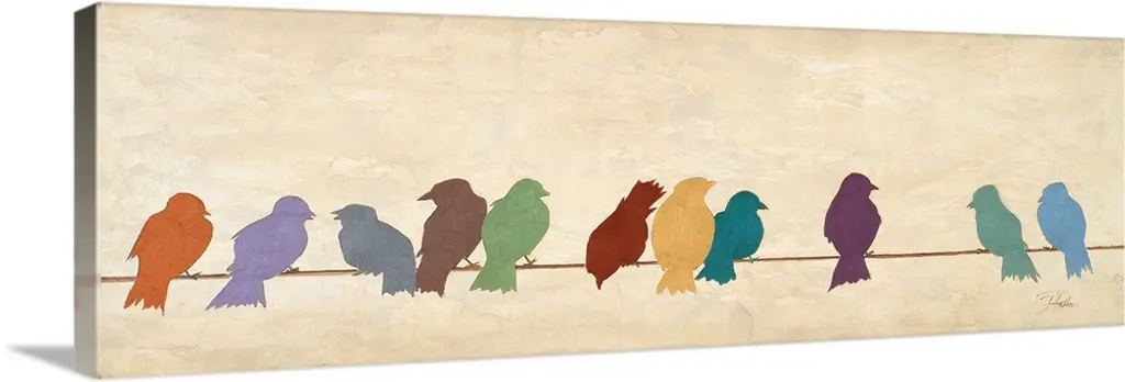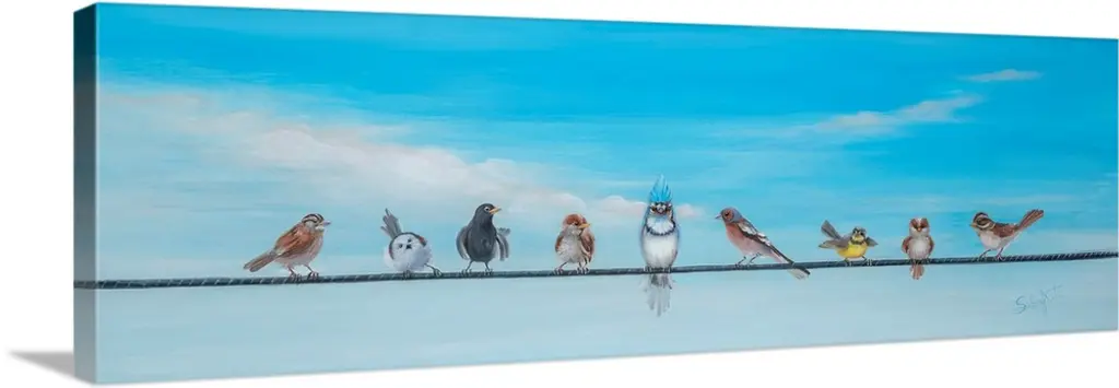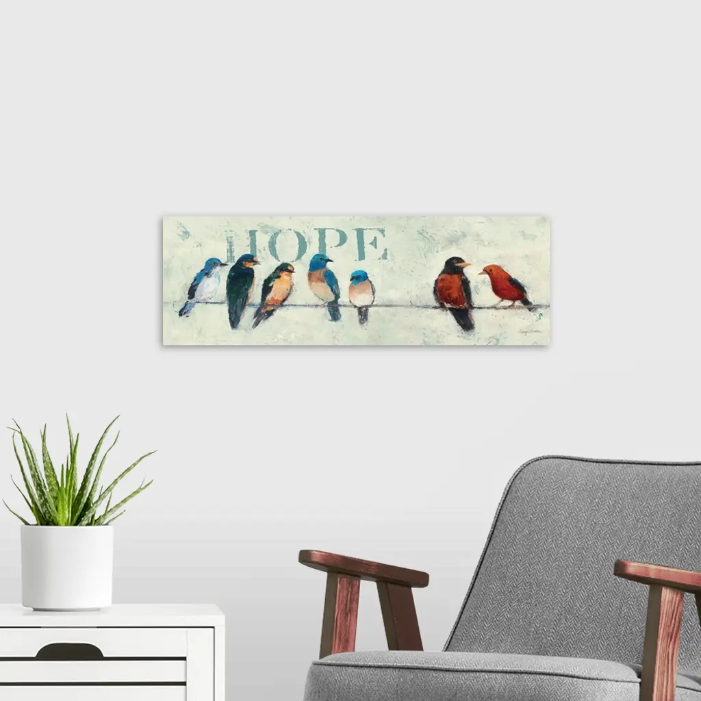 Contemporary artwork of garden birds perched on a wire, with the word "Hope" in the background.
