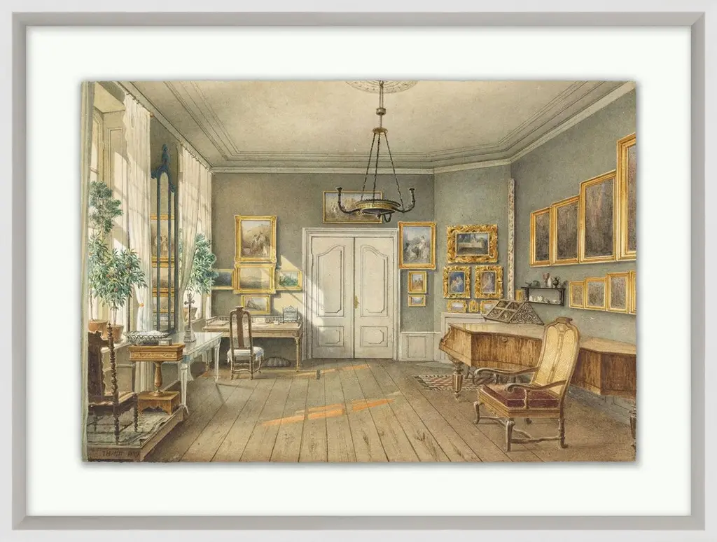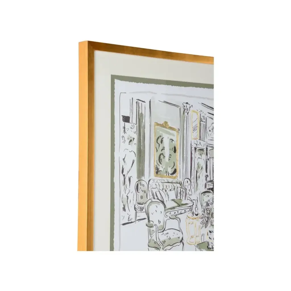 Hand Embellished Giclee print on Fine Art paper with deckled edge. Artwork floating on green mat with Gold Box frame.