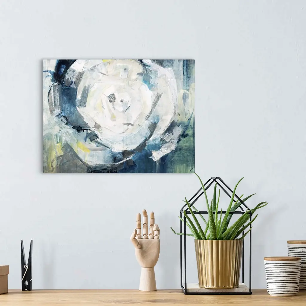 Contemporary abstract painting in shades of blue and gold, swirling around a white center.