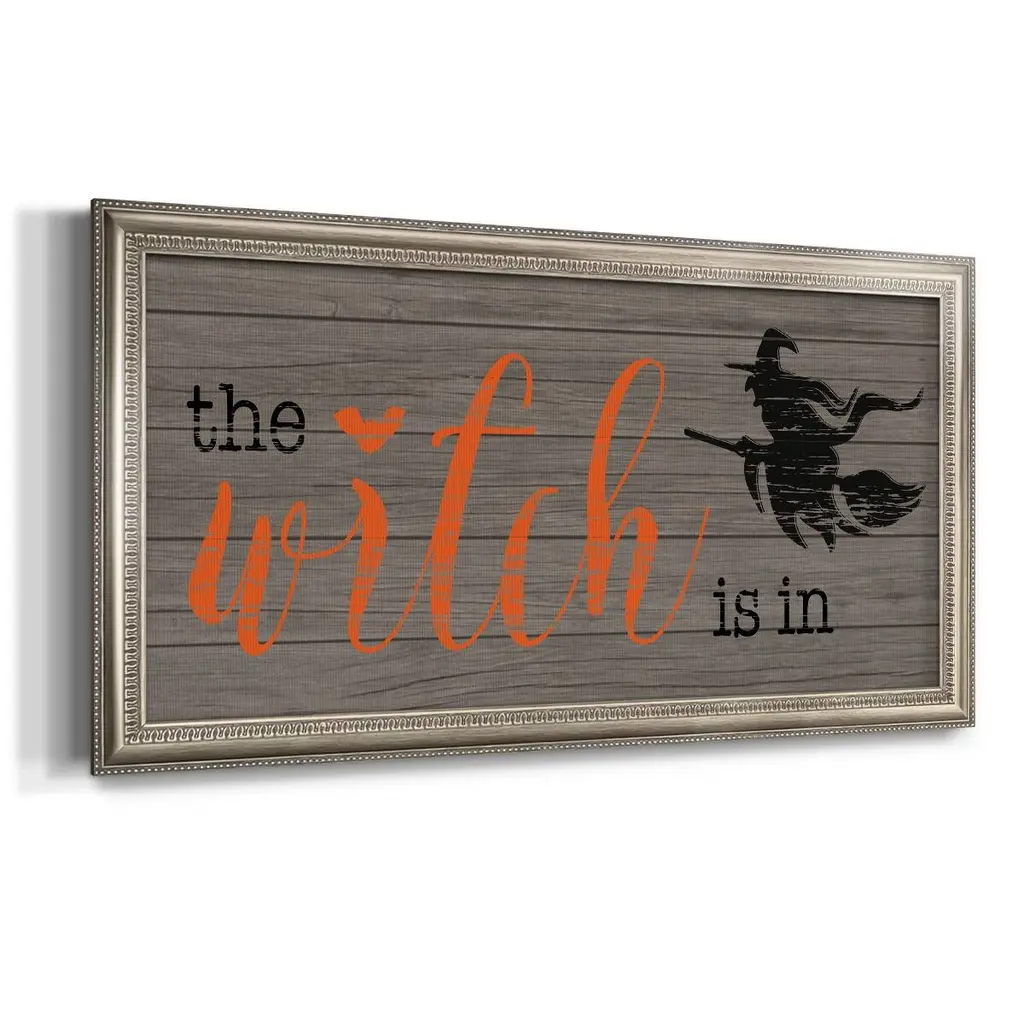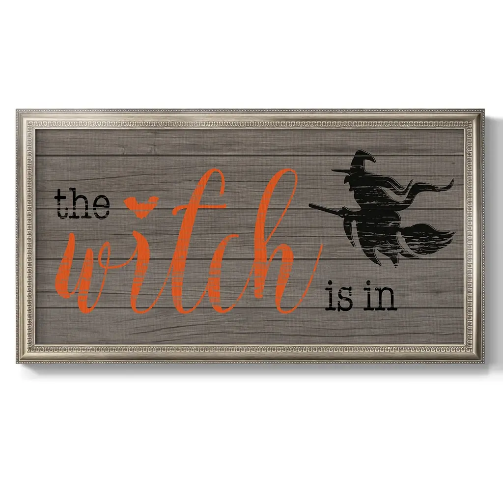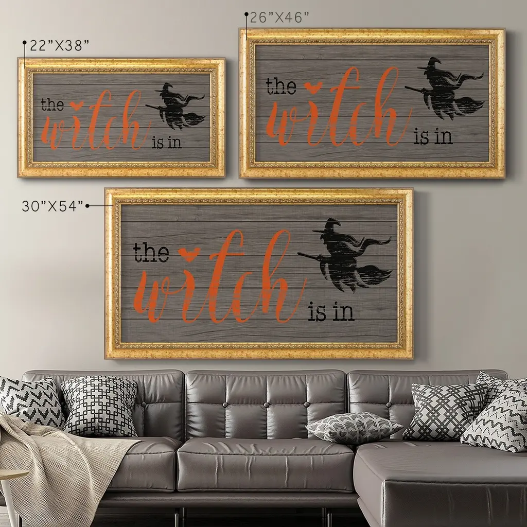 The Witch Is In Premium Framed Canvas- Ready to Hang A Premium Framed Canvas created to last. Framed in distressed wood and available in an array of sizes and colors Featuring a beveled a solid wood stretcher bar, each piece comes ready to hand 3 SIZES AVAILABLE 21''X37'' - Overall Size 25''X45'' - Overall Size 29''x53'' - Overall Size Each piece is made to order. Each piece comes with hanging hardware. Made in the USA Ready to Hang Giclee Paper Print Acrylic Glass Beveled Matt Board