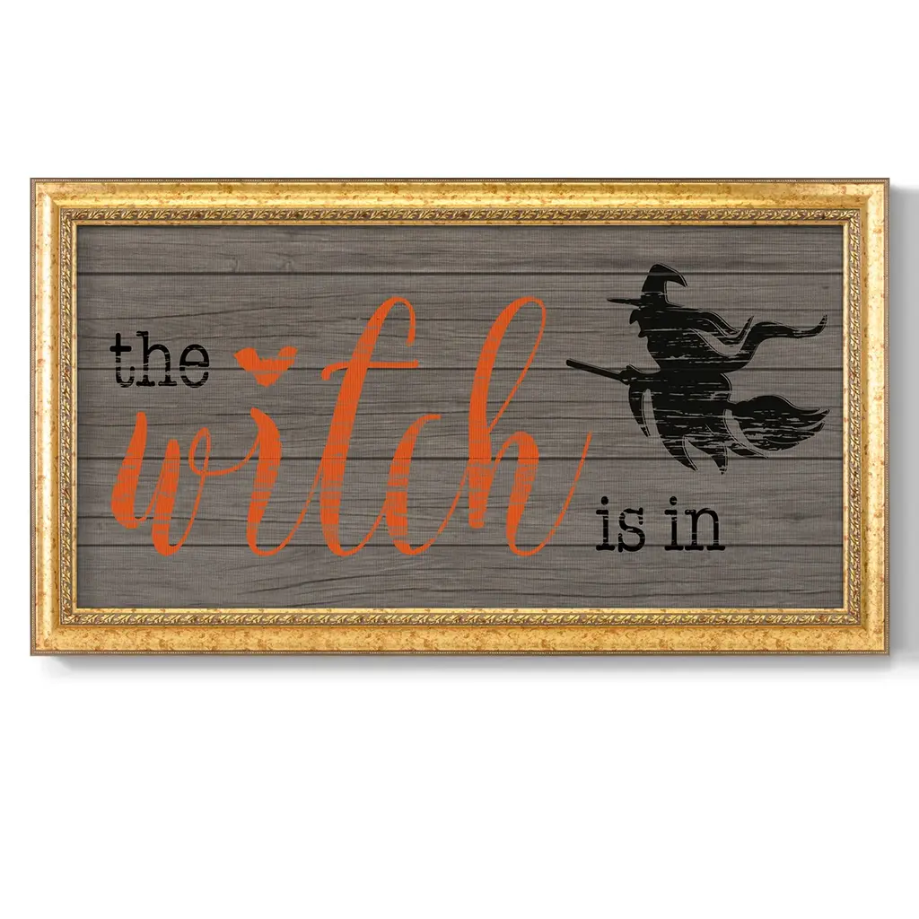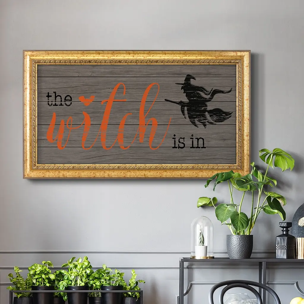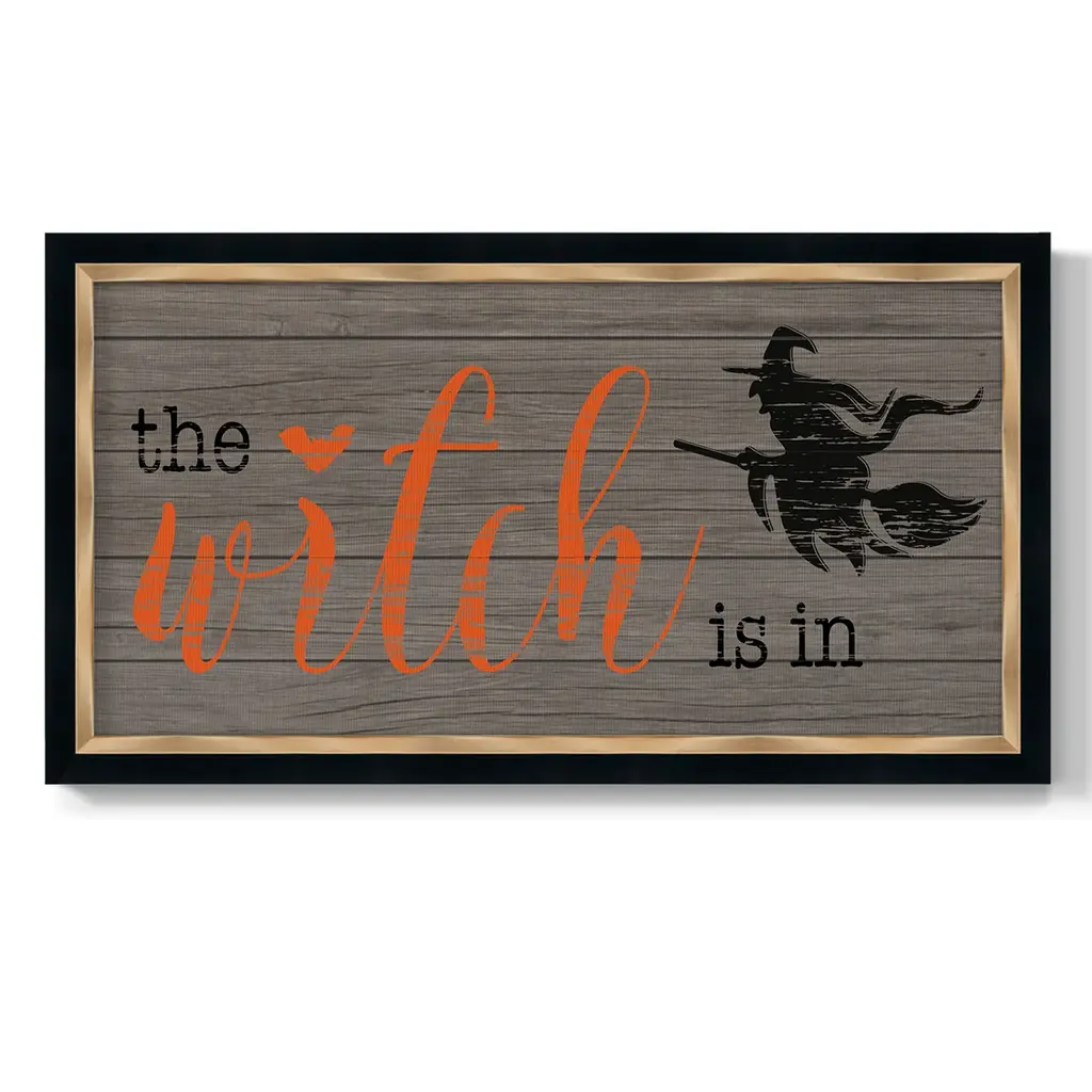 The Witch Is In Premium Framed Canvas- Ready to Hang A Premium Framed Canvas created to last. Framed in distressed wood and available in an array of sizes and colors Featuring a beveled a solid wood stretcher bar, each piece comes ready to hand 3 SIZES AVAILABLE 21''X37'' - Overall Size 25''X45'' - Overall Size 29''x53'' - Overall Size Each piece is made to order. Each piece comes with hanging hardware. Made in the USA Ready to Hang Giclee Paper Print Acrylic Glass Beveled Matt Board