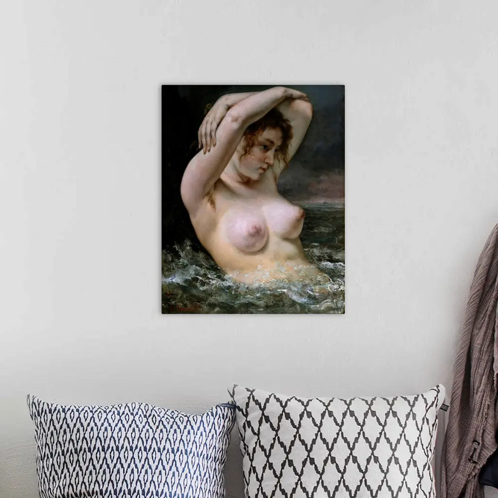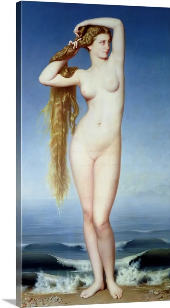Between 1864 and 1868 Courbet undertook a series of paintings of the female nude. He could not have failed to witness the triumph of Alexandre Cabanel's?Birth of Venus?(Musee d'Orsay, Paris) at the Salon of 1863, along with the popularity of similar representations by Cabanel's fellow academicians. Here, Courbet evokes the myth of Venus, the goddess born of the sea, but slyly subverts convention by depicting the model's underarm hair-an element of realism amplified by the almost palpable quality of her flesh.