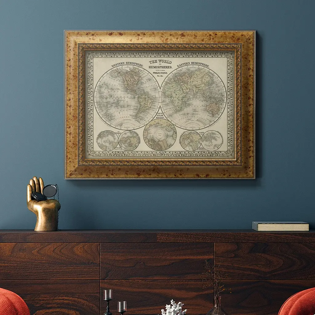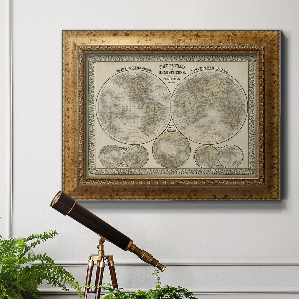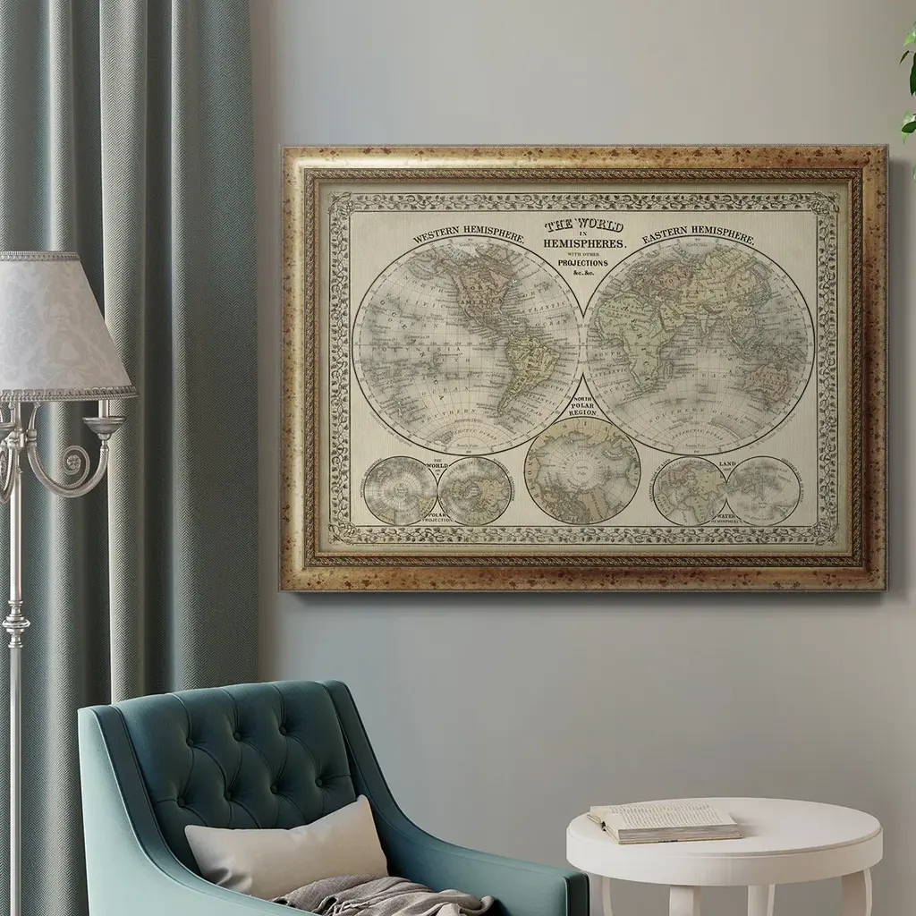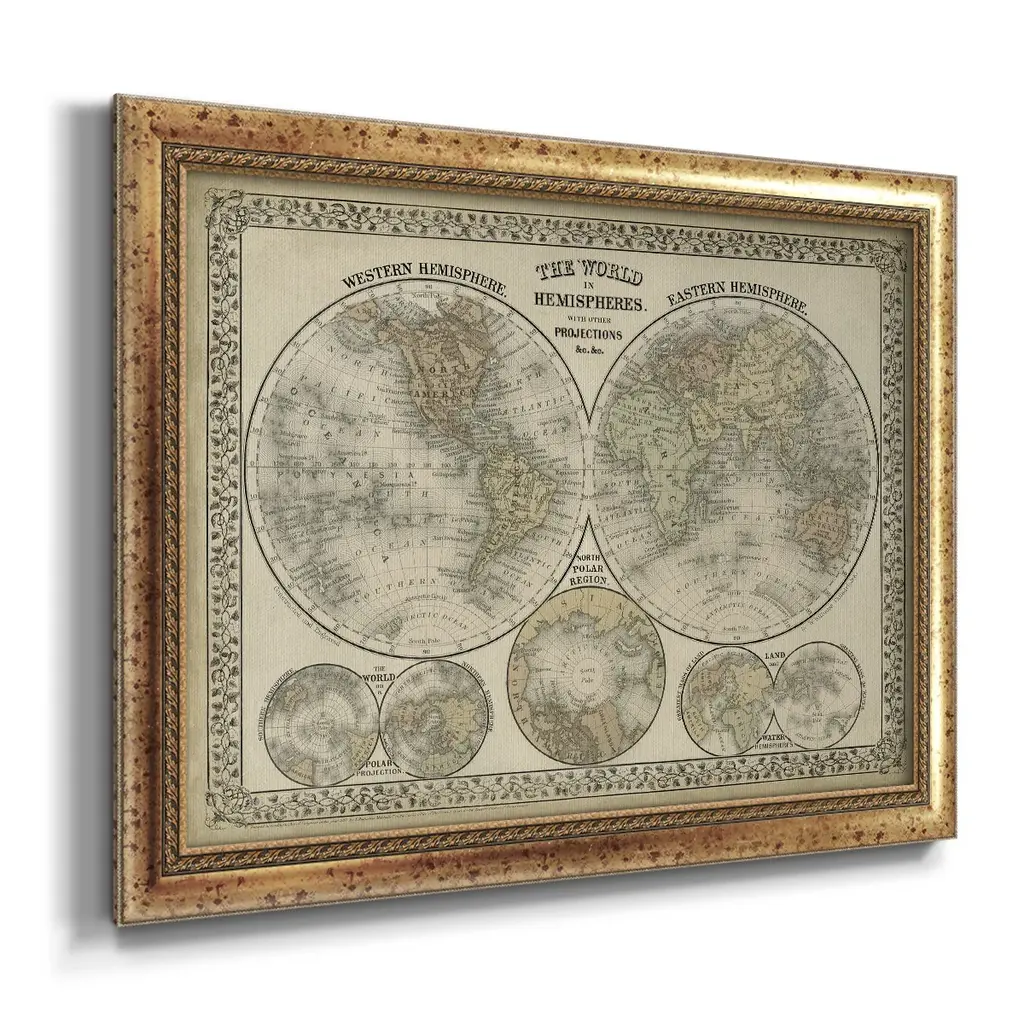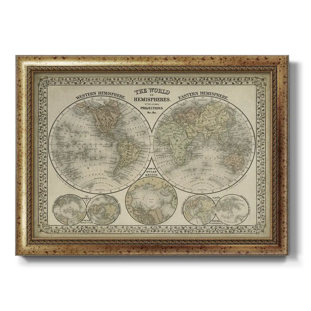 The World in Hemispheres Premium Framed Canvas- Ready to Hang A Premium Framed Canvas created to last. Framed in distressed wood and available in an array of sizes and colors Featuring a beveled a solid wood stretcher bar, each piece comes ready to hand 3 SIZES AVAILABLE 16''X20'' - Overall Size 18'X27'' - Overall Size 24''x36'' - Overall Size Each piece is made to order. Each piece comes with hanging hardware. Made in the USA Ready to Hang Giclee Paper Print Acrylic Glass Beveled Matt Board