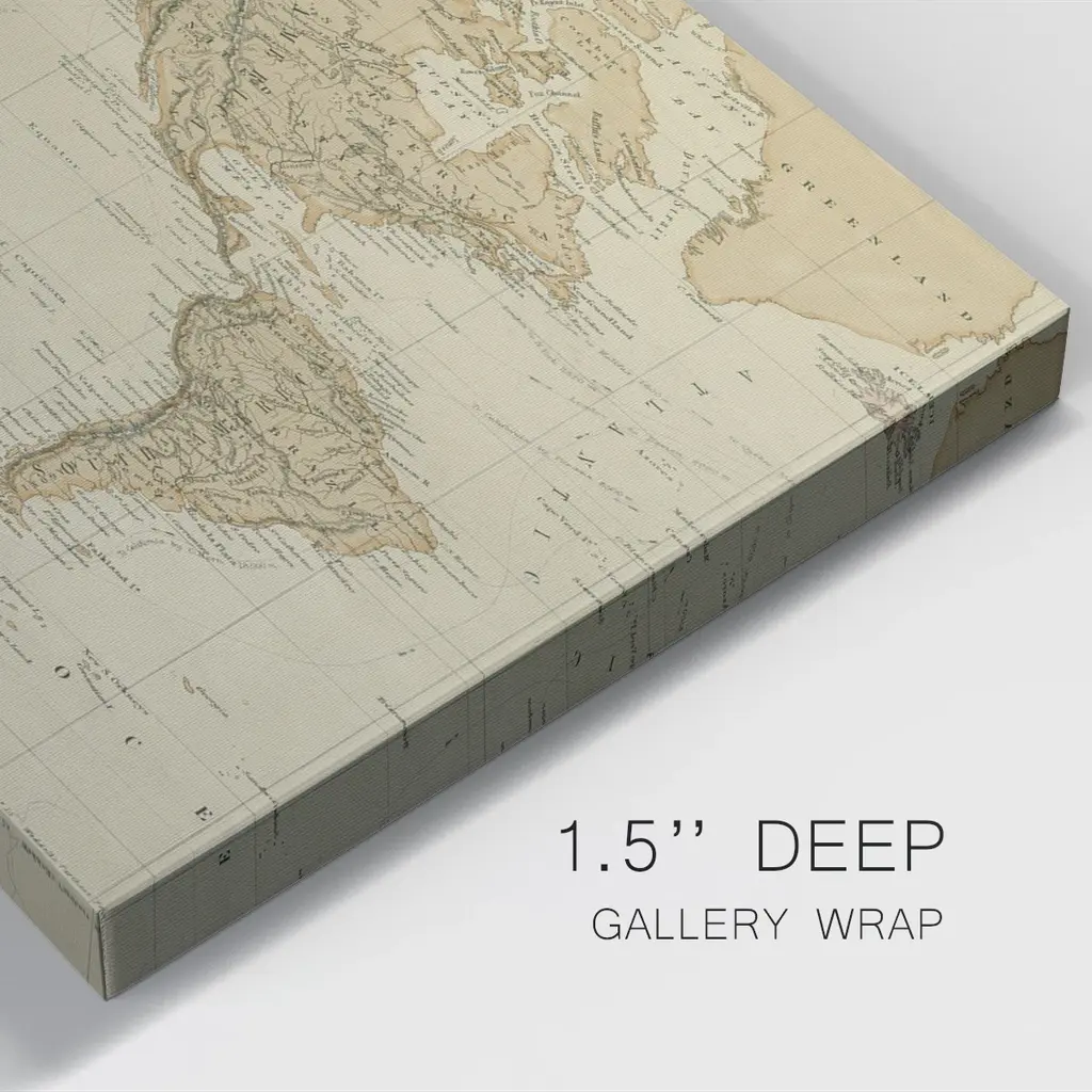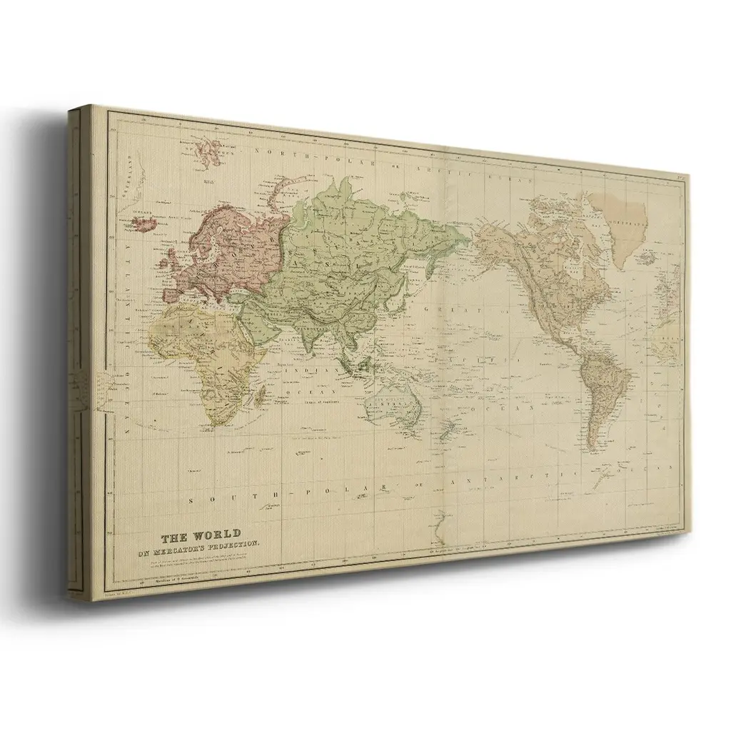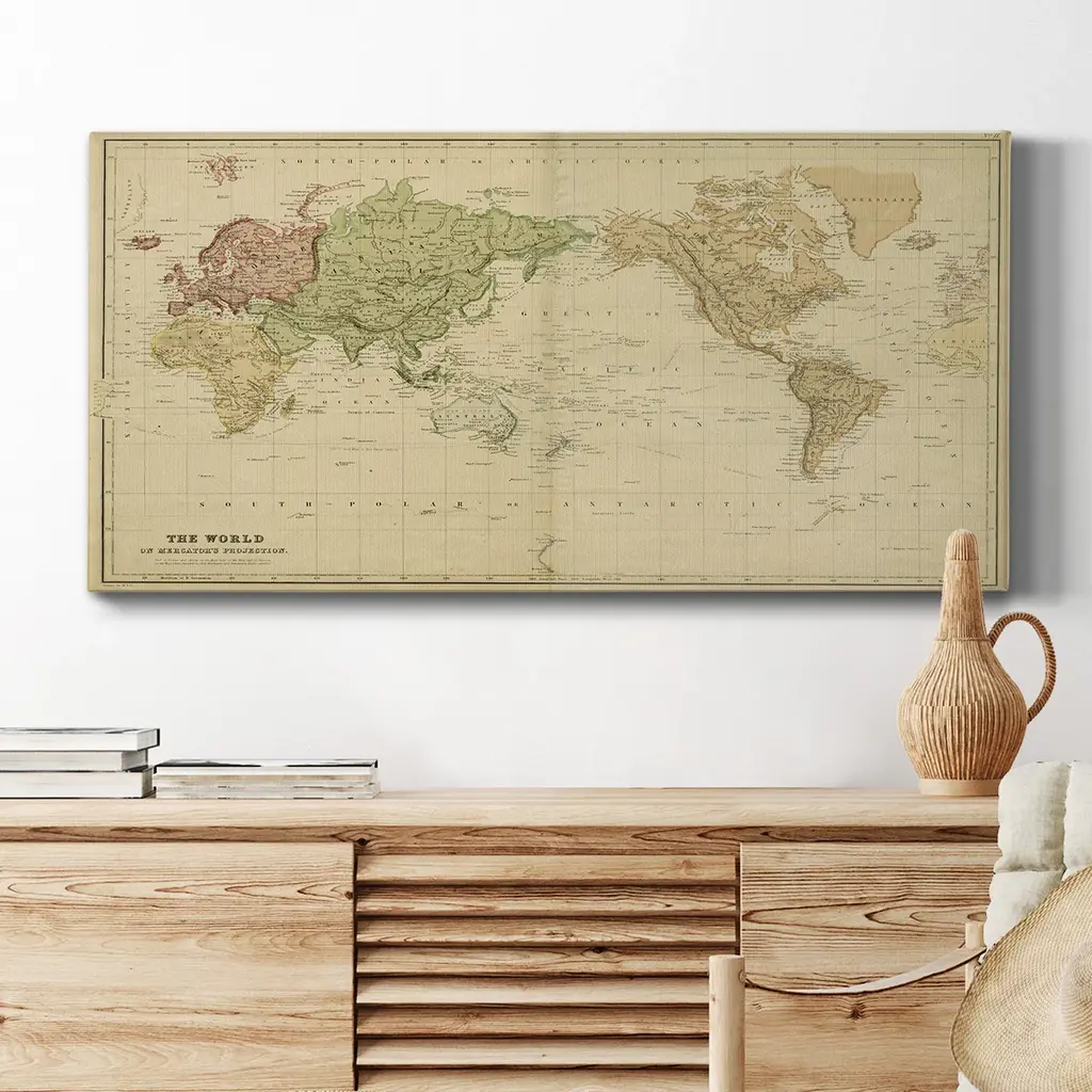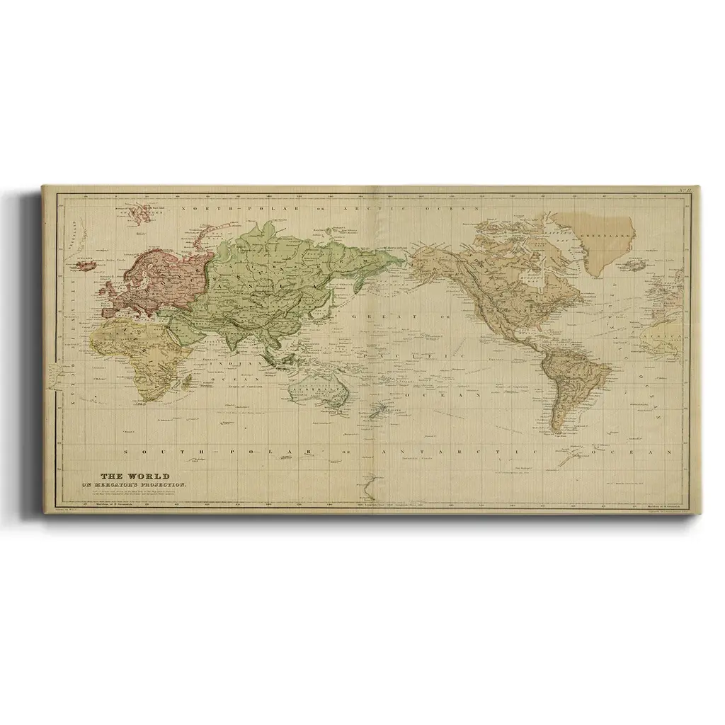 The World on Mercators Projection K- Premium Gallery Wrapped Canvas - Ready to Hang A premium hand stretched gallery wrapped canvas print created to last. Featuring a beveled a solid wood stretcher bar, each piece comes ready to hand 3 SIZES AVAILABLE 8''X16'' - Overall Size 12"X24'' - Overall Size 20''x40'' - Overall Size Each piece is made to order. Built to Last Each piece comes ready to hang Solid wood stretcher Fade and Water resistant Made domestically