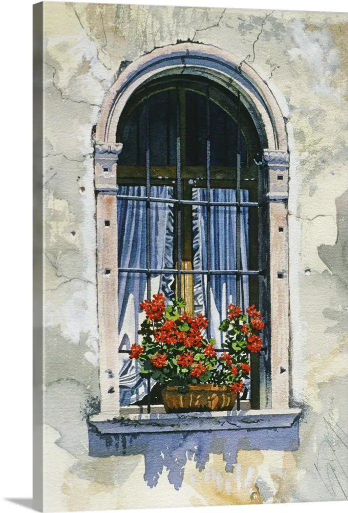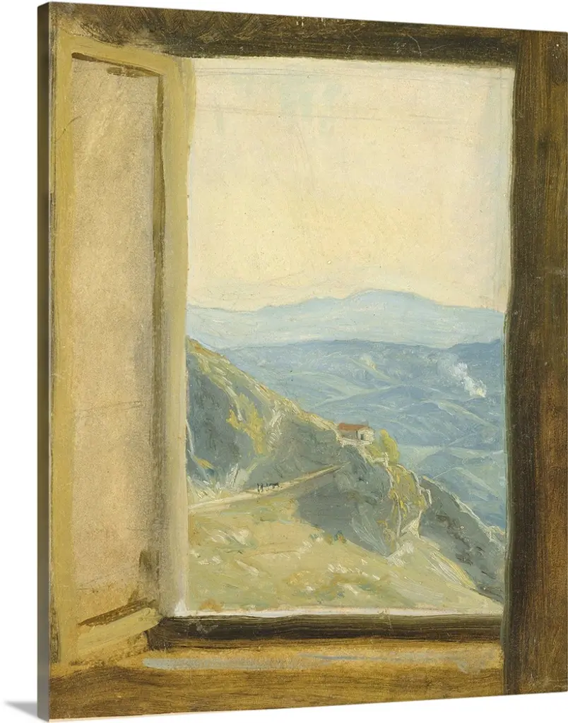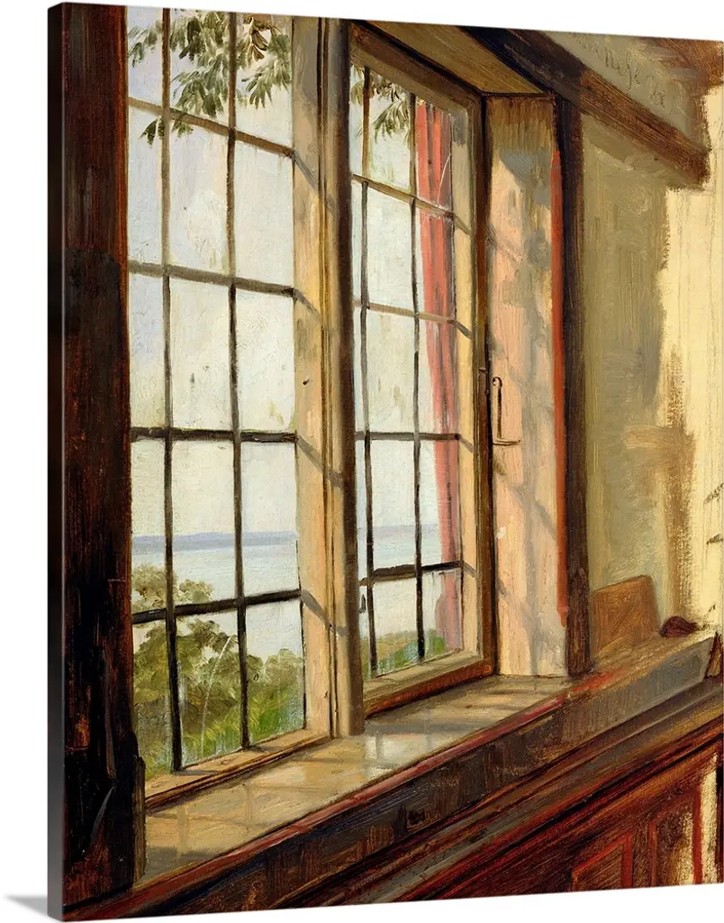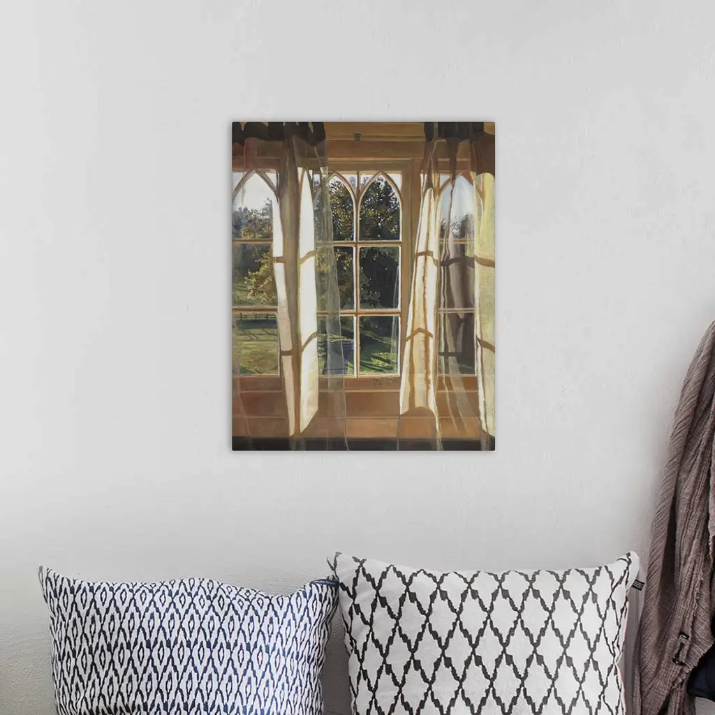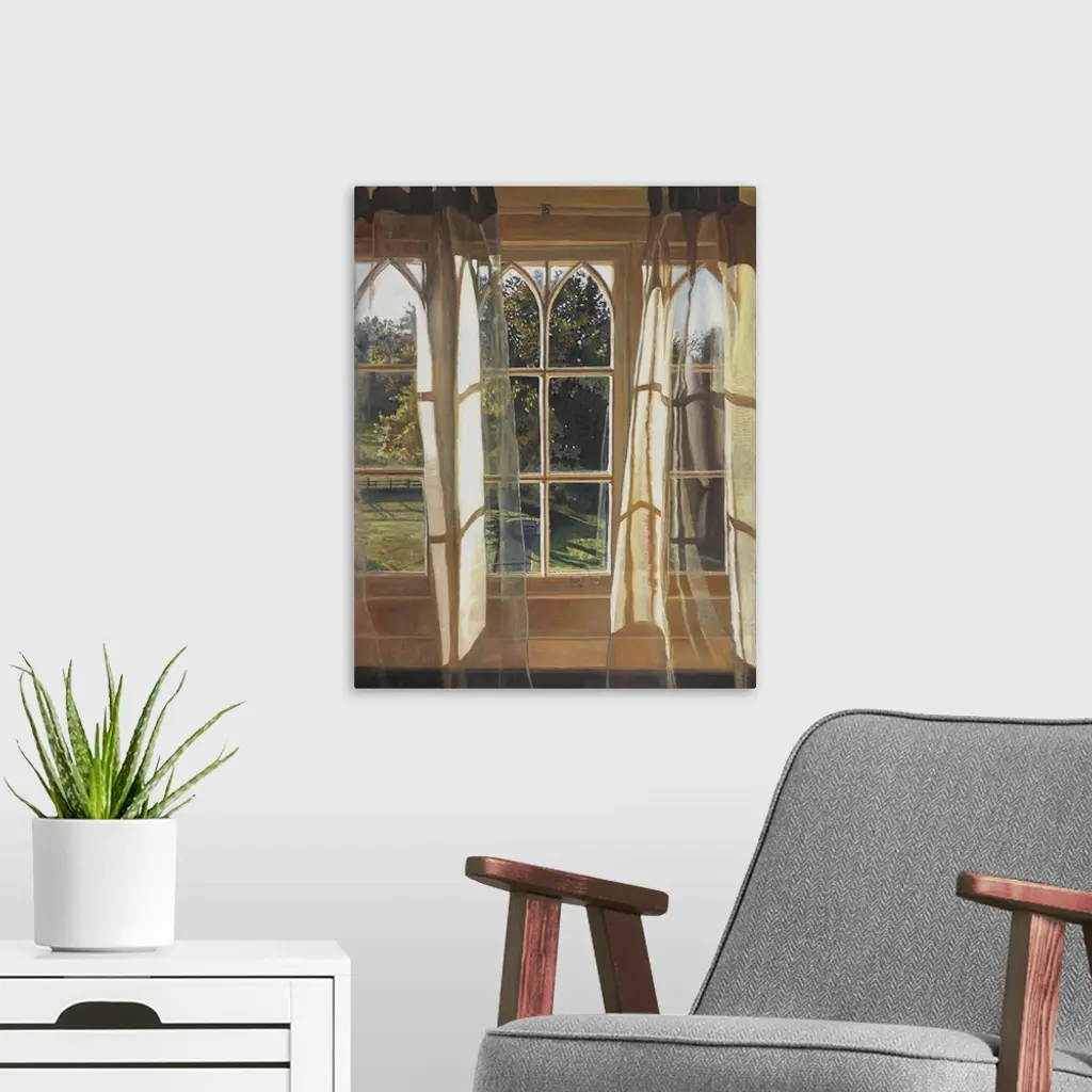 Contemporary painting looking out the windows from inside a house.